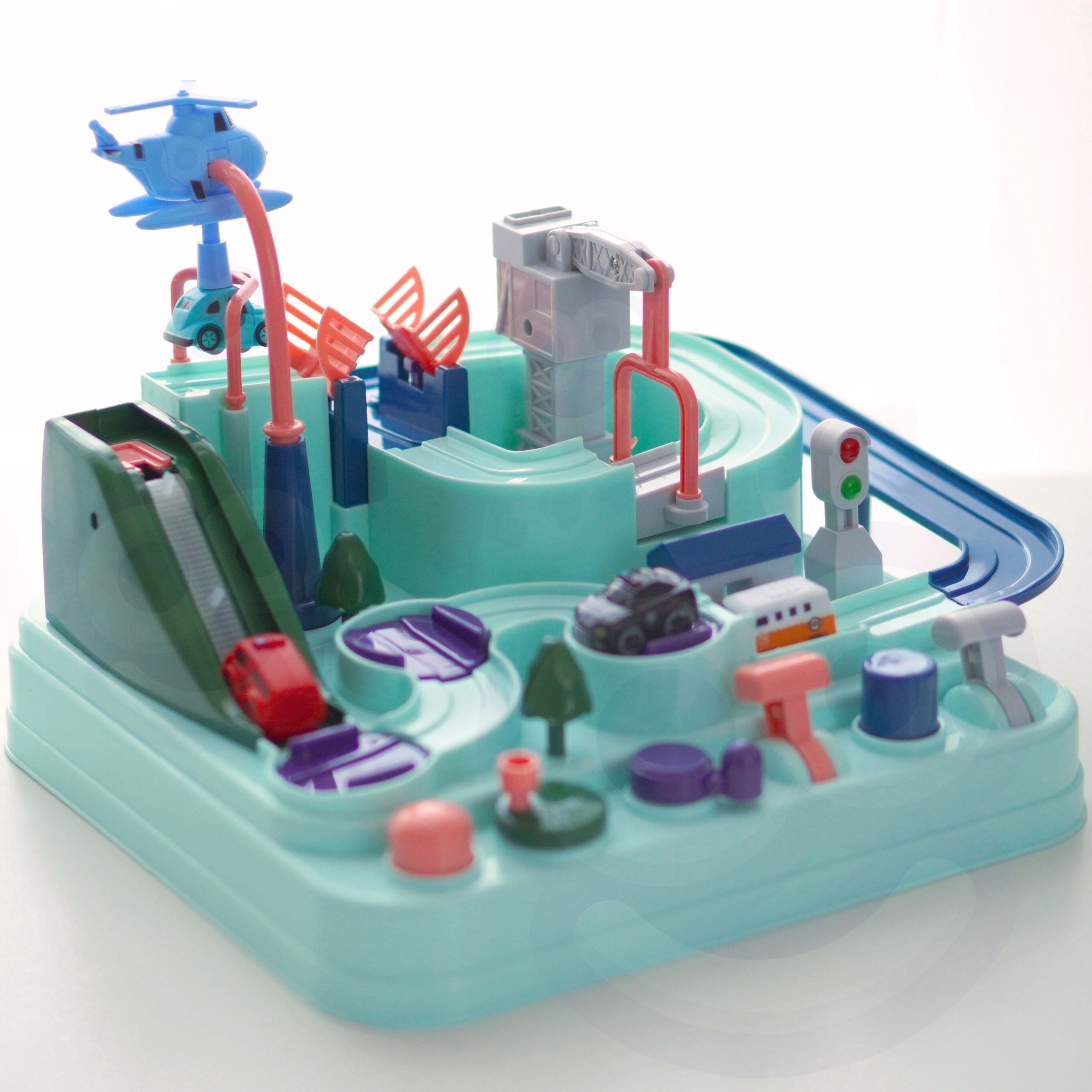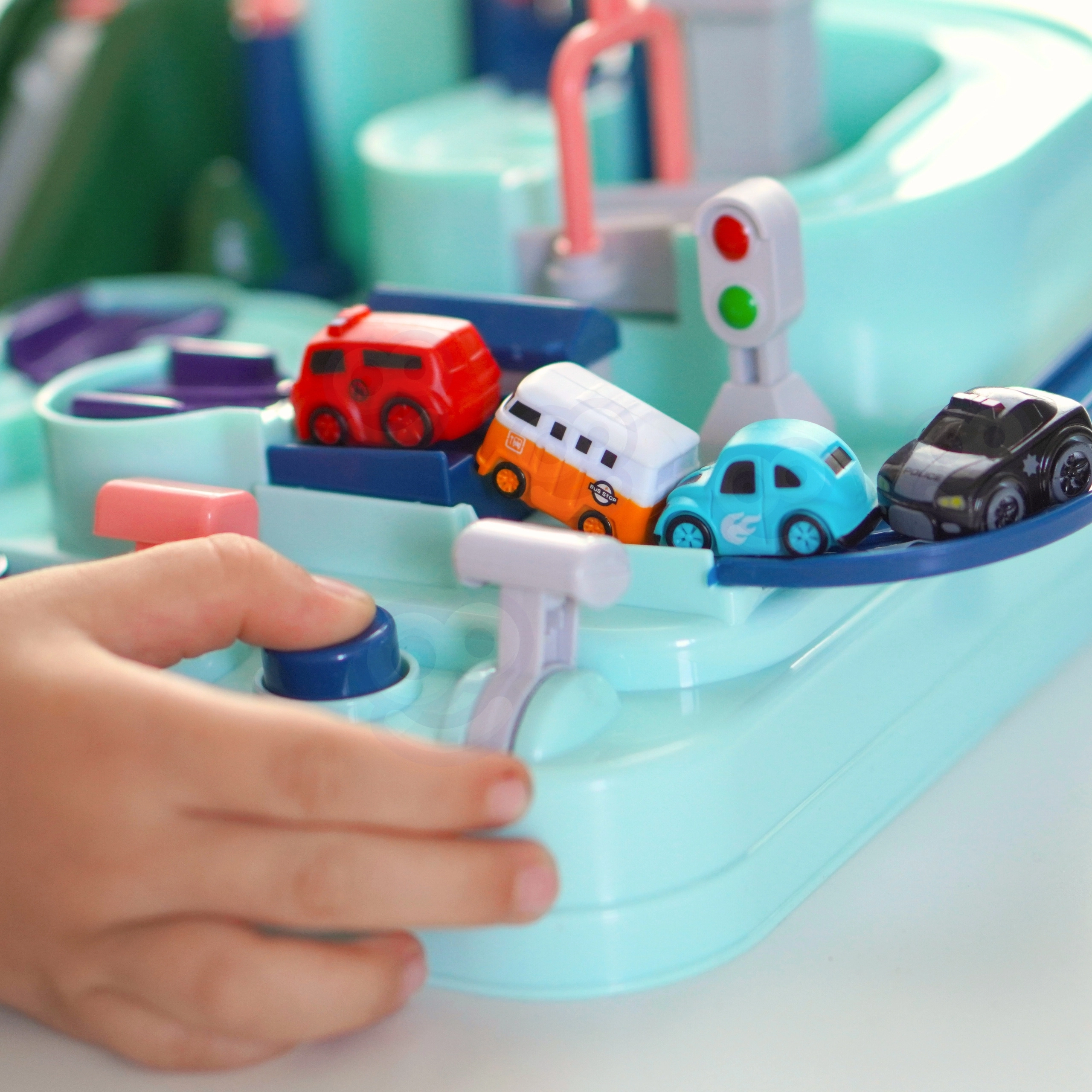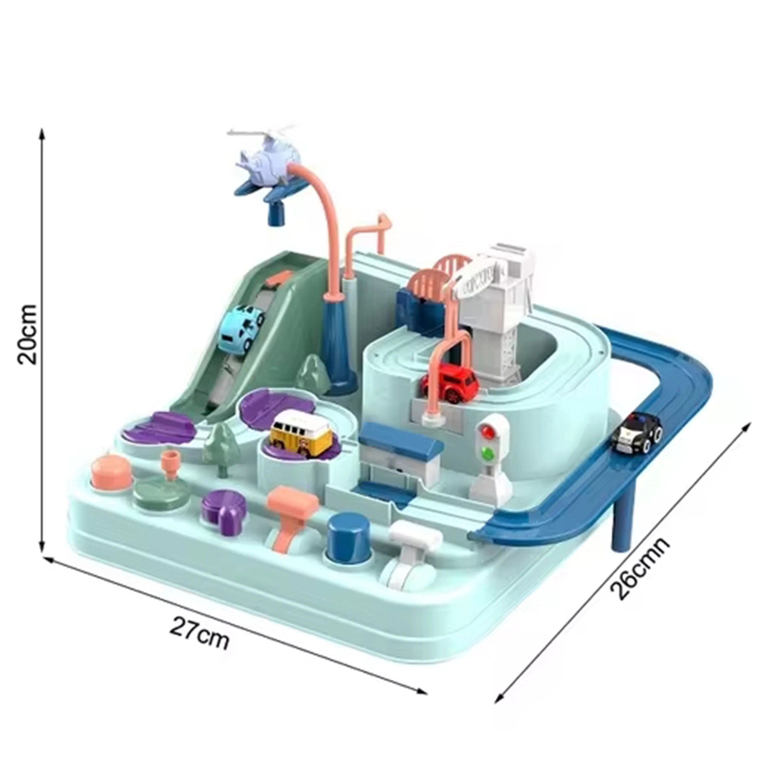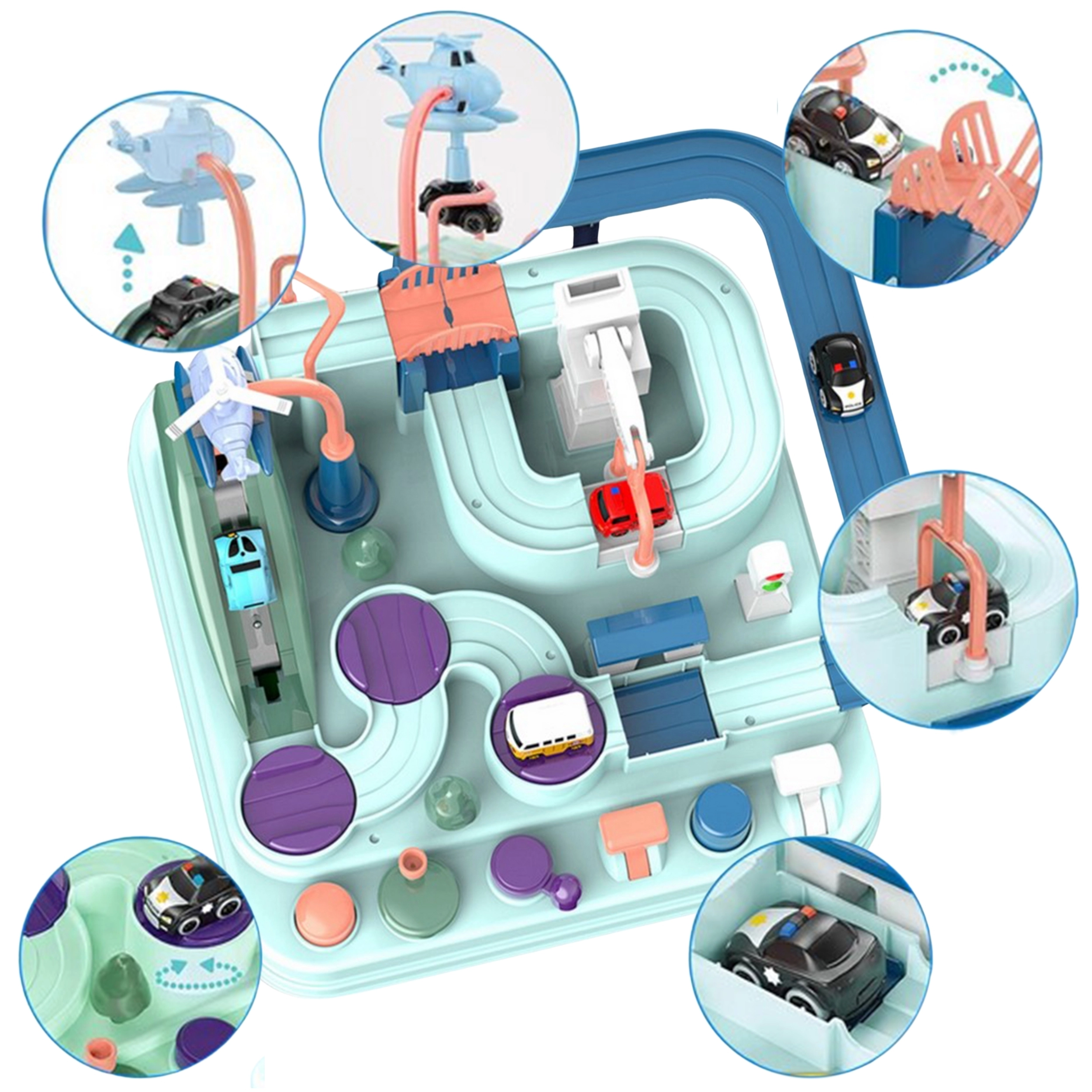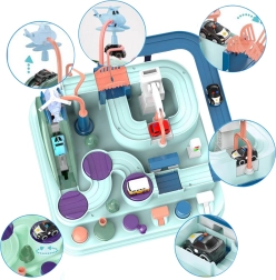Στο σετ περιλαμβάνονται τρία μικρά αυτοκίνητα, τα οποία μπορούν ελεύθερα να εξερευνήσουν την πίστα σύμφωνα με τη φαντασία του μικρού παίκτη. Τα οχήματα εμπλουτίζουν το παιχνίδι ή δίνουν τη δυνατότητα στα παιδιά να αγωνιστούν στην πίστα. Η διαδρομή μπορεί να φαίνεται εύκολη, αλλά πολυάριθμα στοιχεία όπως οι μηχανισμοί μετάδοσης ή οι γέφυρες-καταπέλτες εξασφαλίζουν ότι το ταξίδι γίνεται γεμάτο αδρεναλίνη.