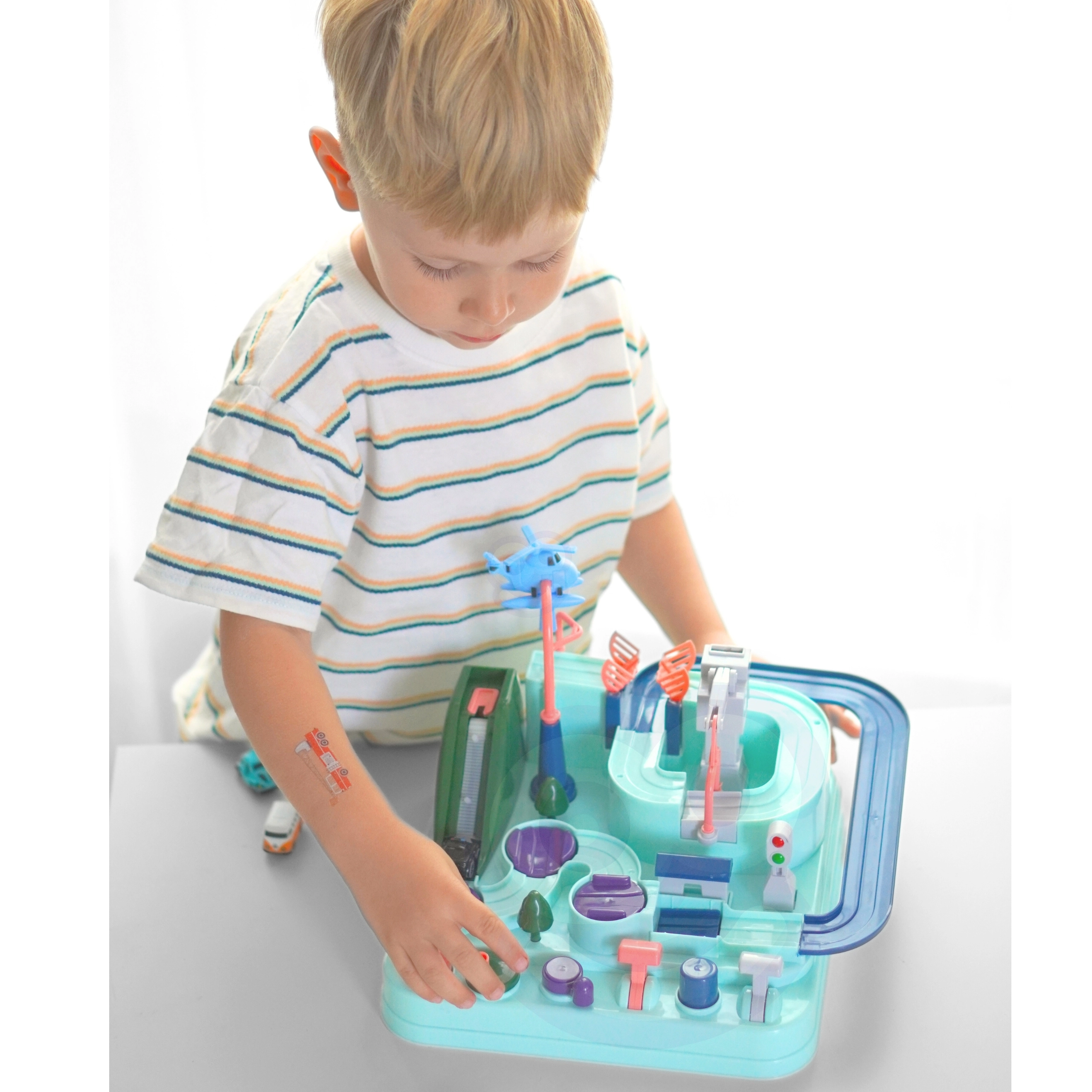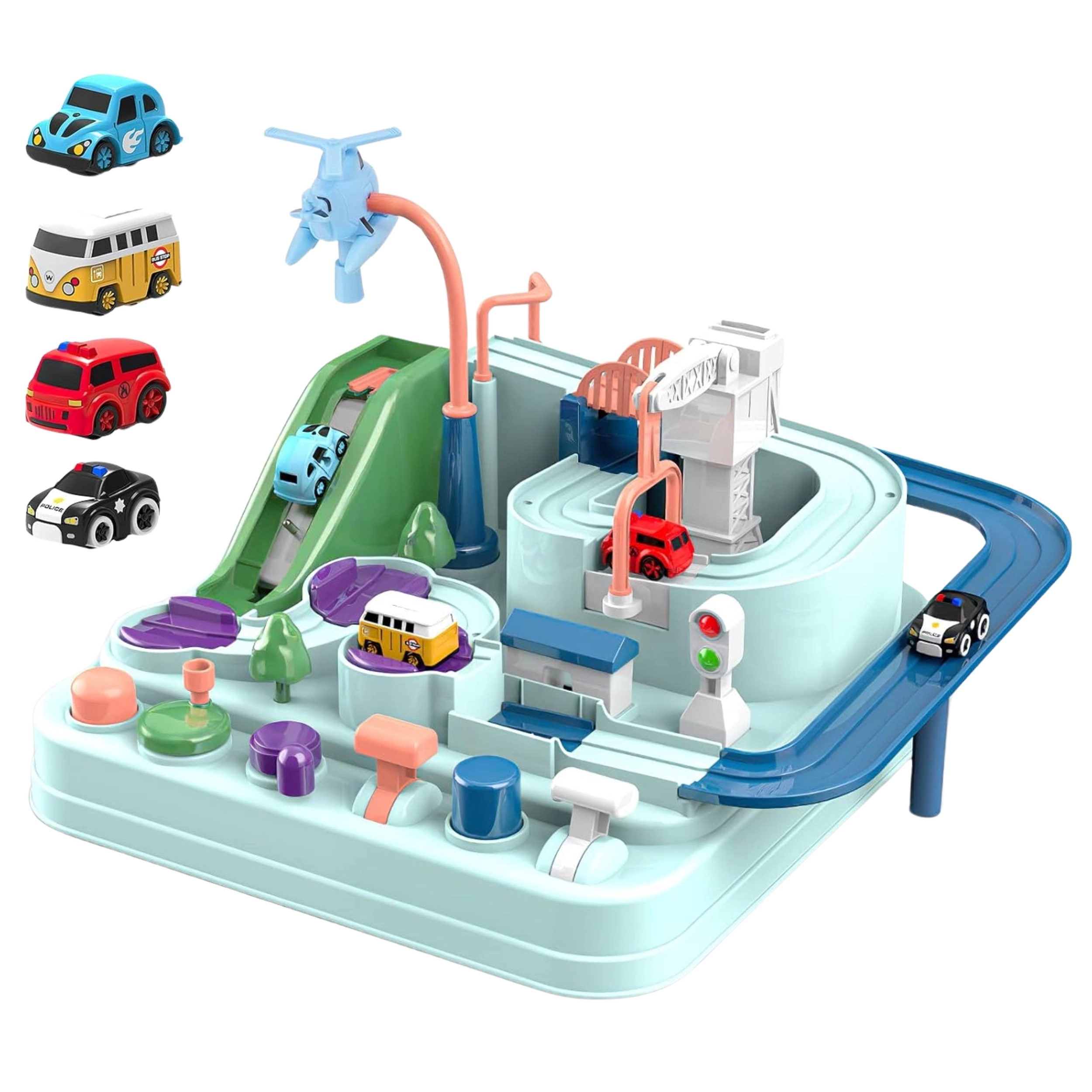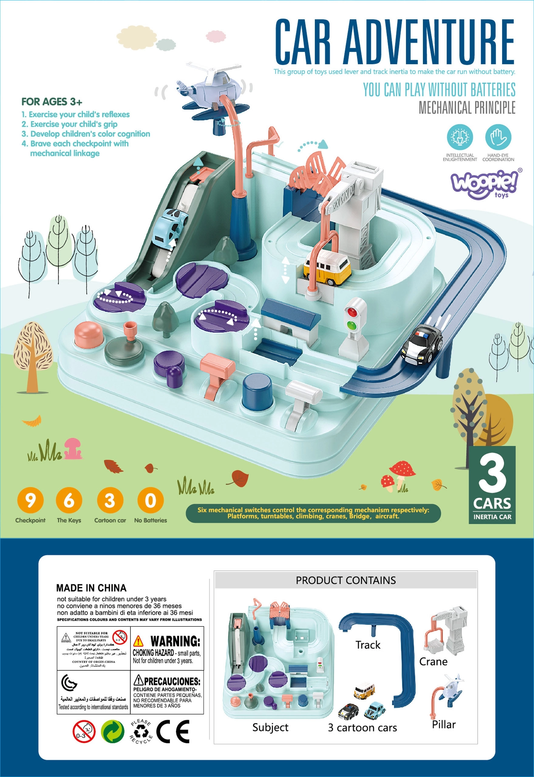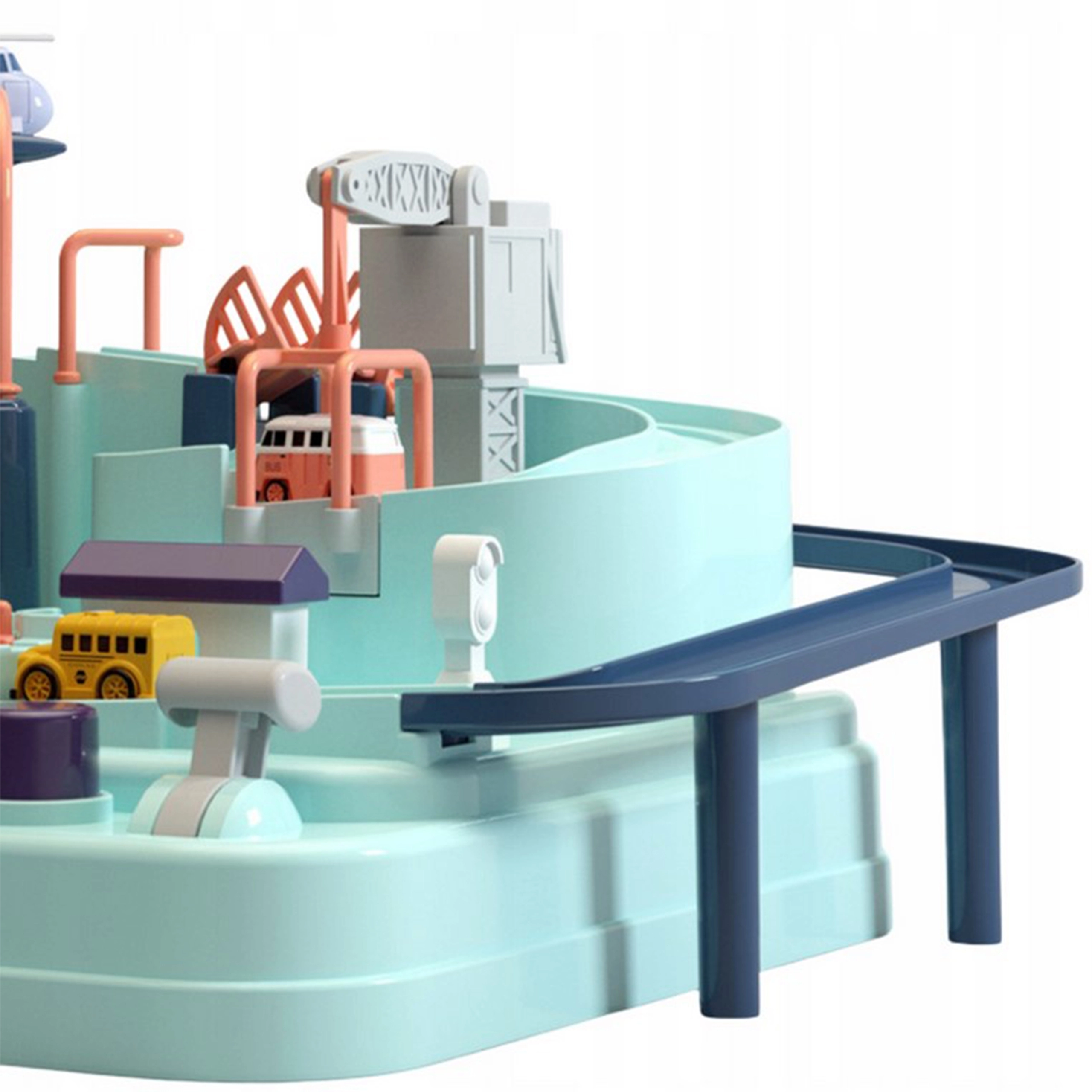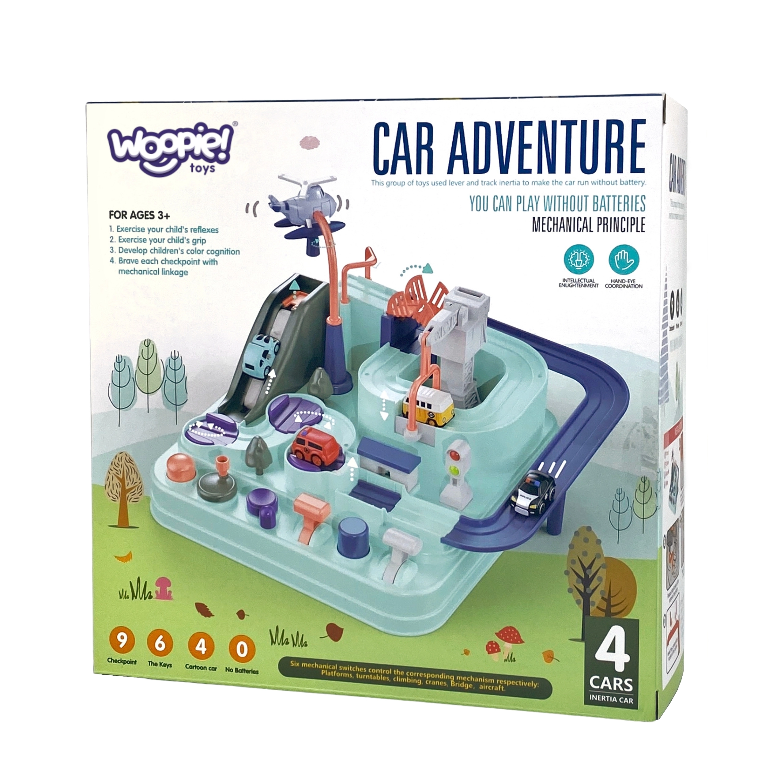 Στο σετ περιλαμβάνονται τρία μικρά αυτοκίνητα, τα οποία μπορούν ελεύθερα να εξερευνήσουν την πίστα σύμφωνα με τη φαντασία του μικρού παίκτη. Τα οχήματα εμπλουτίζουν το παιχνίδι ή δίνουν τη δυνατότητα στα παιδιά να αγωνιστούν στην πίστα. Η διαδρομή μπορεί να φαίνεται εύκολη, αλλά πολυάριθμα στοιχεία όπως οι μηχανισμοί μετάδοσης ή οι γέφυρες-καταπέλτες εξασφαλίζουν ότι το ταξίδι γίνεται γεμάτο αδρεναλίνη.