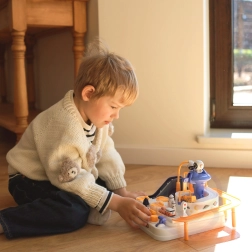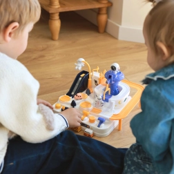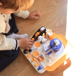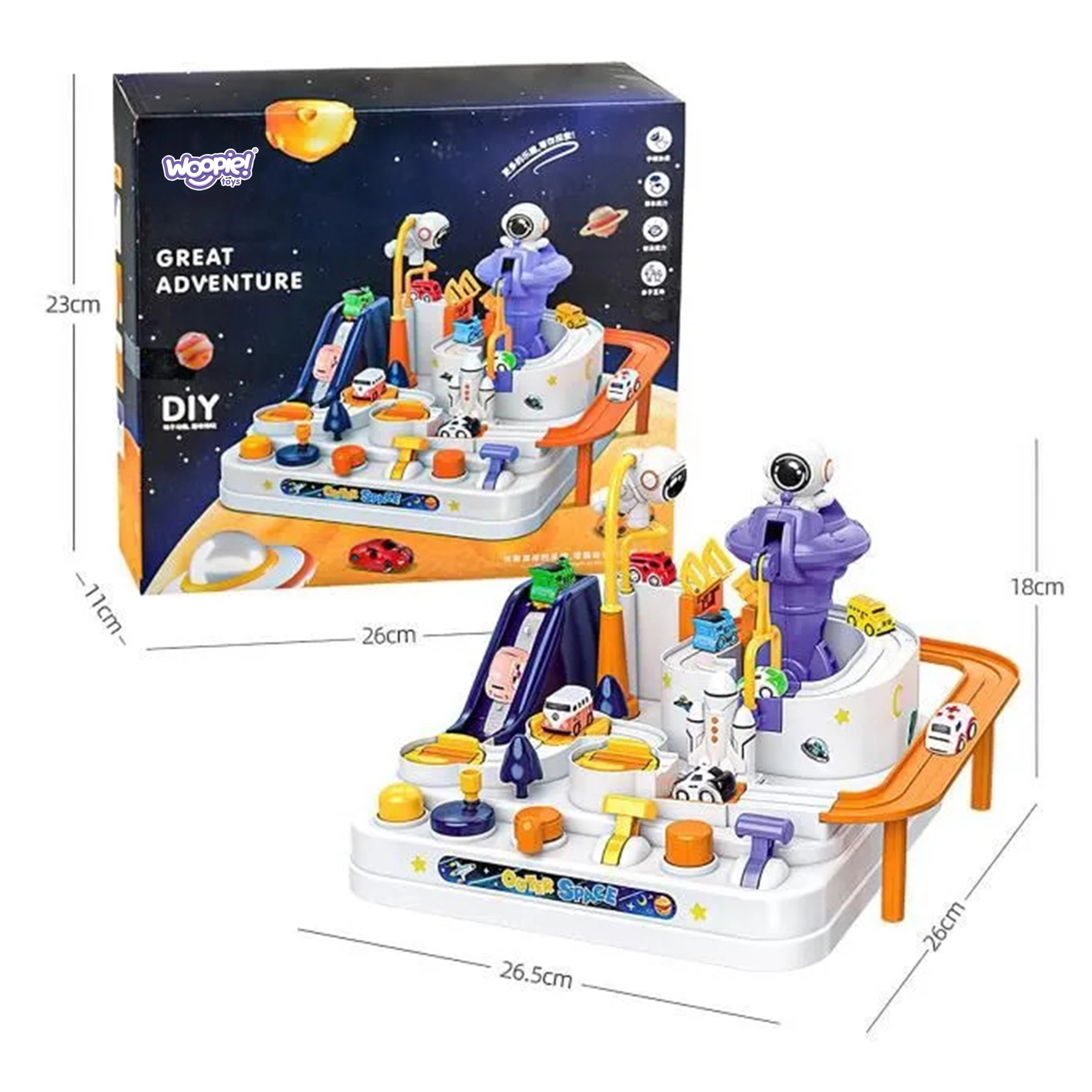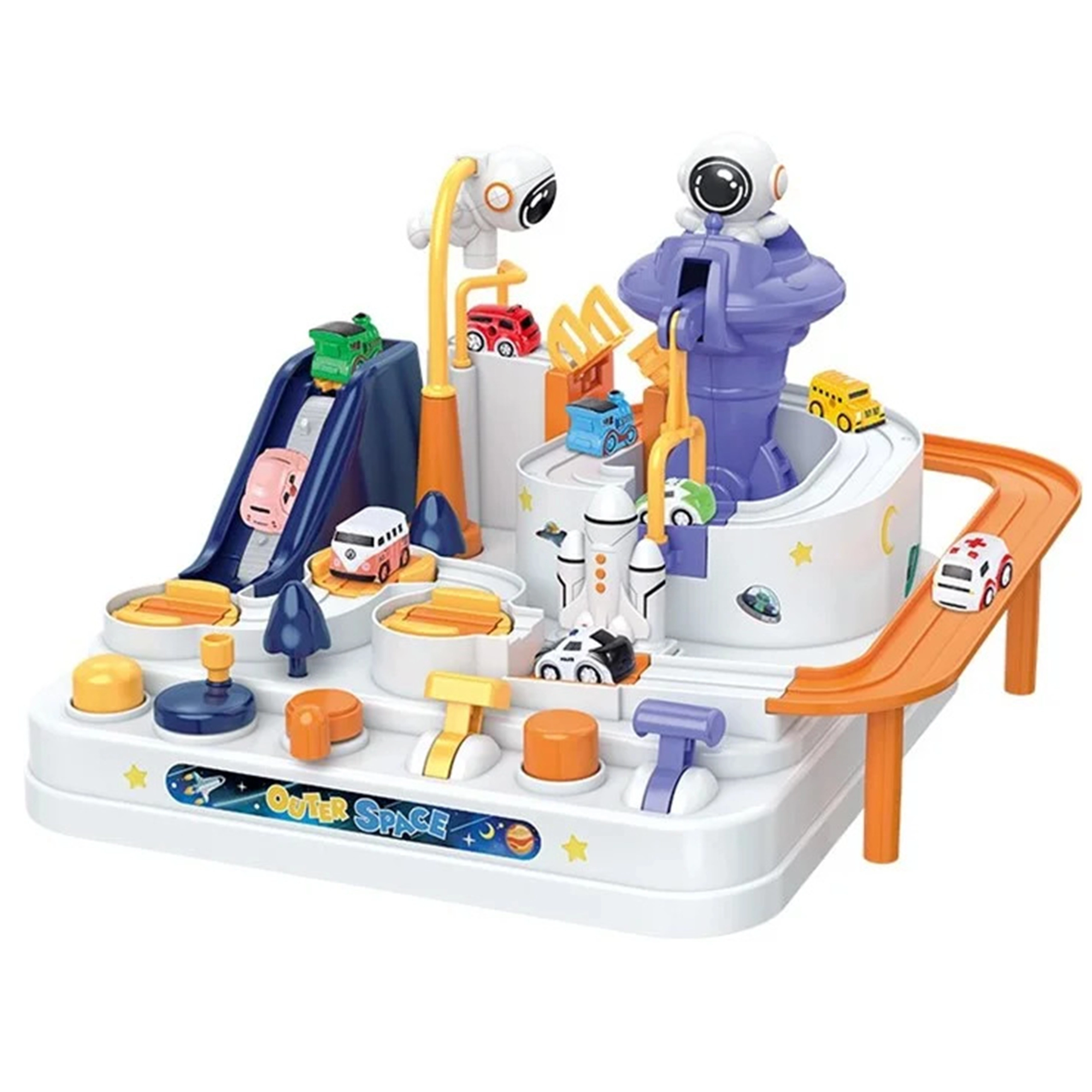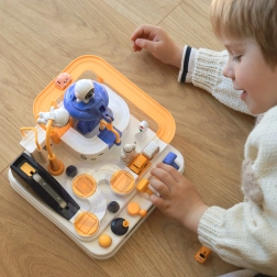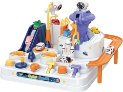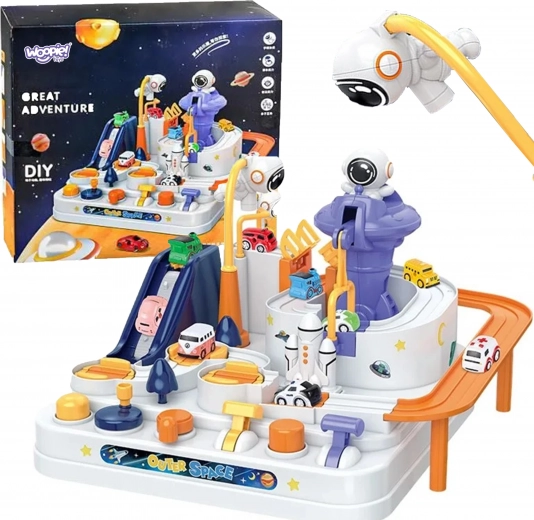 Ανακαλύψτε τη διασκεδαστική διαδραστική διαστημική πίστα με εμπόδια, όπου τα παιδιά χειρίζονται κουμπιά και μοχλούς, ενεργοποιούν ανελκυστήρες, ανασηκώνουν γέφυρες και με τη βοήθεια μαγνητικού πυραύλου μετακινούν τα αυτοκινητάκια. Χωρίς μπαταρίες, γεμάτη κινούμενα στοιχεία, ενισχύει τη λεπτή κινητικότητα, τη λογική σκέψη και τη φαντασία. Περιλαμβάνονται 3 αυτοκινητάκια για ατομικό παιχνίδι και αγώνες.