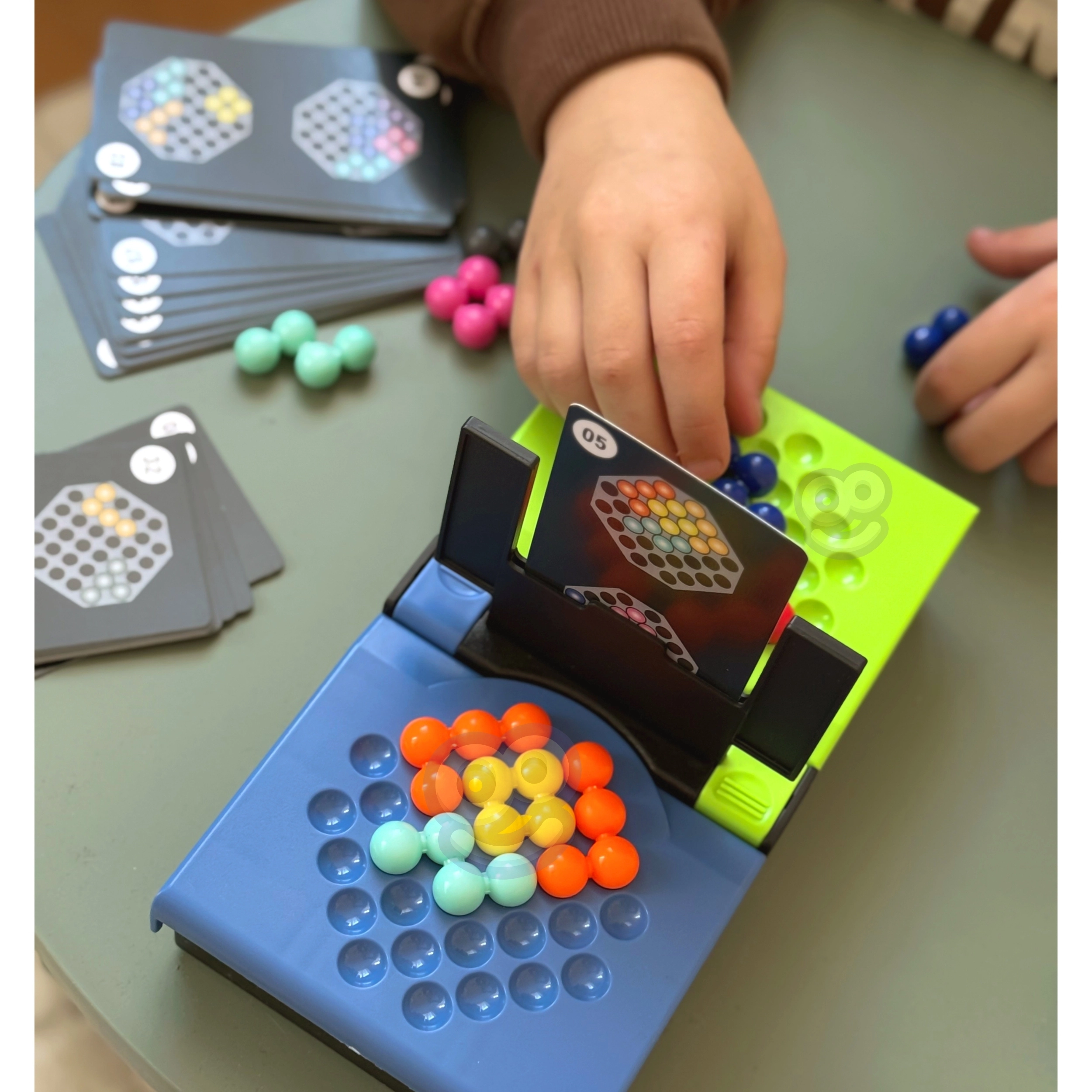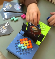 - Από τη δεξαμενή των χρωματιστών μπιλιών τους προσπαθούν όσο το δυνατόν πιο γρήγορα να συνθέσουν το μοτίβο που φαίνεται στην κάρτα μπροστά τους