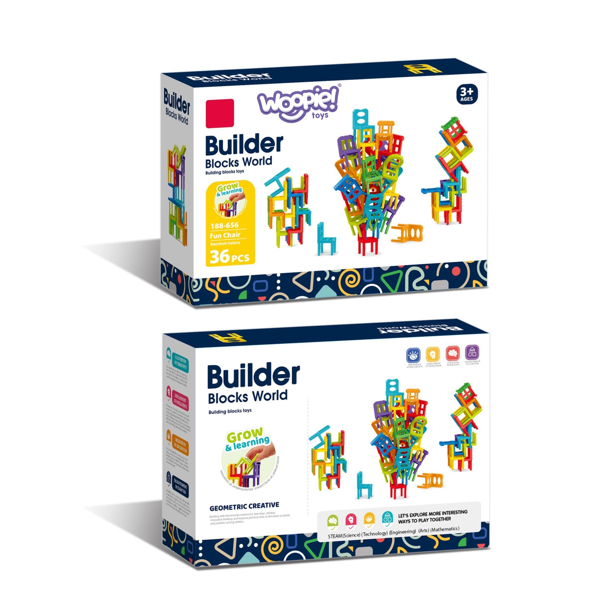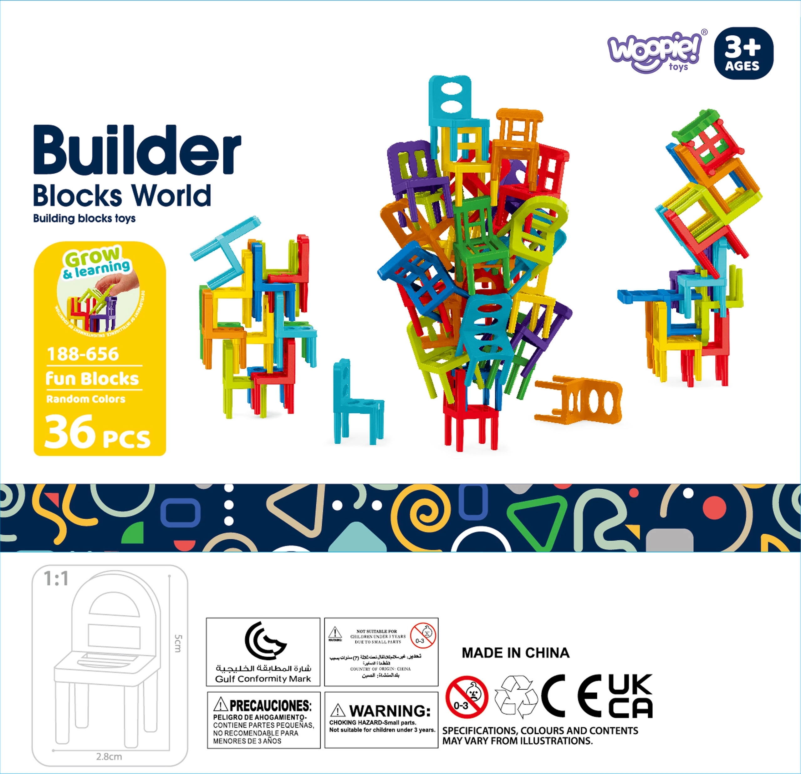 Το διασκεδαστικό σετ περιλαμβάνει 36 καρέκλες σε διάφορα σχήματα και σε επτά χρώματα: μπλε, γαλάζιο, πορτοκαλί, κίτρινο, πράσινο, μωβ και κόκκινο.