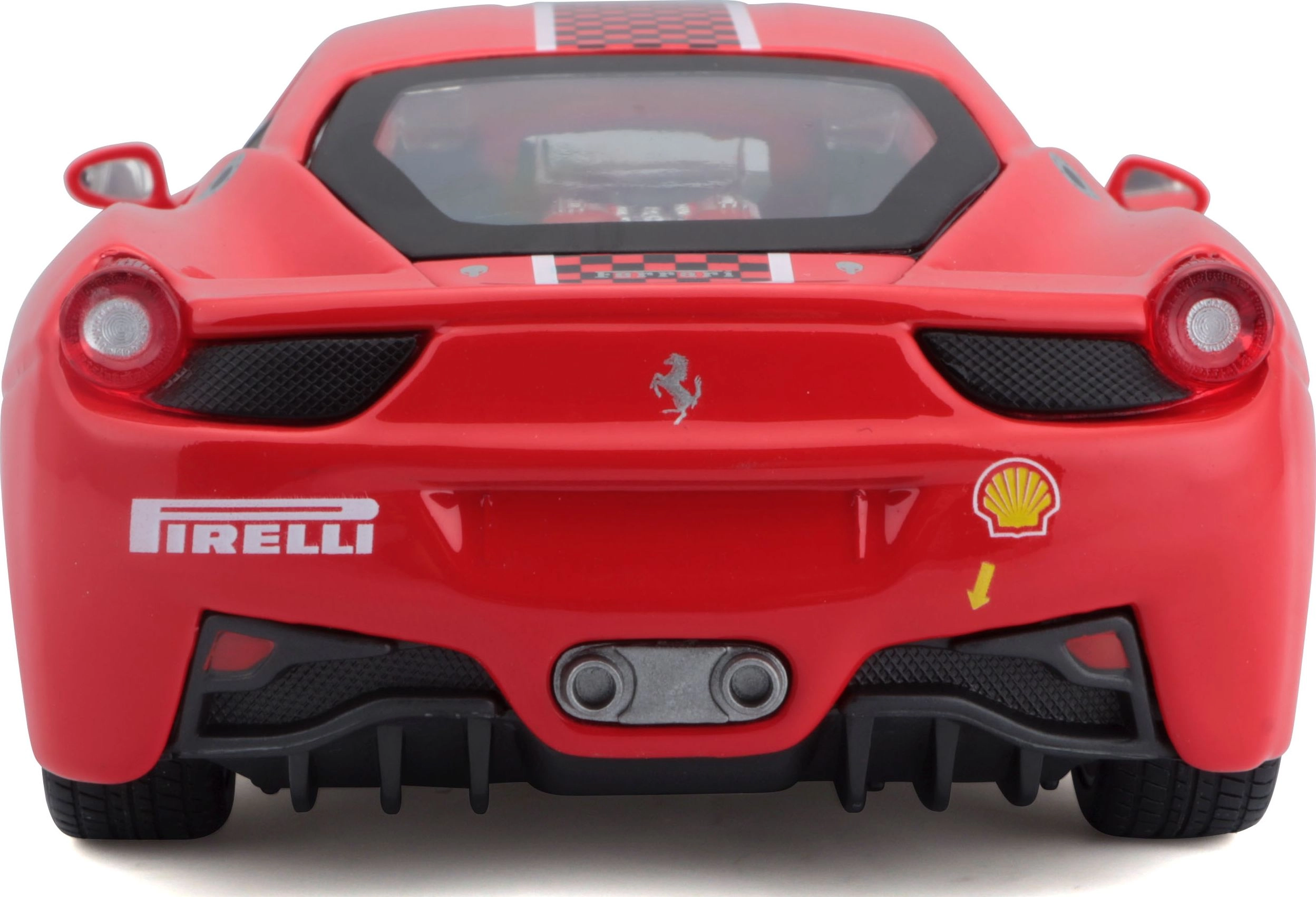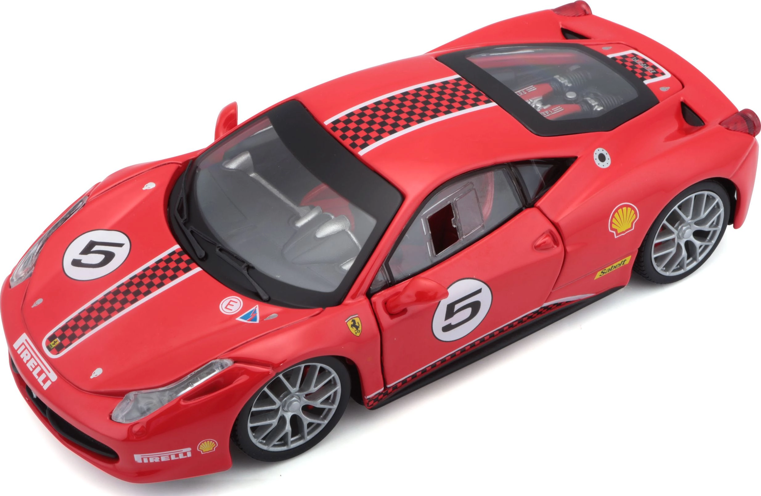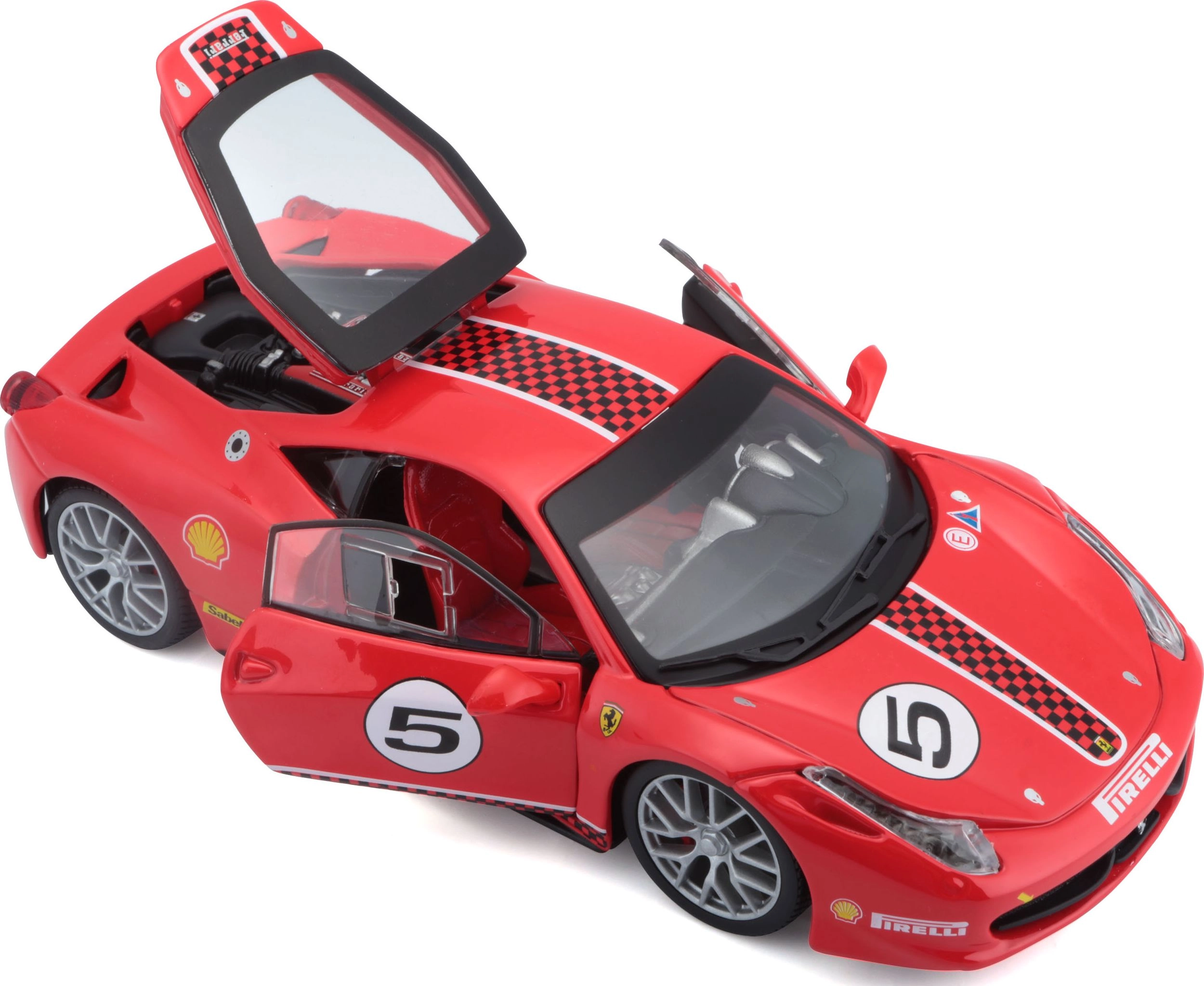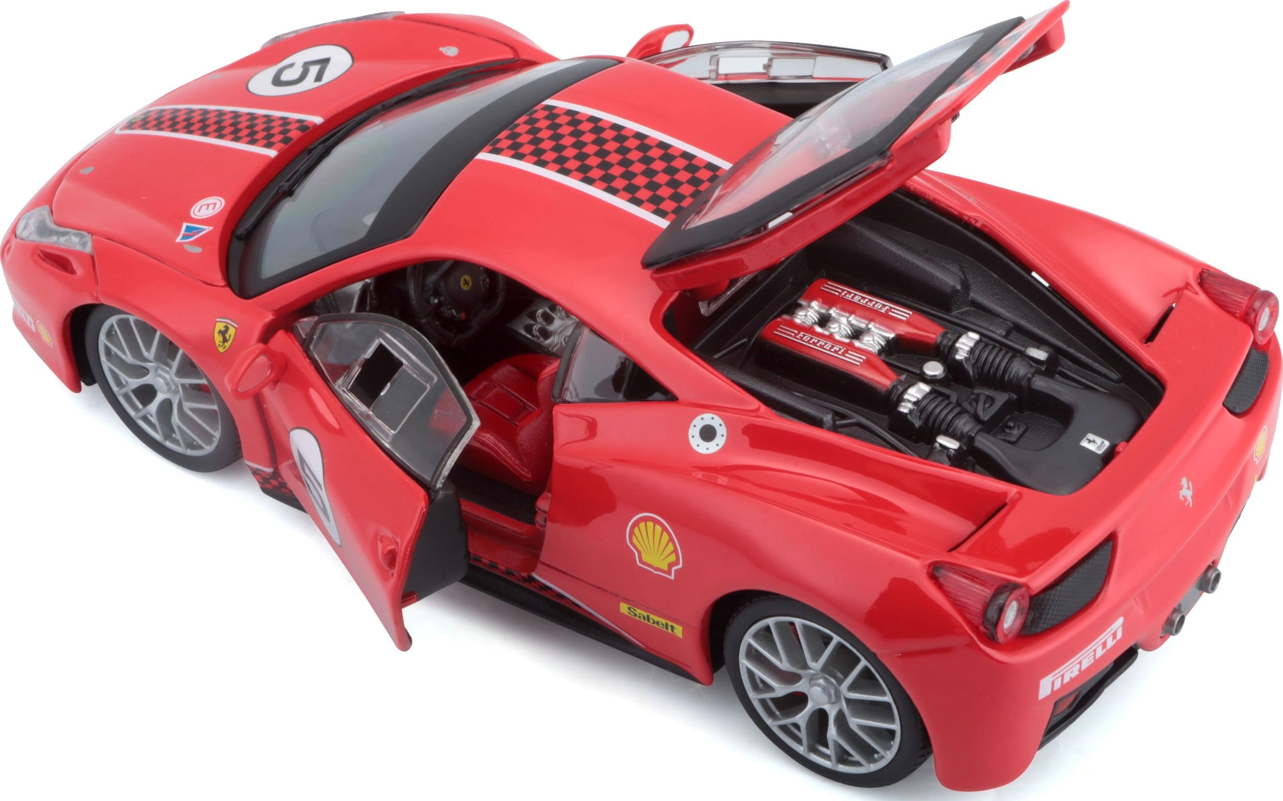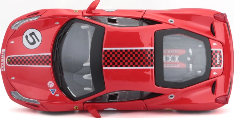 Το κόκκινο βάψιμο, ο αριθμός εκκίνησης 5 και τα λογότυπα χορηγών χαρίζουν στο μοντέλο αυθεντική αγωνιστική εμφάνιση, ιδανική για συλλογές FERRARI.