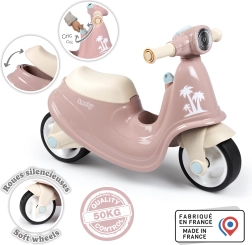 Ροζ σκούτερ από τη φημισμένη μάρκα Smoby, ένα χαριτωμένο ρετρό όχημα με δύο ρόδες, ιδανικό για μικρά παιδιά. Πρόκειται για ένα αναπτυξιακό παιχνίδι που ενισχύει την ισορροπία, τη δύναμη και τη φυσική κατάσταση του παιδιού.