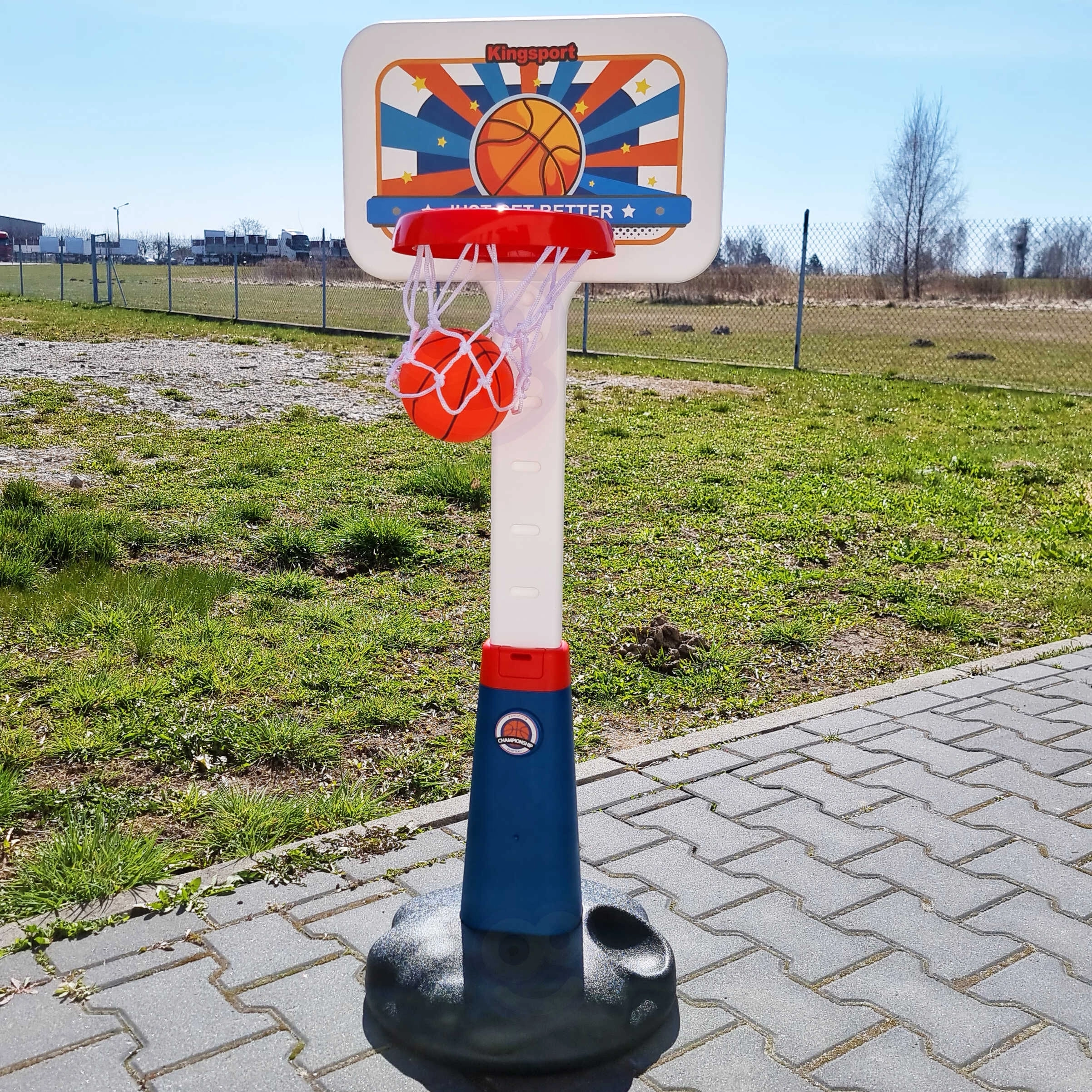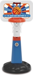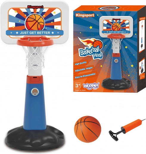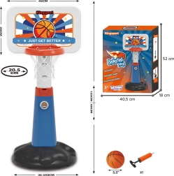Το σετ περιλαμβάνει μπασκέτα, μπάλα και τρόμπα, παρέχοντας όλα όσα χρειάζεται το παιδί για παιχνίδι.