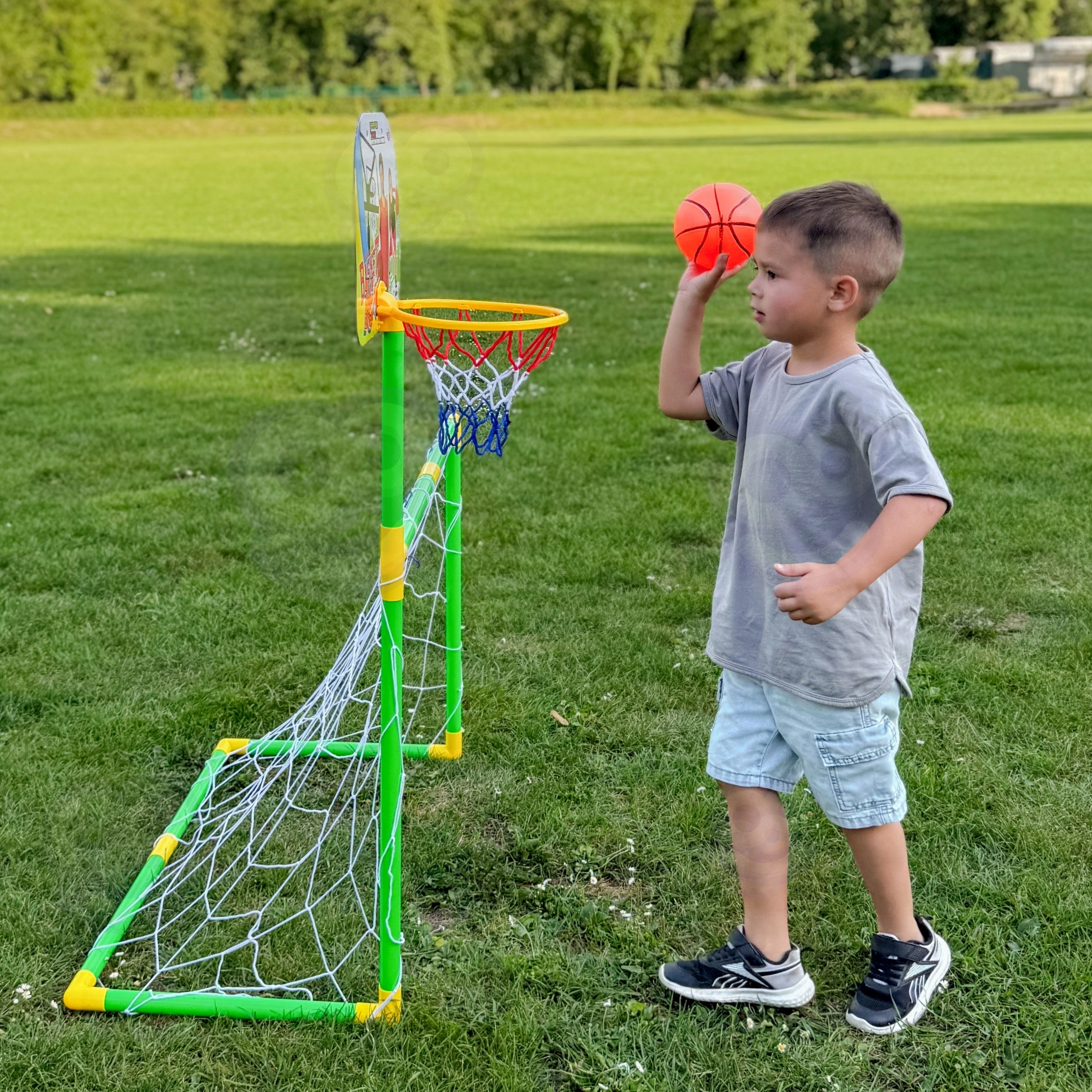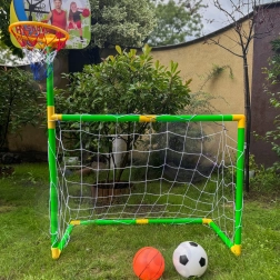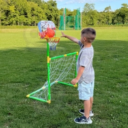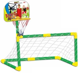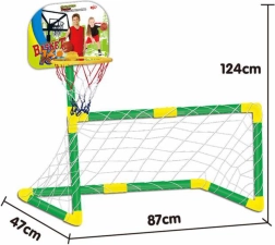 Περιεχόμενα συσκευασίας: ποδοσφαιρικό τέρμα με δίχτυ, καλάθι μπάσκετ, μπάλα ποδοσφαίρου, μπάλα μπάσκετ, μικρή τρόμπα.