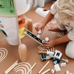 Το παιχνίδι είναι κατασκευασμένο κυρίως από ξύλο, συμπληρωμένο με ποιοτικό πλαστικό και επεξεργασμένο με μη τοξικό βερνίκι. Είναι ανθεκτικό, αισθητικά προσεγμένο και σχεδιασμένο για μακροχρόνιο παιχνίδι στο παιδικό δωμάτιο. Υποστηρίζει τη φαντασία, τη δημιουργικότητα και τη λεπτή κινητικότητα.