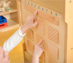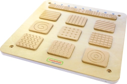 Αυτός ο ξύλινος αισθητηριακός πίνακας προσφέρει στα παιδιά ένα ασφαλές και διεγερτικό περιβάλλον για να γνωρίσουν τον κόσμο μέσω της αφής. Το παιχνίδι συνίσταται στο ότι το παιδί, με τα μάτια κλειστά, εξερευνά πρώτα το μικρό πλακίδιο με υφή και στη συνέχεια αναζητά την αντιστοιχία του ανάμεσα στα εννέα μεγαλύτερα. Με αυτό τον φυσικό τρόπο ενισχύει τη αισθητηριακή ολοκλήρωση, τη συγκέντρωση και την ικανότητα σύγκρισης.