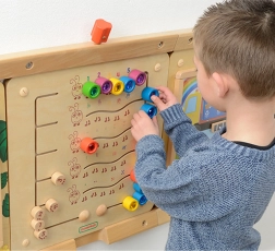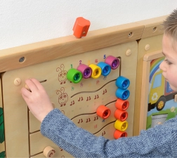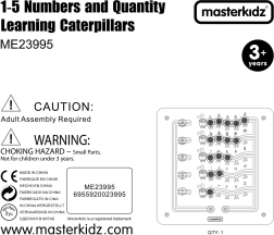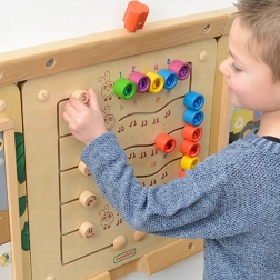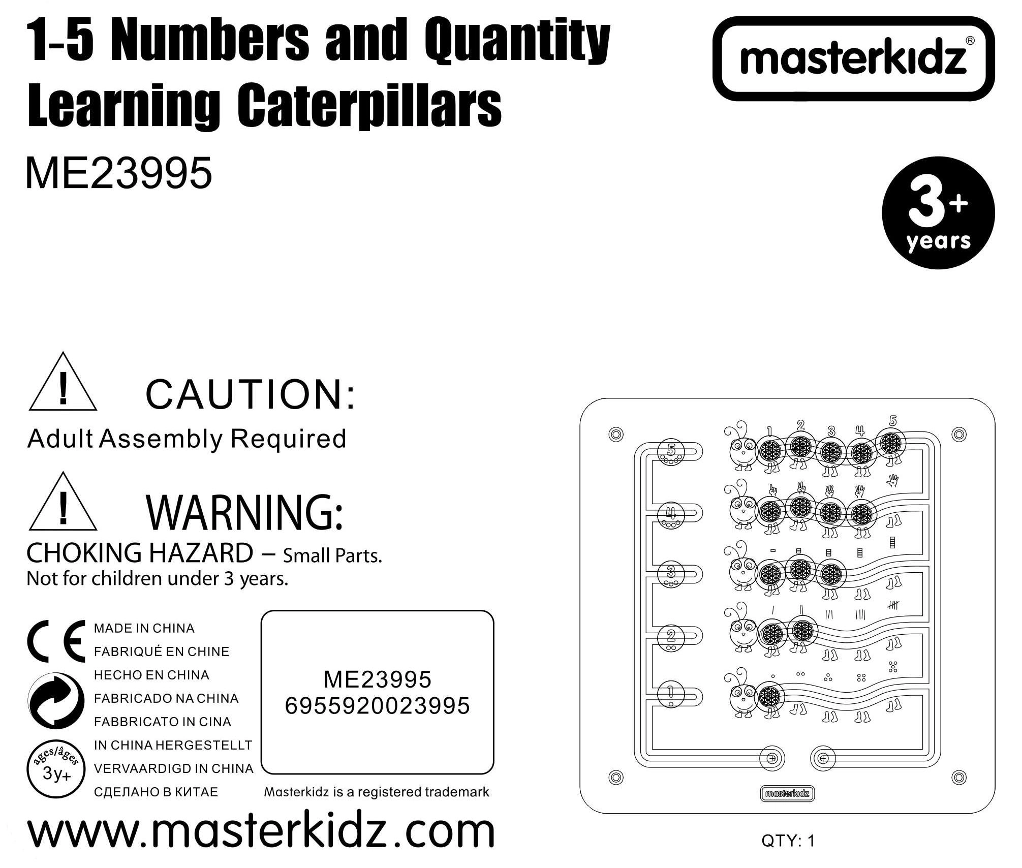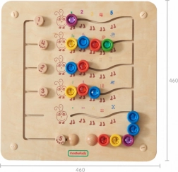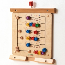 Αυτός ο στιβαρός ξύλινος επιτοίχιος πίνακας MASTERKIDZ παρουσιάζει πέντε πολύχρωμες κάμπιες και 15 συρόμενους “πολύτιμους λίθους” σε πέντε χρώματα. Τα παιδιά μπορούν να τους μετακινούν στις καμπύλες διαδρομές, αλλά δεν μπορούν να τους αφαιρέσουν, διασφαλίζοντας έτσι ασφαλές και μακροχρόνιο παιχνίδι στο σπίτι και στα νηπιαγωγεία. Ο πίνακας δείχνει πέντε τρόπους απεικόνισης των αριθμών 1–5: αριθμητικά ψηφία, δάχτυλα, γραμμές, μπλοκ και τελείες.