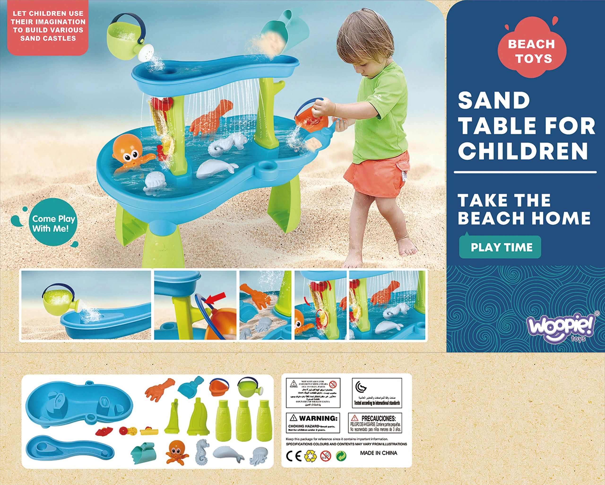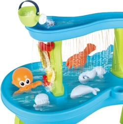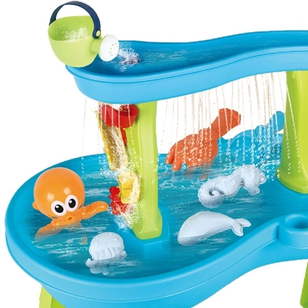 Το τραπέζι νερού Χταπόδι από τη μάρκα WOOPIE προσφέρει μια μοναδική εμπειρία με νερό και άμμο για τα παιδιά. Χάρη στα 18 αξεσουάρ όπως 3 καλούπια, χταπόδι, ποτιστήρι, καλαθάκι, συλλέκτη άμμου και 2 φτυαράκια, τα παιδιά απολαμβάνουν ατελείωτες δυνατότητες παιχνιδιού. Το νερό που χύνεται στο επάνω μέρος του τραπεζιού μπορεί να ρέει μέσα από ανοίγματα στη βάση ή να περιστρέφει τους υδρομύλους. Ιδανικό για παιχνίδι τόσο στο σπίτι όσο και έξω!