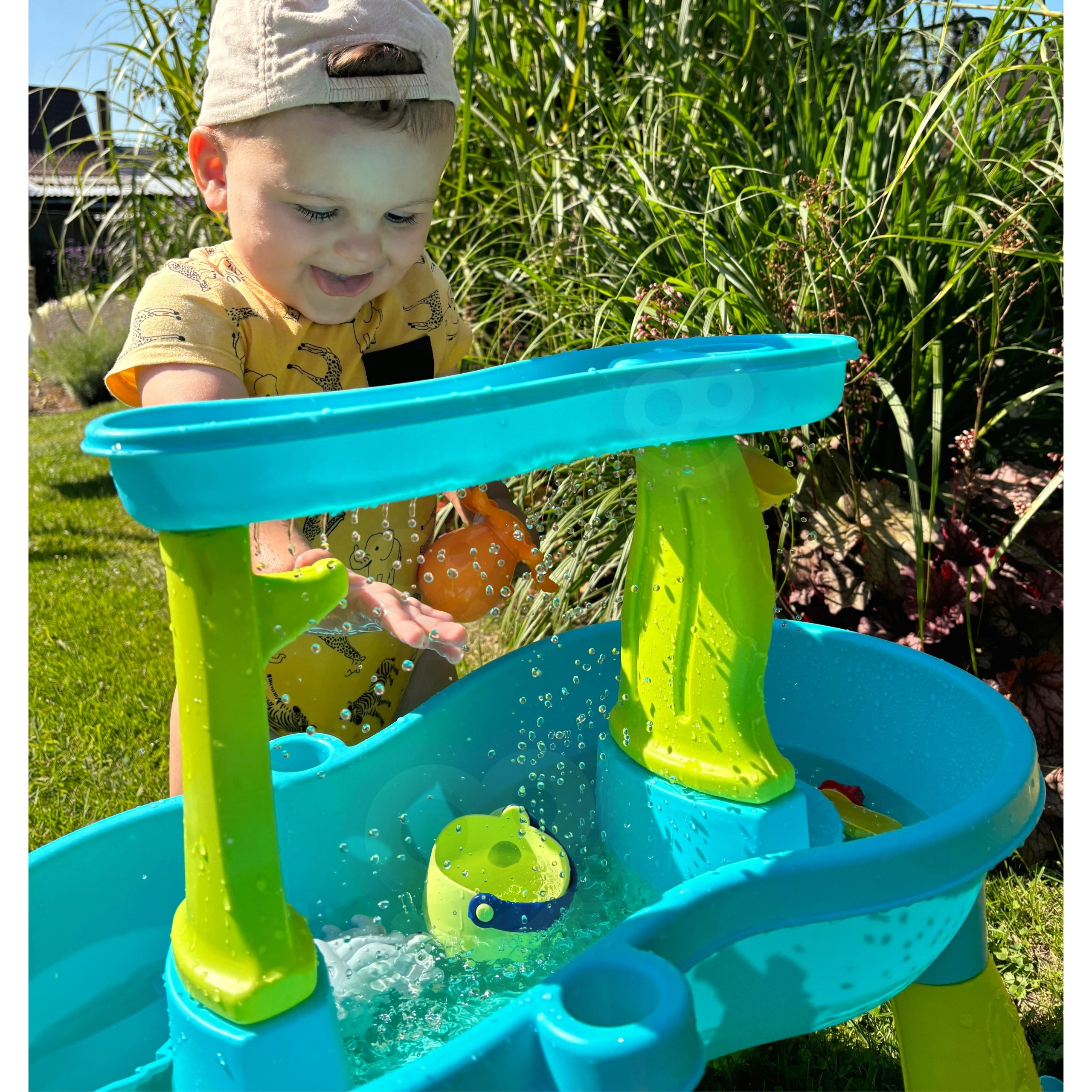 Τα παιδιά ρίχνουν νερό στο επάνω μέρος του τραπεζιού και παρακολουθούν τη ροή του μέσα από υδρομύλους και ανοίγματα για διασκεδαστικό υδάτινο εφέ.