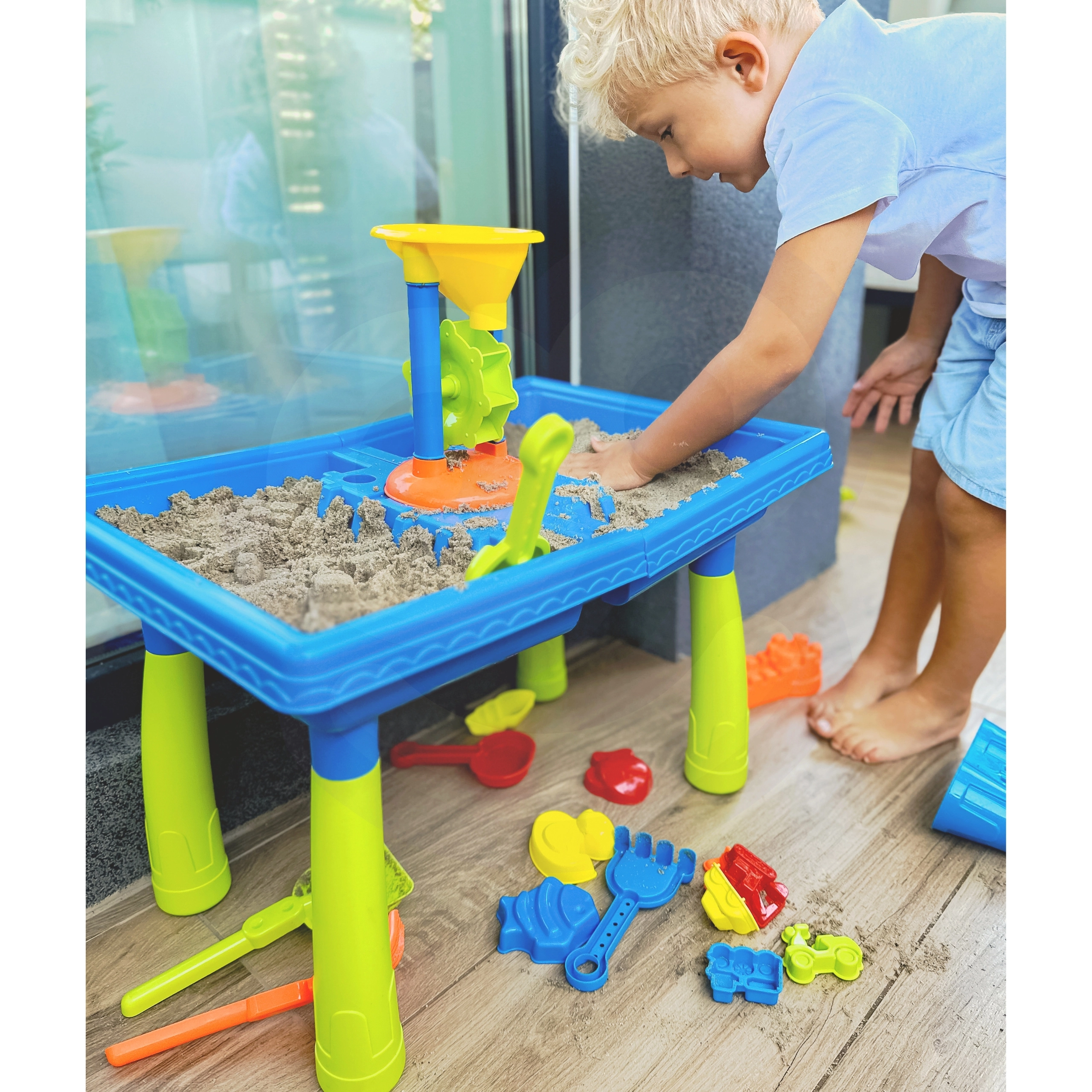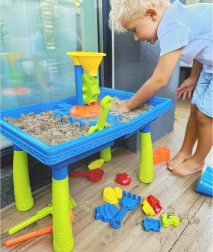 Χάρη στα δύο ξεχωριστά διαμερίσματα, το τραπέζι επιτρέπει ταυτόχρονο παιχνίδι με νερό και άμμο, προσφέροντας ποικιλία διασκεδαστικών επιλογών.