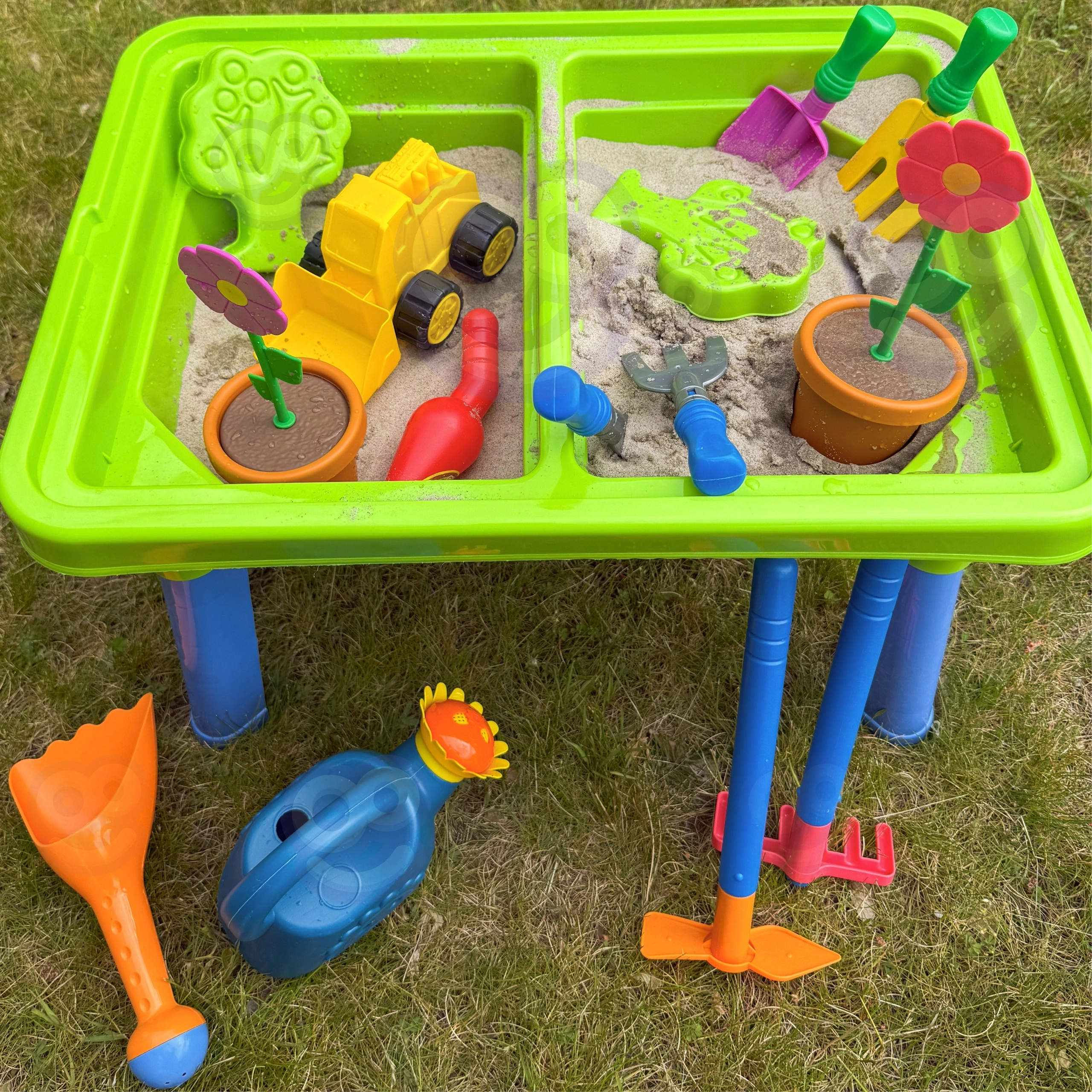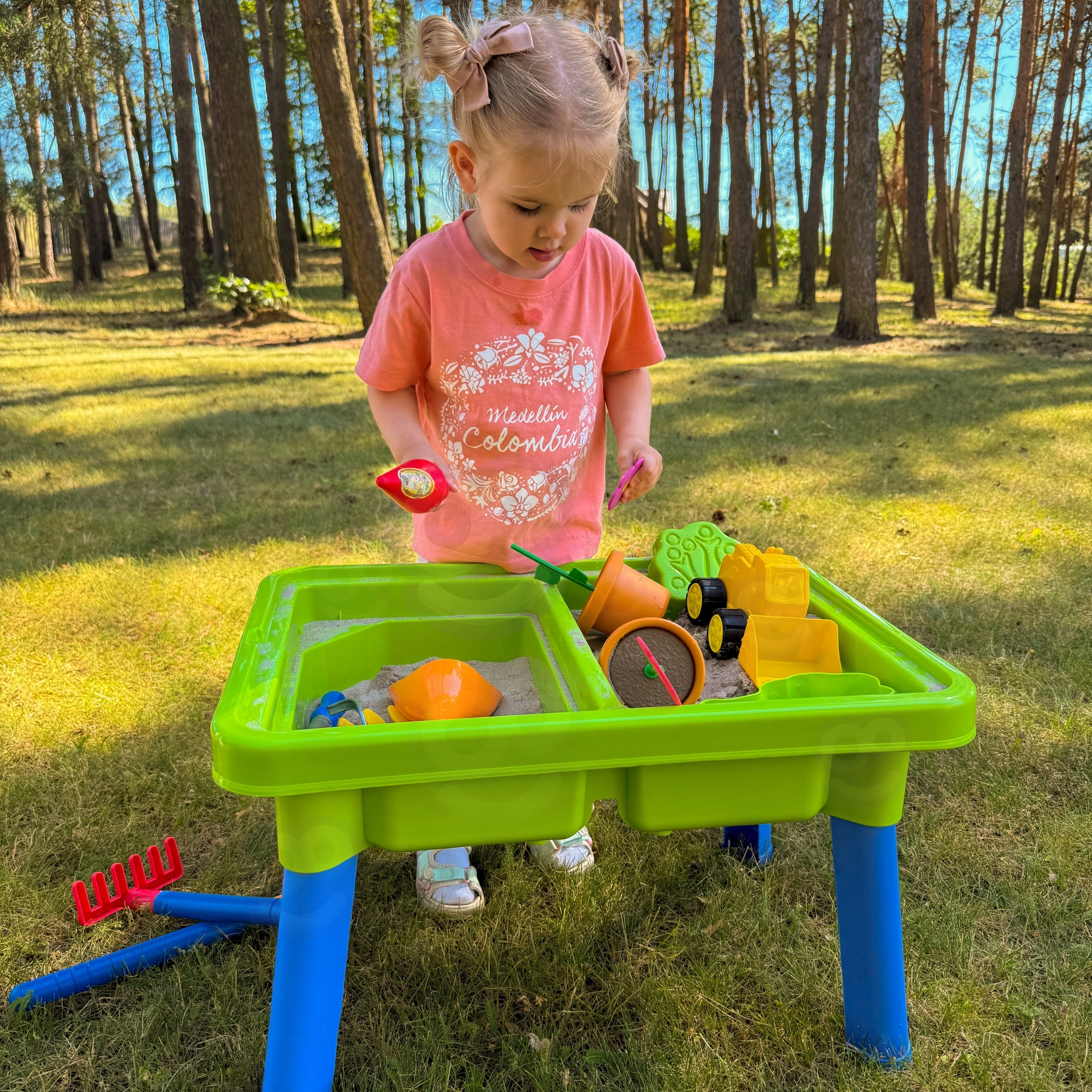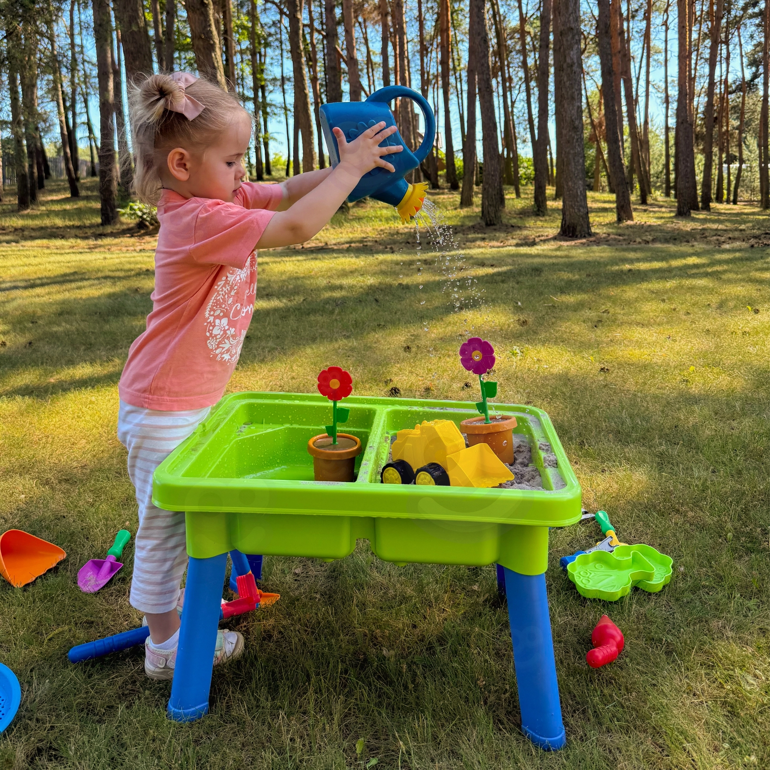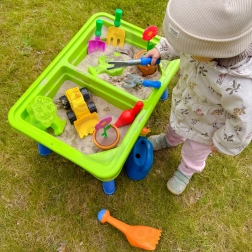 Οι χωριστές θήκες επιτρέπουν ταυτόχρονες δραστηριότητες με νερό και άμμο – τα παιδιά μπορούν να ρίχνουν, να κοσκινίζουν και να σχηματίζουν χωρίς να αναμειγνύονται τα υλικά.