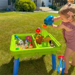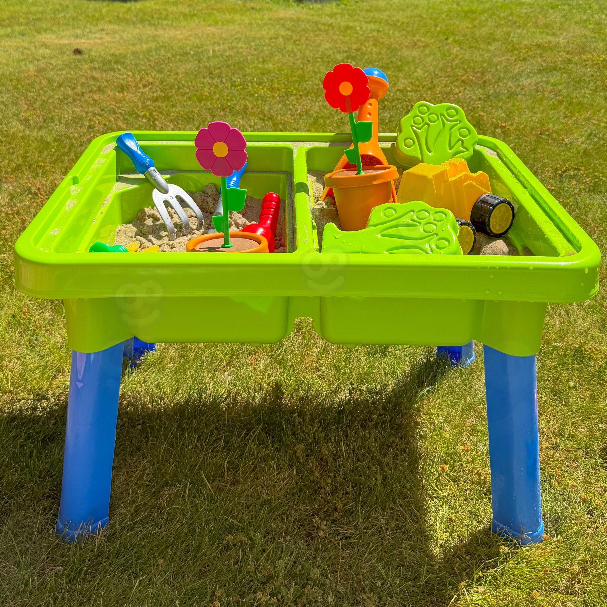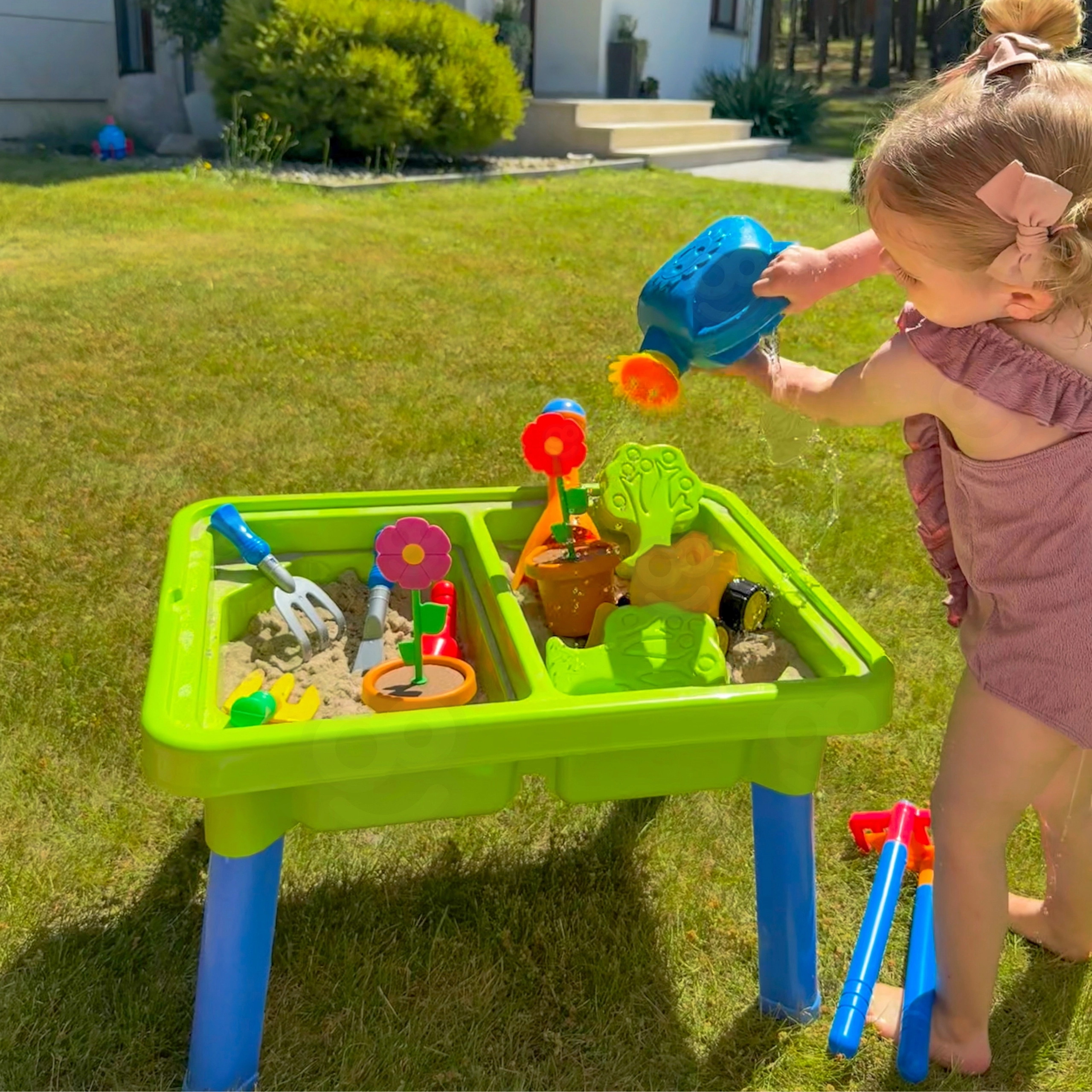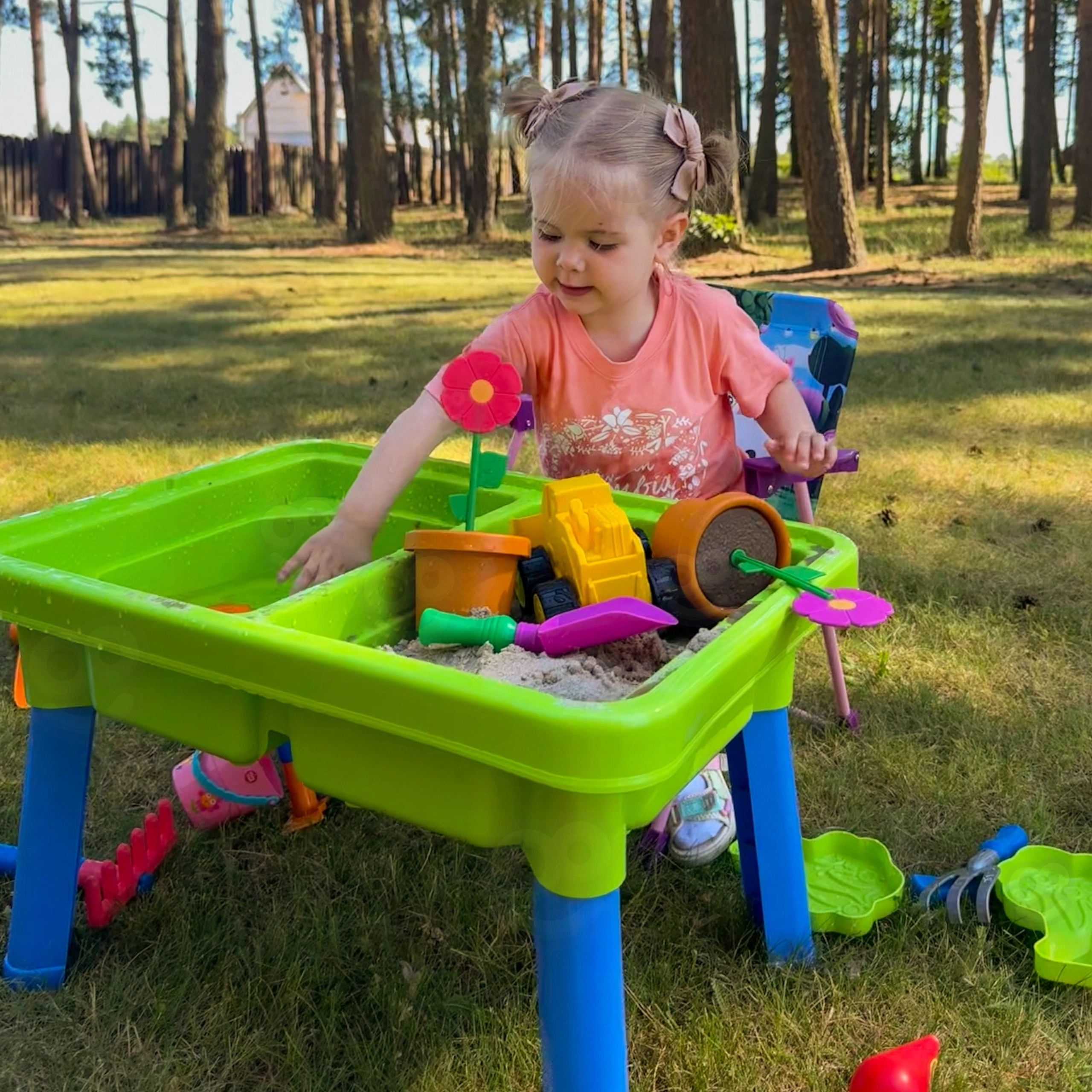 Οι χωριστές θήκες επιτρέπουν ταυτόχρονες δραστηριότητες με νερό και άμμο – τα παιδιά μπορούν να ρίχνουν, να κοσκινίζουν και να σχηματίζουν χωρίς να αναμειγνύονται τα υλικά.