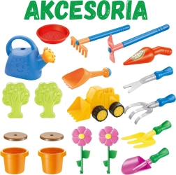 Ποτιστήρι, φτυαράκια, τσουγκράνα, καλούπια, γλαστράκι με λουλούδι και μικρό ανατρεπόμενο φορτηγάκι διευρύνουν τις δυνατότητες παιχνιδιού και ενισχύουν τη φαντασία των παιδιών.