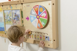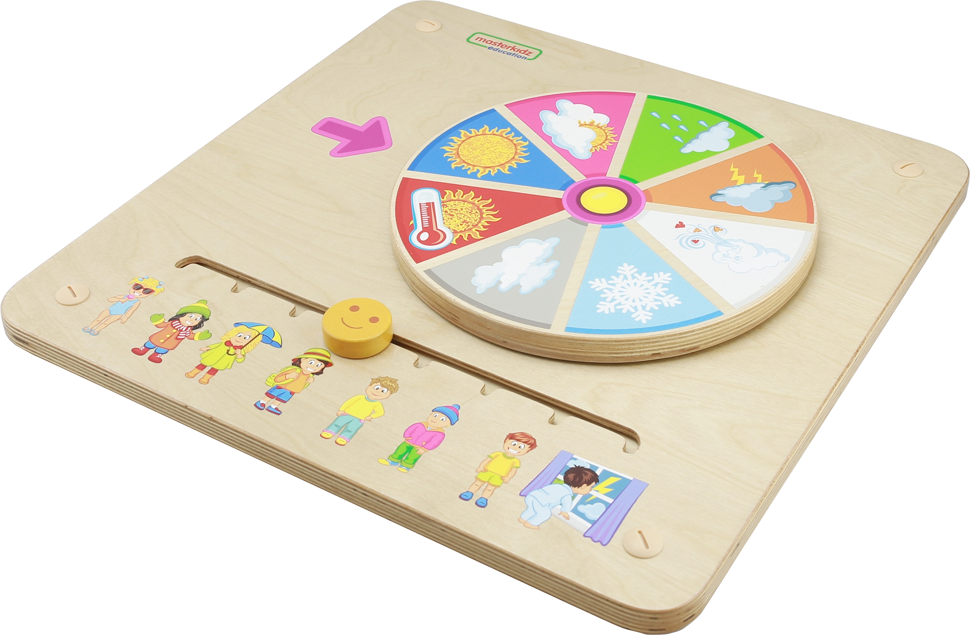 Με τη βοήθεια ενός περιστρεφόμενου τροχού και ενός συρόμενου δείκτη στον πίνακα, τα παιδιά μπορούν να γνωρίσουν διαφορετικές καιρικές συνθήκες και τι είναι κατάλληλο να φορεθεί σε αυτές τις συνθήκες.