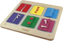 Έξι υφασμάτινα πάνελ μιμούνται πιστά τα κουμπώματα σε μπουφάν και πουκάμισα. Τα παιδιά εξασκούνται με ασφάλεια σε φερμουάρ, κουμπιά και τρουκ, πριν τα χρησιμοποιήσουν στην πραγματική ζωή.