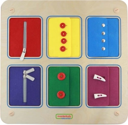 Αναπτύξτε την επιδεξιότητα των παιδιών με τον ξύλινο πίνακα Montessori MASTERKIDZ. Έξι πολύχρωχες υφασμάτινες τσέπες προσομοιώνουν το κούμπωμα ρούχων και διδάσκουν στα παιδιά πρακτικές δεξιότητες: φερμουάρ, κουμπιά, τρουκ και διπλό φερμουάρ. Η ανθεκτική ξύλινη κατασκευή και το παιχνίδι με νόημα ενισχύουν τη λεπτή κινητικότητα, την οπτικοκινητική συνεργασία και την αυτονομία.