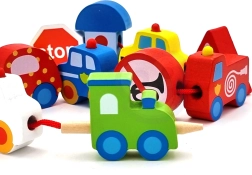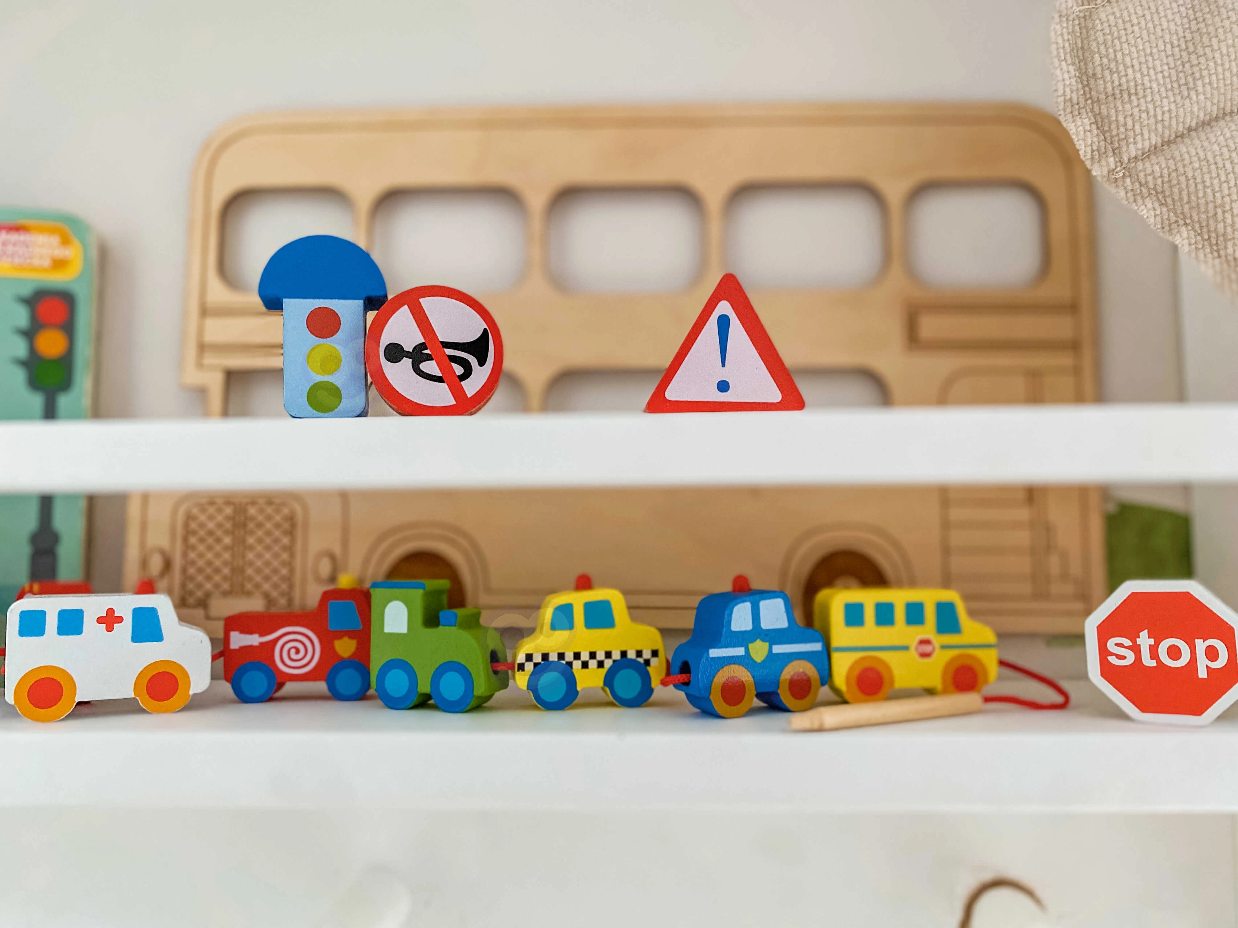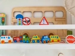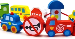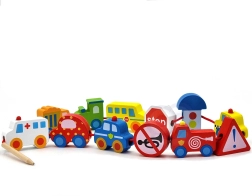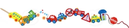 Πολύχρωμα ξύλινα κομμάτια που απεικονίζουν αυτοκίνητα, λεωφορείο, τρακτέρ, ασθενοφόρο και σήματα κυκλοφορίας – τα παιδιά γνωρίζουν με διασκεδαστικό τρόπο τον κόσμο των μεταφορών.