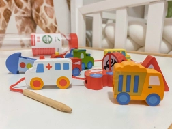 Το πέρασμα του κορδονιού μέσα από τις τρύπες στα τουβλάκια εξασκεί την ακρίβεια των δακτύλων, τη λαβή και τον συντονισμό χεριού–ματιού, ιδανικό για παιδιά από 2 ετών.