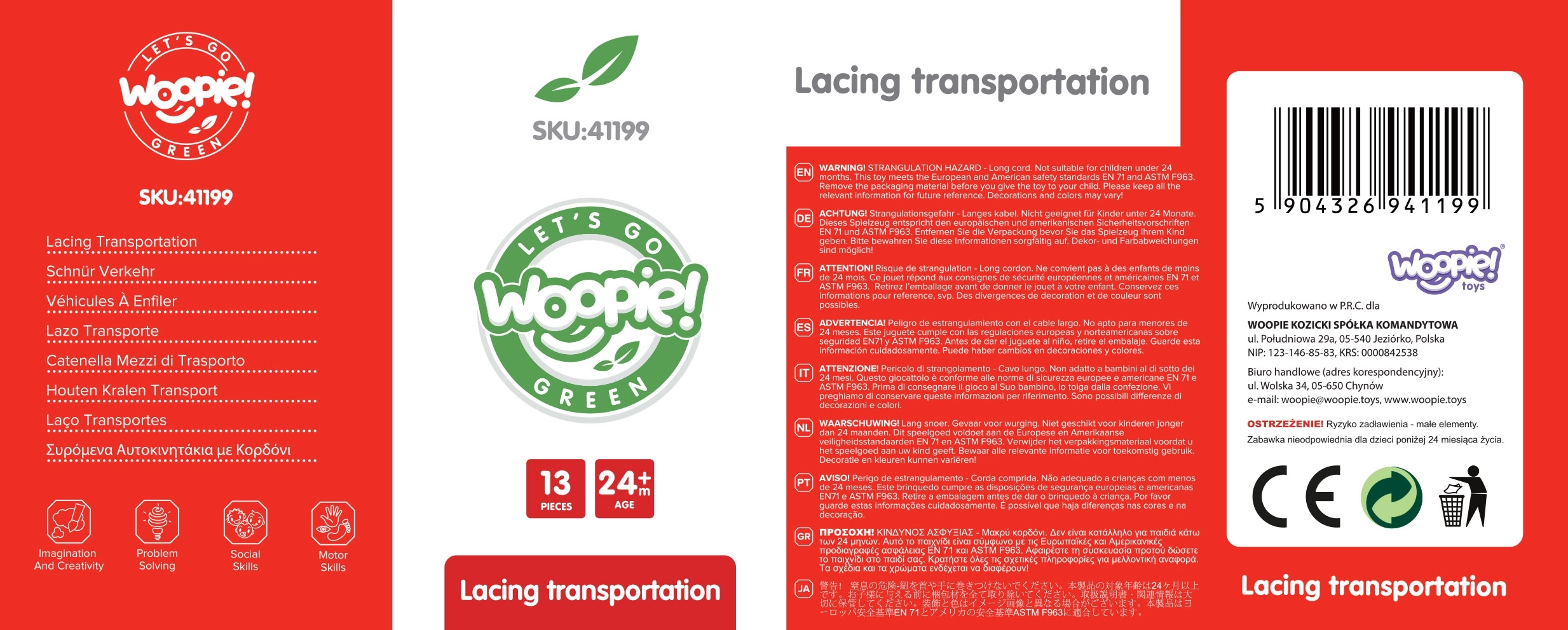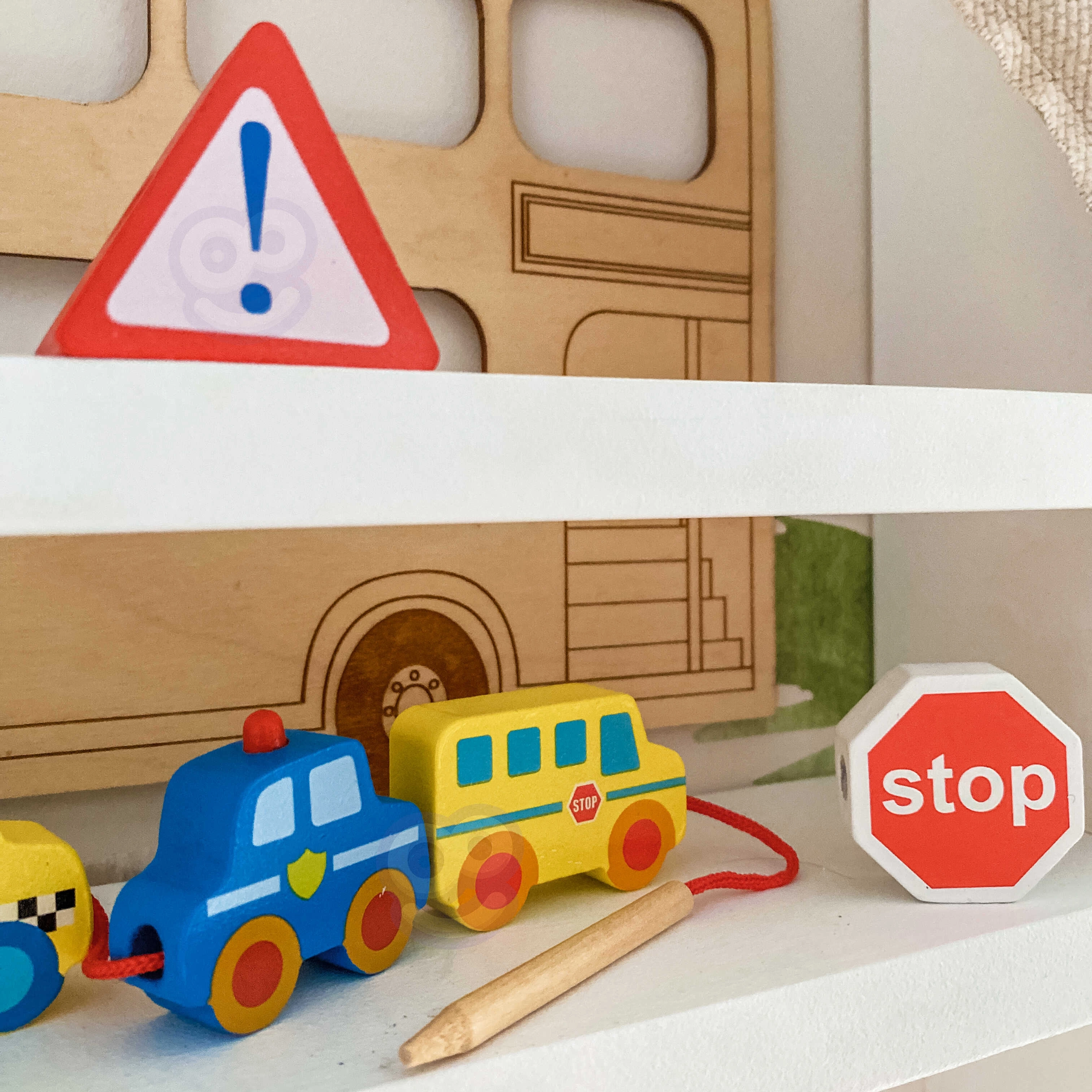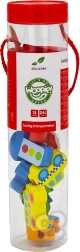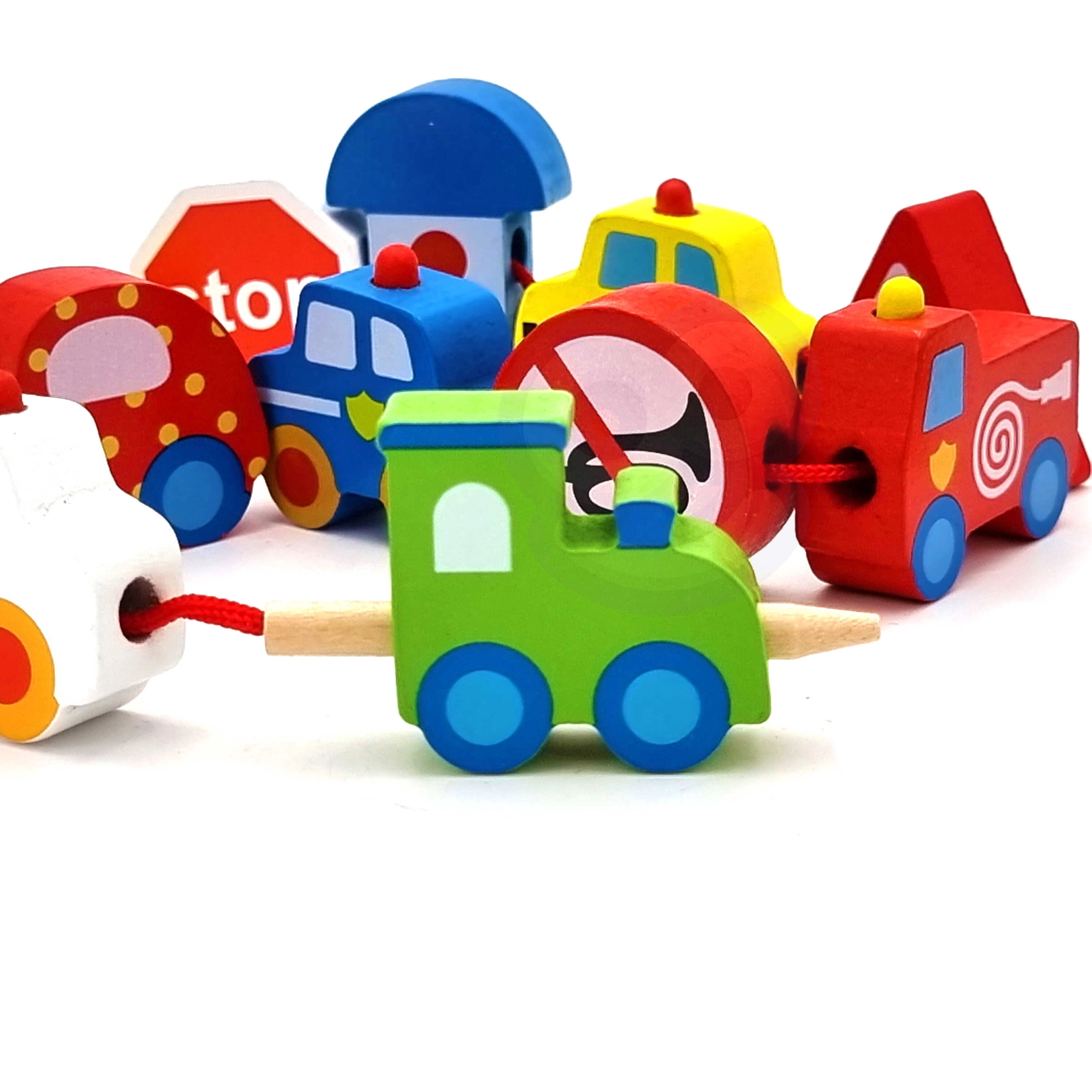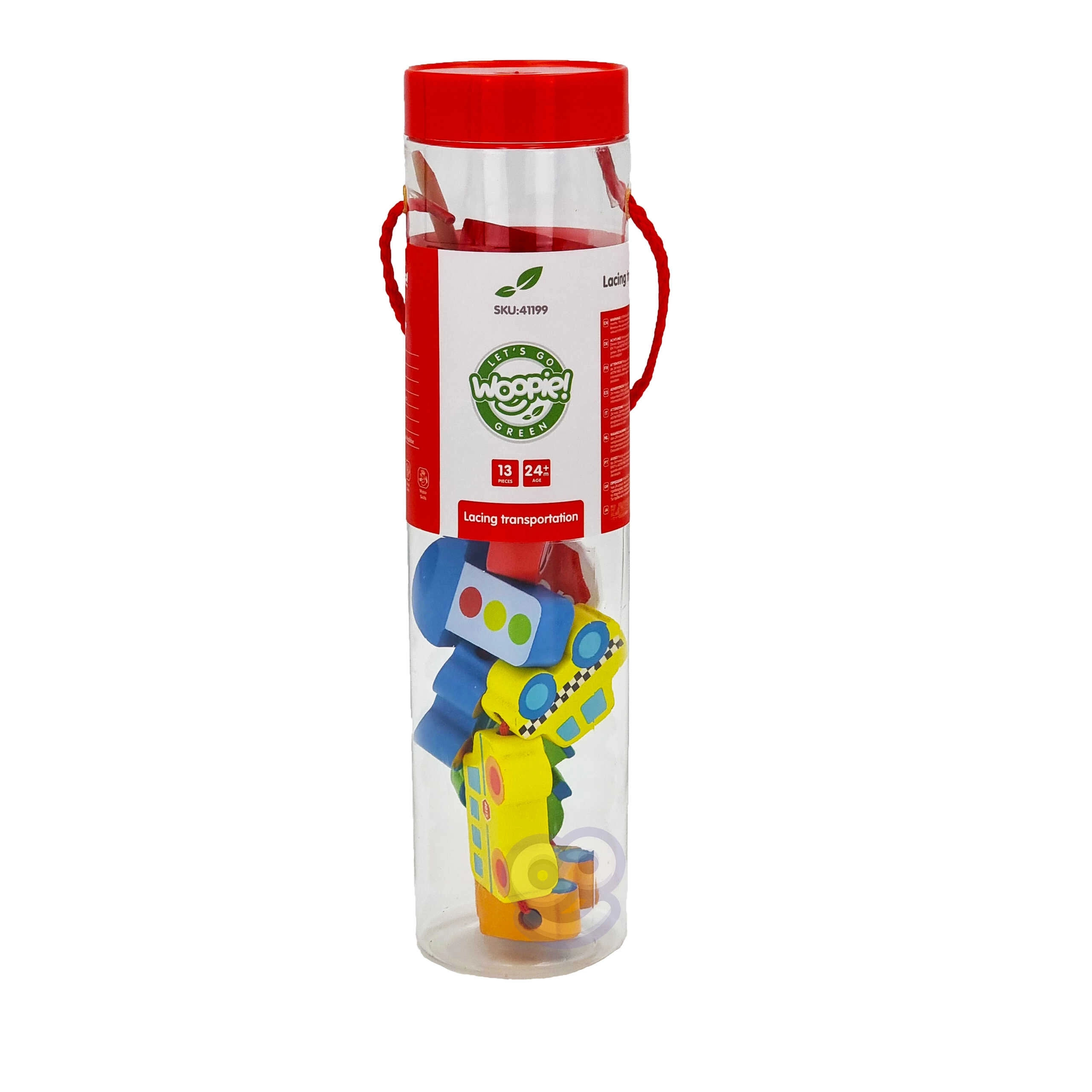 Στη συσκευασία περιλαμβάνονται 12 ξύλινα τουβλάκια με θέματα οχημάτων και 1 κορδόνι με ξύλινη ράβδο για εύκολο πέρασμα. Με το πέρασμα των κομματιών μπορούν να δημιουργηθούν δικές τους «πομπές» ή ιστορίες από την πόλη – από το πυροσβεστικό όχημα και το περιπολικό έως το λεωφορείο και τα σήματα κυκλοφορίας.