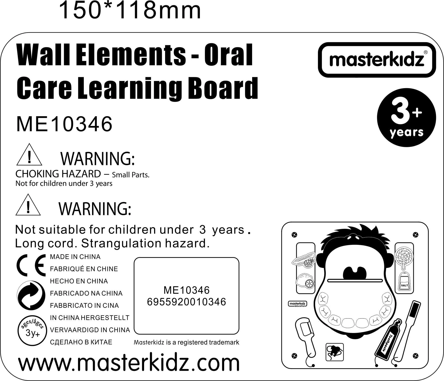 Διασκεδαστικός και εκπαιδευτικός επιτοίχιος πίνακας Masterkidz που βοηθά τα παιδιά να αποκτήσουν σωστή στοματική υγιεινή. Διδάσκει τα παιδιά σωστό βούρτσισμα των δοντιών, χρήση οδοντικού νήματος και αναγνώριση βασικών γεύσεων (γλυκιά, αλμυρή, ξινή και πικρή). Η ανθεκτική ξύλινη κατασκευή είναι ιδανική για παιδικούς σταθμούς, παιδότοπους και οικιακή χρήση.