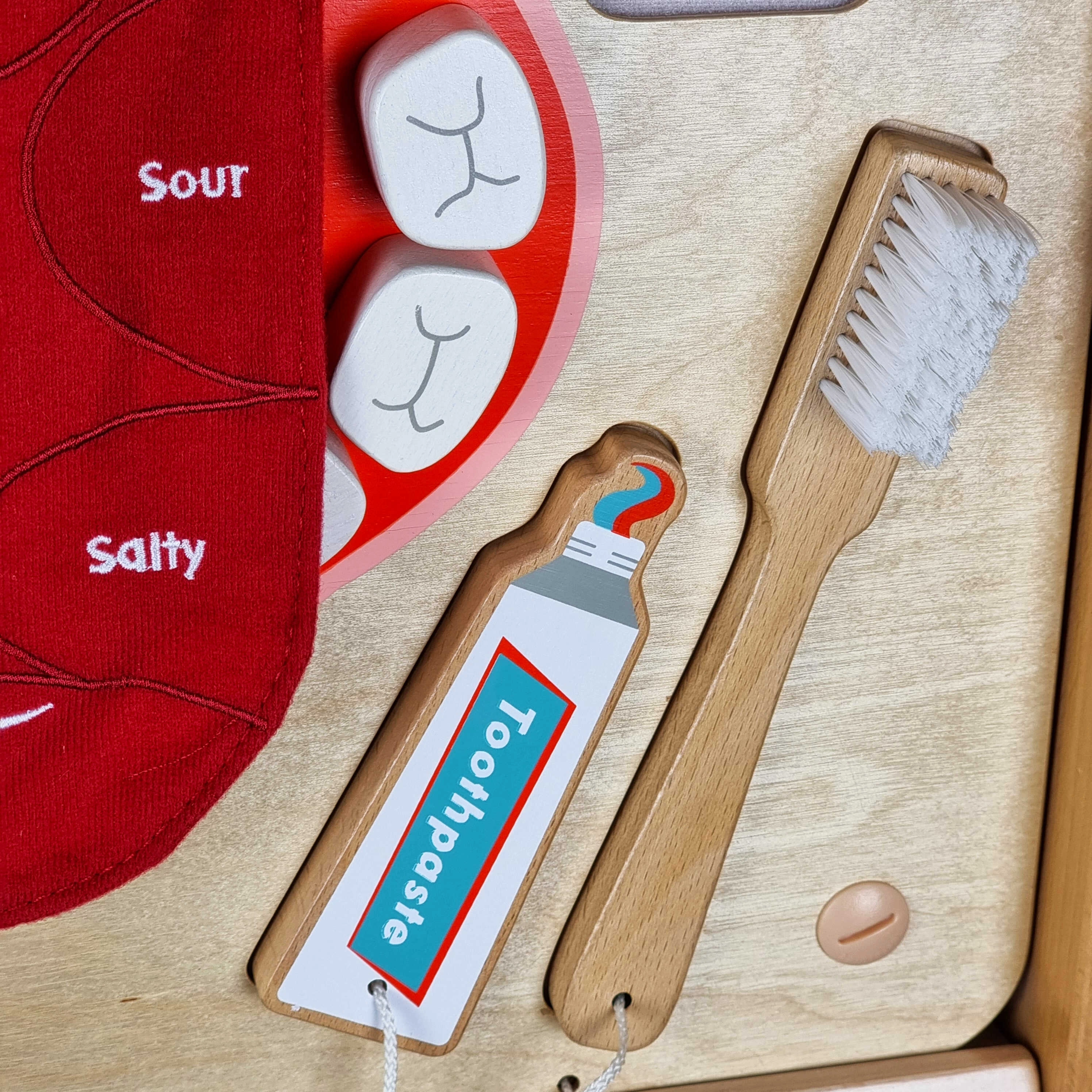 - Κινούμενη γλώσσα με ζώνες γεύσεων· τρόφιμα με βέλκρο· οδοντόβουρτσα, πάστα, οδοντικό νήμα