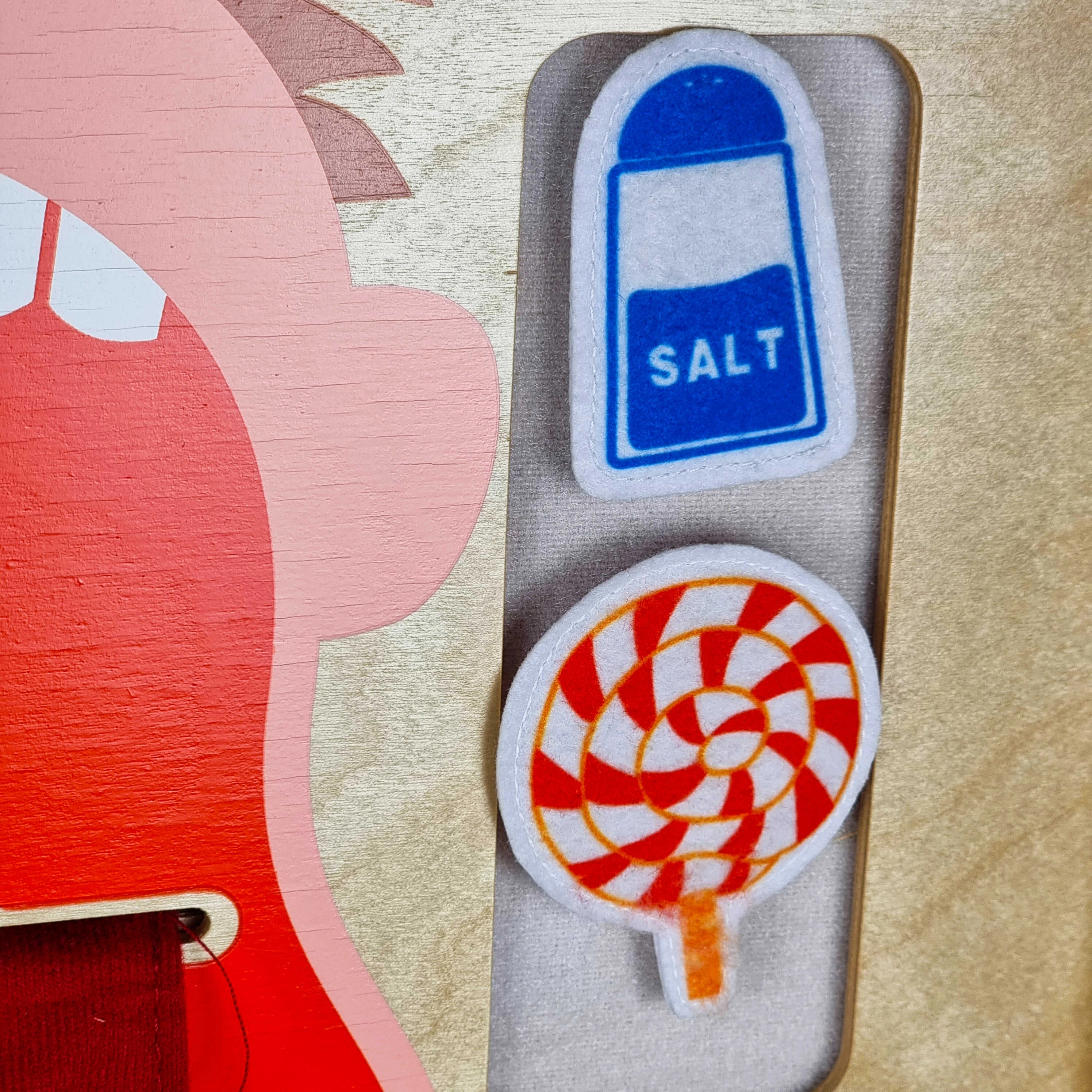 Η μεγάλη κινούμενη γλώσσα με καθαρά σημειωμένες ζώνες γεύσεων και τα τρόφιμα με αυτοκόλλητο βέλκρο μαθαίνουν στα παιδιά να ξεχωρίζουν τη γλυκιά, αλμυρή, ξινή και πικρή γεύση.