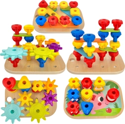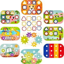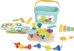 Με αυτό το κουτί, τα παιδιά μπορούν να απολαύσουν 12 διαφορετικές δραστηριότητες σε μία συμπαγή συσκευασία – από τη συναρμολόγηση μοτίβων, την εκμάθηση σχημάτων και χρωμάτων, έως την κατασκευή 3D δομών. Όλα τα μέρη μπορούν να αποθηκευτούν εύκολα στο εσωτερικό, διευκολύνοντας τη συμπαγή μεταφορά και την οργάνωση. Το προϊόν είναι κατασκευασμένο από φυσικό ξύλο και διαθέτει στρογγυλεμένες άκρες για μέγιστη ασφάλεια.