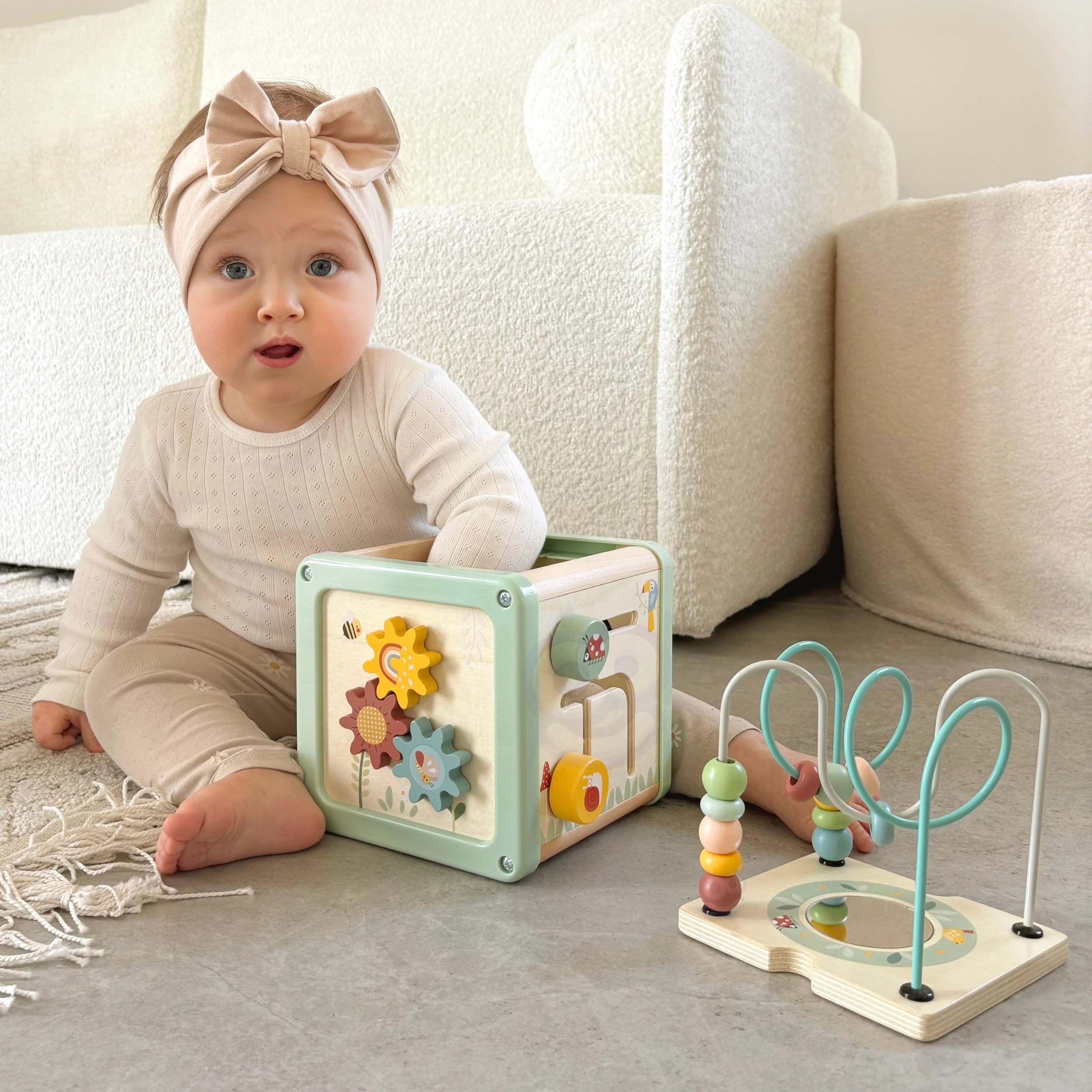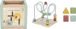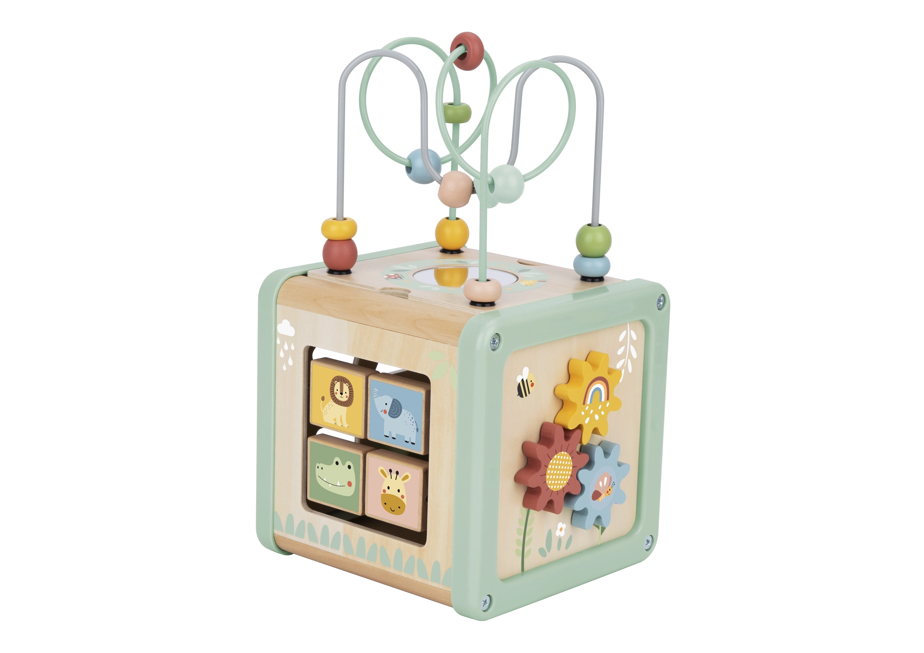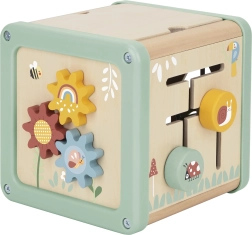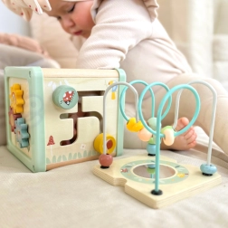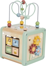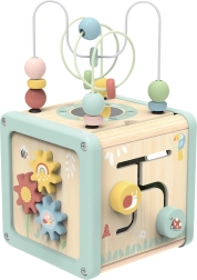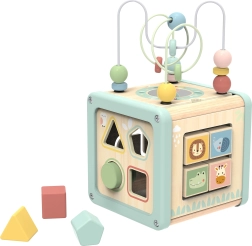 Αυτός ο πολυλειτουργικός ξύλινος κύβος υποστηρίζει τη φυσική ανάπτυξη του παιδιού μέσω ουσιαστικού παιχνιδιού. Οι παστέλ αποχρώσεις τραβούν την προσοχή, ενώ οι ποικίλες δραστηριότητες εξασκούν τη λεπτή κινητικότητα, τον συντονισμό χεριού–ματιού, τη λογική σκέψη και την αναγνώριση σχημάτων και χρωμάτων.