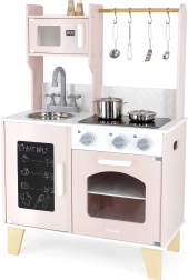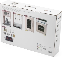 Περιλαμβάνονται πλούσια αξεσουάρ: κατσαρόλα με καπάκι, τηγάνι, κουτάλα, τρυπητή σπάτουλα, μαρίζ, σετ «λαχανικών» και αλατοπίπερο. Λειτουργικές λεπτομέρειες όπως 3 περιστροφικοί διακόπτες, ανοιγόμενες πόρτες φούρνου και ντουλαπιού καθώς και κρεμάστρες για εργαλεία προσδίδουν ρεαλισμό στο παιχνίδι και αναπτύσσουν τη λεπτή κινητικότητα, τη δημιουργικότητα και τις κοινωνικές δεξιότητες.
