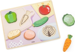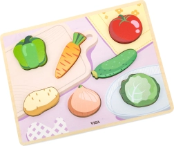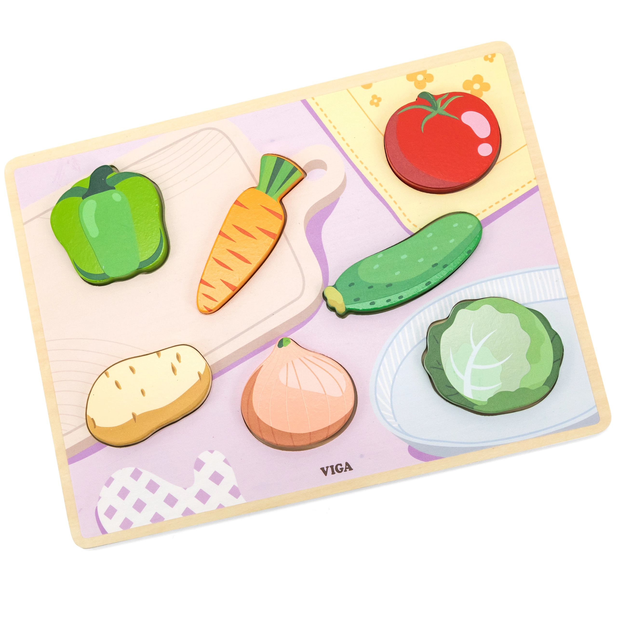 Το ξύλινο παζλ εισαγωγής VIGA με 7 κομμάτια σε σχήμα αγαπημένων λαχανικών (πιπεριά, ντομάτα, καρότο, αγγούρι, πατάτα, λάχανο και κρεμμύδι) προσφέρει τον ιδανικό συνδυασμό μάθησης και παιχνιδιού. Τα παιδιά εξασκούν την αναγνώριση σχημάτων και χρωμάτων, προπονούν την αντιστοίχιση και με διασκεδαστικό τρόπο ενισχύουν τη μνήμη και τη συγκέντρωση.