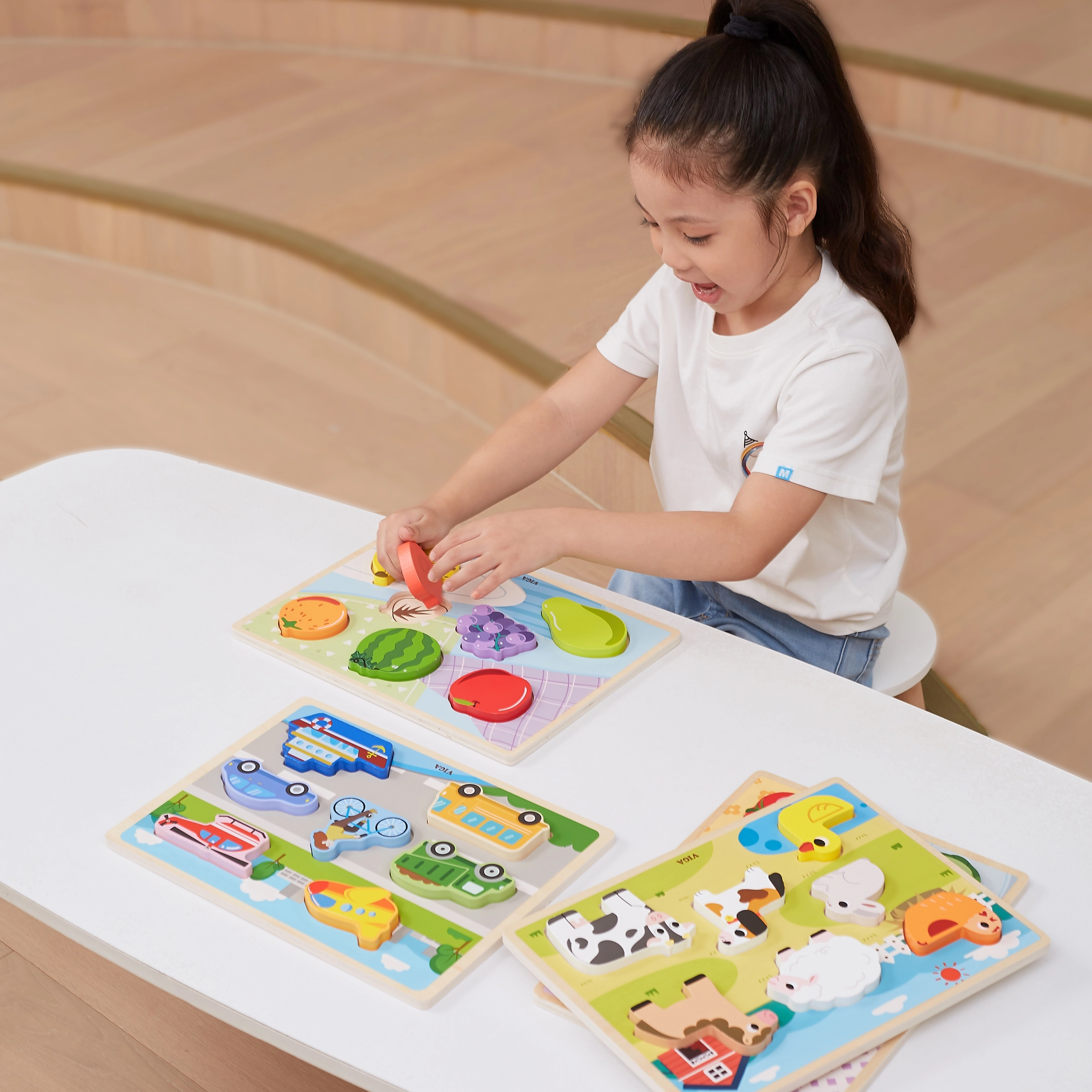 Η πολύχρωμη βάση με εικονογραφήσεις βοηθά τα παιδιά να τοποθετούν σωστά κάθε κομμάτι στη θέση του και ενισχύει την αναγνώριση σχημάτων, χρωμάτων και του χωρικού αντιληπτικού.