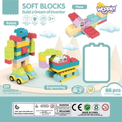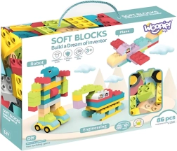 Το σετ WOOPIE περιλαμβάνει 86 κομμάτια, τα οποία συνδέονται εύκολα και επιτρέπουν στα παιδιά να δημιουργούν διάφορες 3D κατασκευές όπως αυτοκίνητα, αεροπλάνα ή ζωάκια. Τα τουβλάκια είναι μεγάλα και μαλακά, γεγονός που εξασφαλίζει ασφάλεια στο παιχνίδι, και μπορούν να αποστειρωθούν σε 120 βαθμούς για εύκολη συντήρηση.