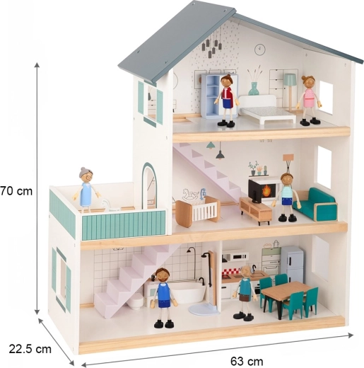 Το κομψό ξύλινο κουκλόσπιτο TOOKY TOY διαθέτει τρεις ορόφους γεμάτους λεπτομέρειες, συμπεριλαμβανομένης κουζίνας, σαλονιού, μπάνιου και υπνοδωματίου με μπαλκόνι. Περιλαμβάνονται έπιπλα και οικογένεια 6 αρθρωτών φιγούρων, που ενισχύουν το δημιουργικό και κοινωνικό παιχνίδι. Η στιβαρή ξύλινη κατασκευή και η ασφαλής σχεδίαση σε απαλές αποχρώσεις είναι ιδανικές για παιδιά από 3 ετών.