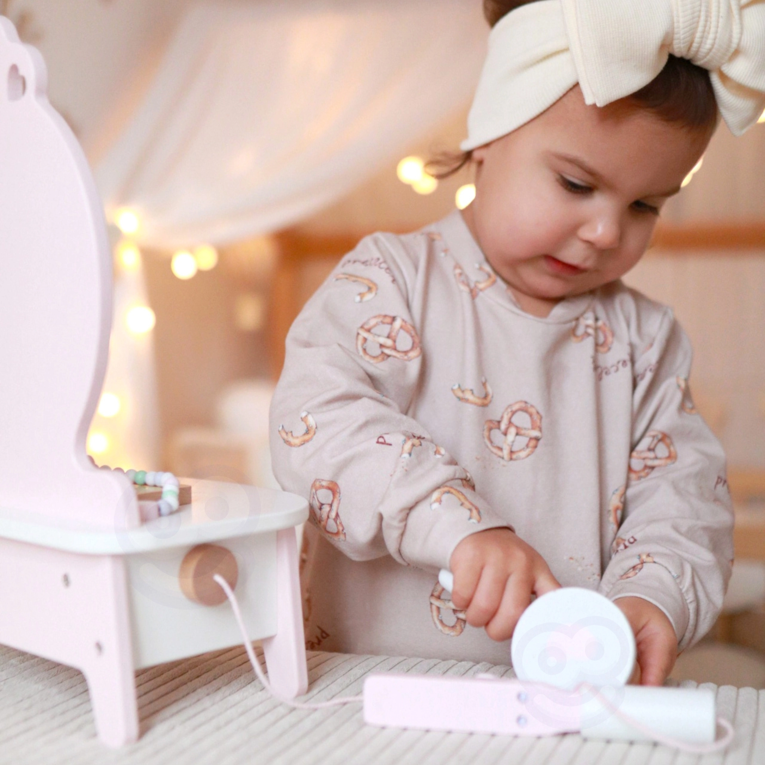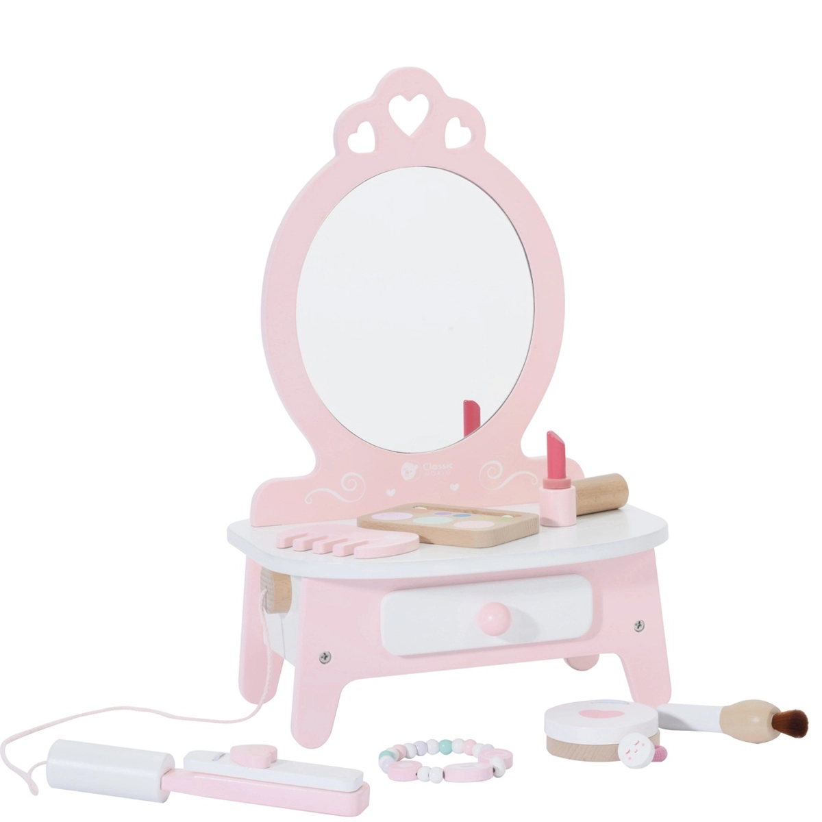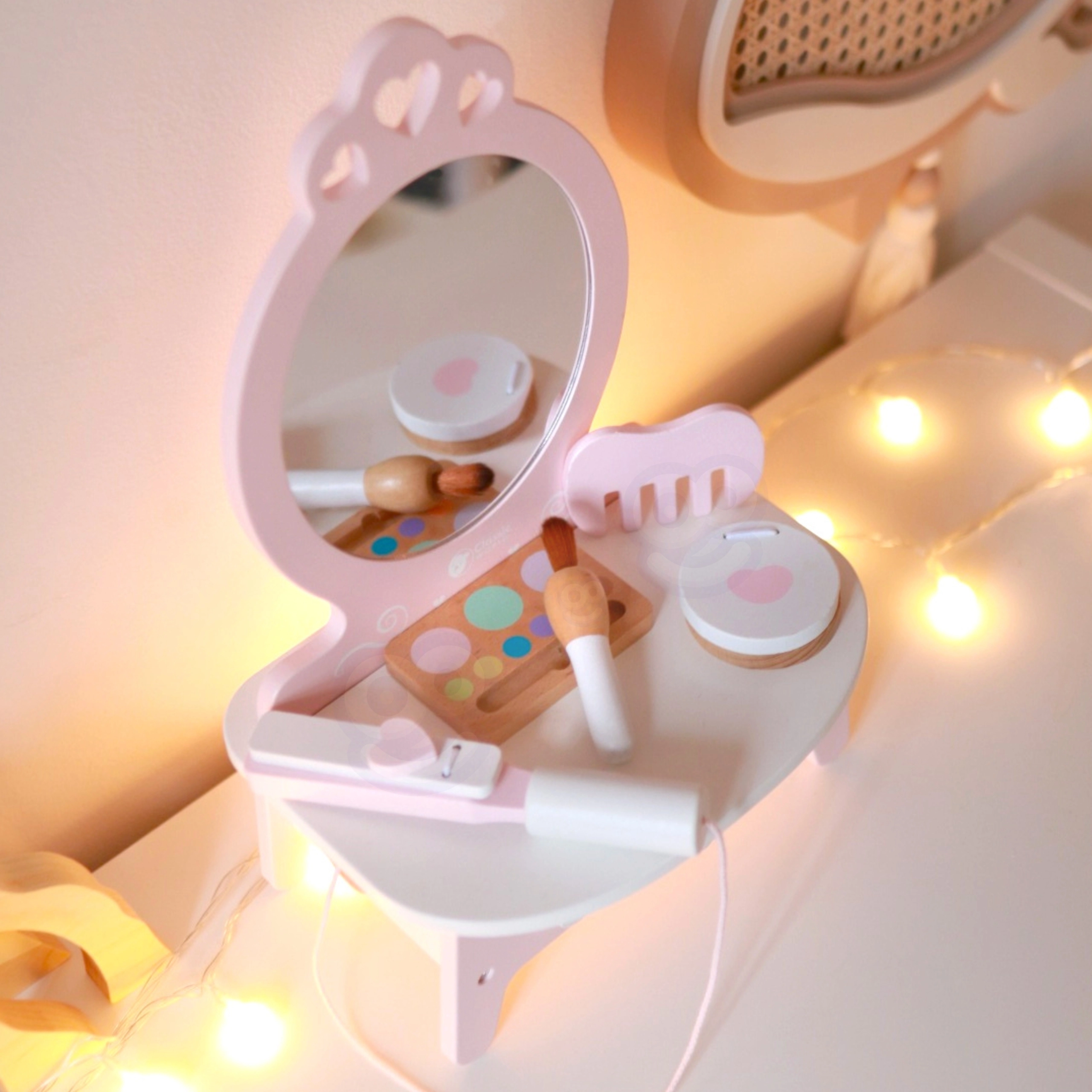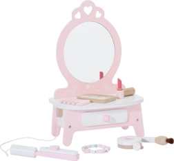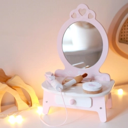Αυτή η όμορφη παιδική τουαλέτα σε ροζ χρώμα είναι εξοπλισμένη με καθρέφτη και 11 διαφορετικά αξεσουάρ, που περιλαμβάνουν χτένα, κραγιόν, ισιωτική μαλλιών, πουδριέρα και άλλα. Όλα τα αξεσουάρ είναι κατασκευασμένα από ποιοτικό ξύλο και ο σχεδιασμός τους σε παστέλ χρώματα προσδίδει στο παιχνίδι μαγική εμφάνιση. Η τουαλέτα προσφέρει άφθονο αποθηκευτικό χώρο για όλα τα μυστικά καλλυντικά κόλπα της μικρής σας μοντέλου.