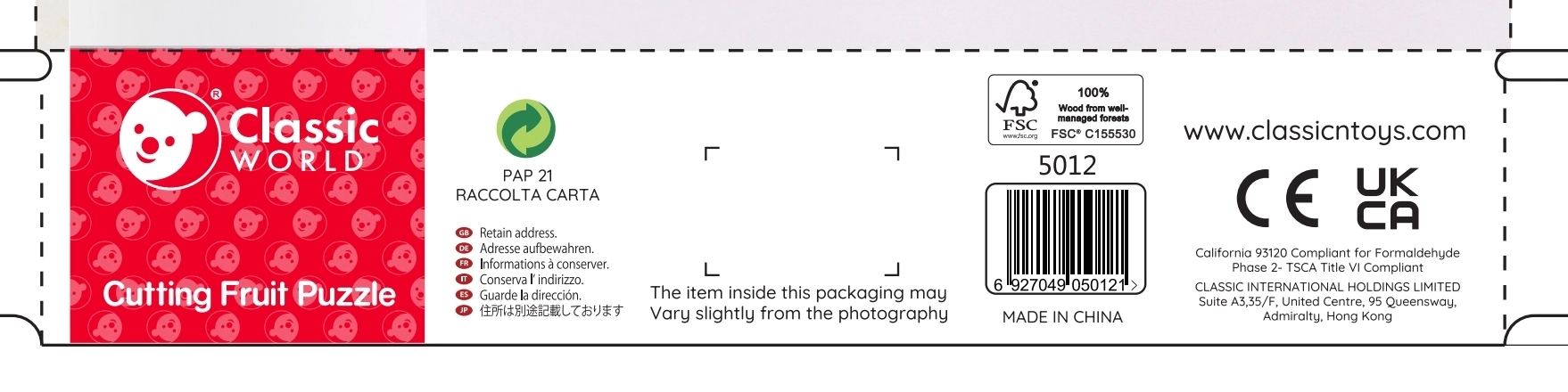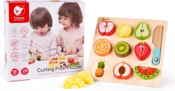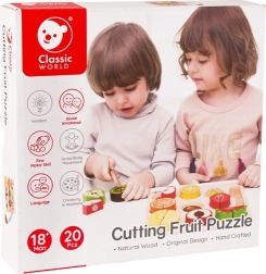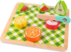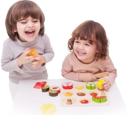 Το σετ περιλαμβάνει 20 τεμάχια συμπεριλαμβανομένης διπλής όψης σανίδας, μαχαιριού και διάφορων φρούτων. Αυτό το ασφαλές παιχνίδι για παιδιά από 18 μηνών είναι φτιαγμένο από λακαρισμένο ξύλο και βαμμένο με μη τοξικά χρώματα, διασφαλίζοντας ότι είναι απολύτως ασφαλές για χρήση.
