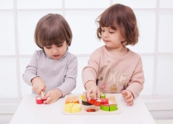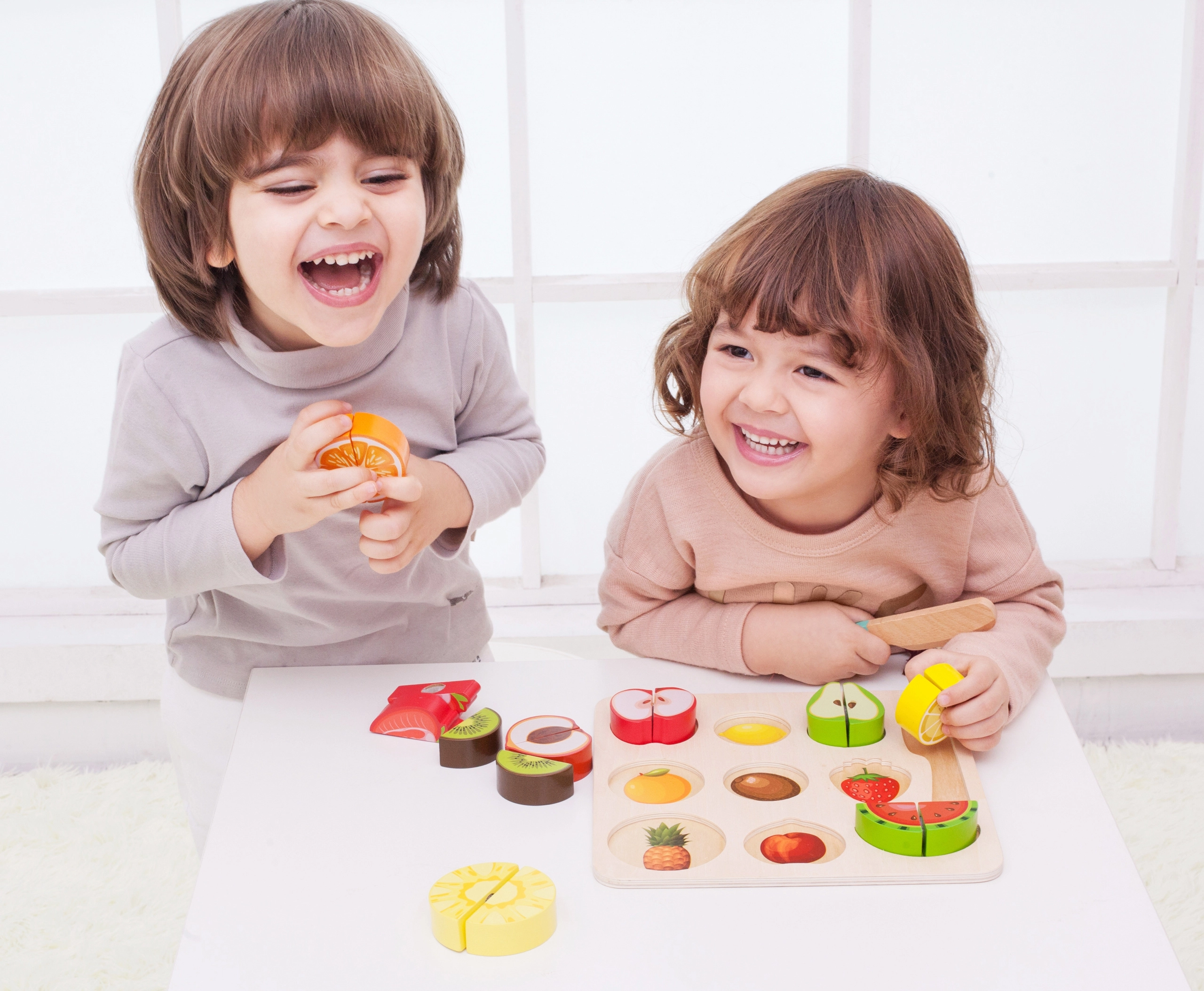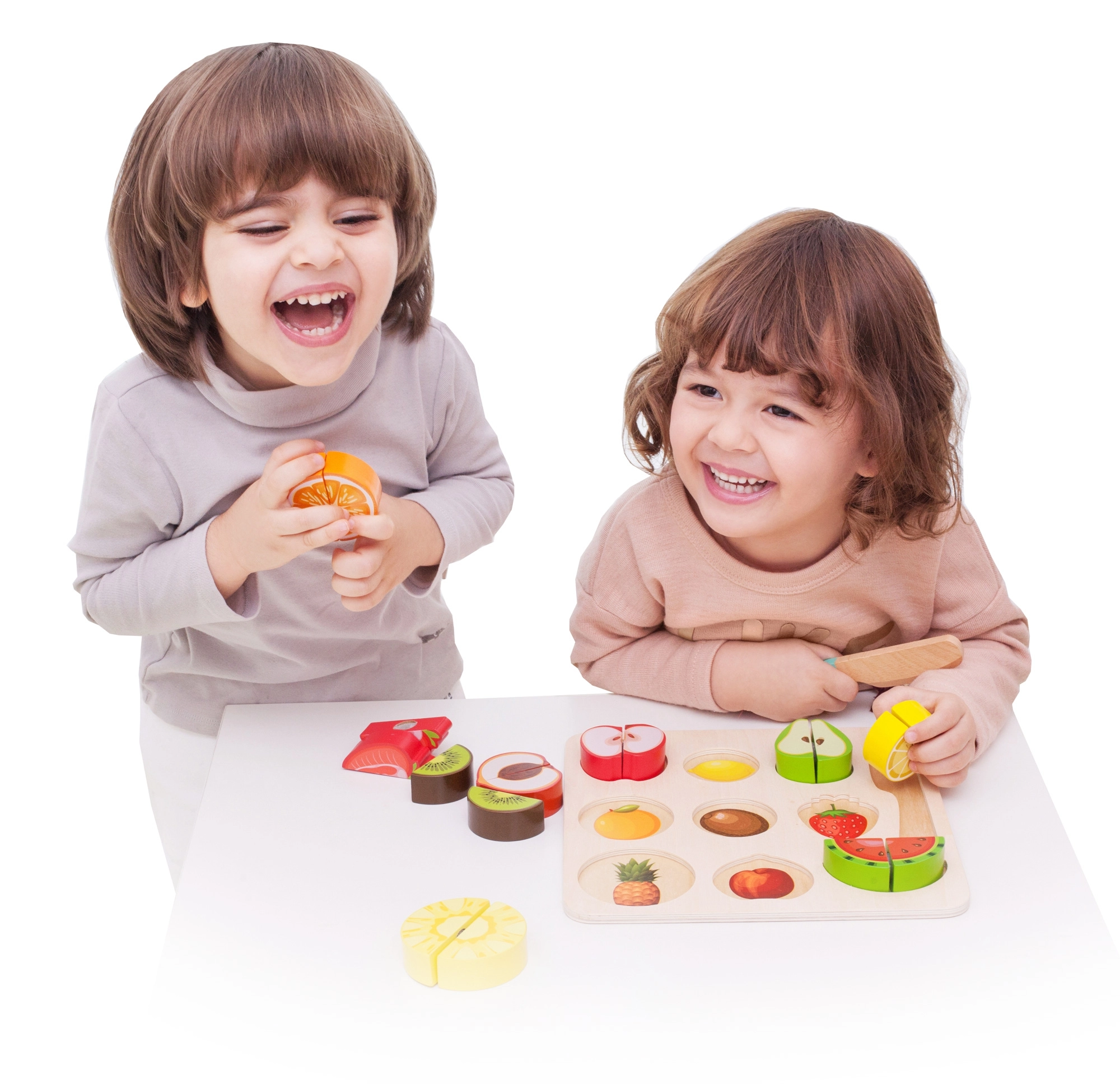 Τα παιδιά βελτιώνουν τις κινητικές τους δεξιότητες συναρμολογώντας και κόβοντας τα φρούτα με το ξύλινο μαχαίρι.