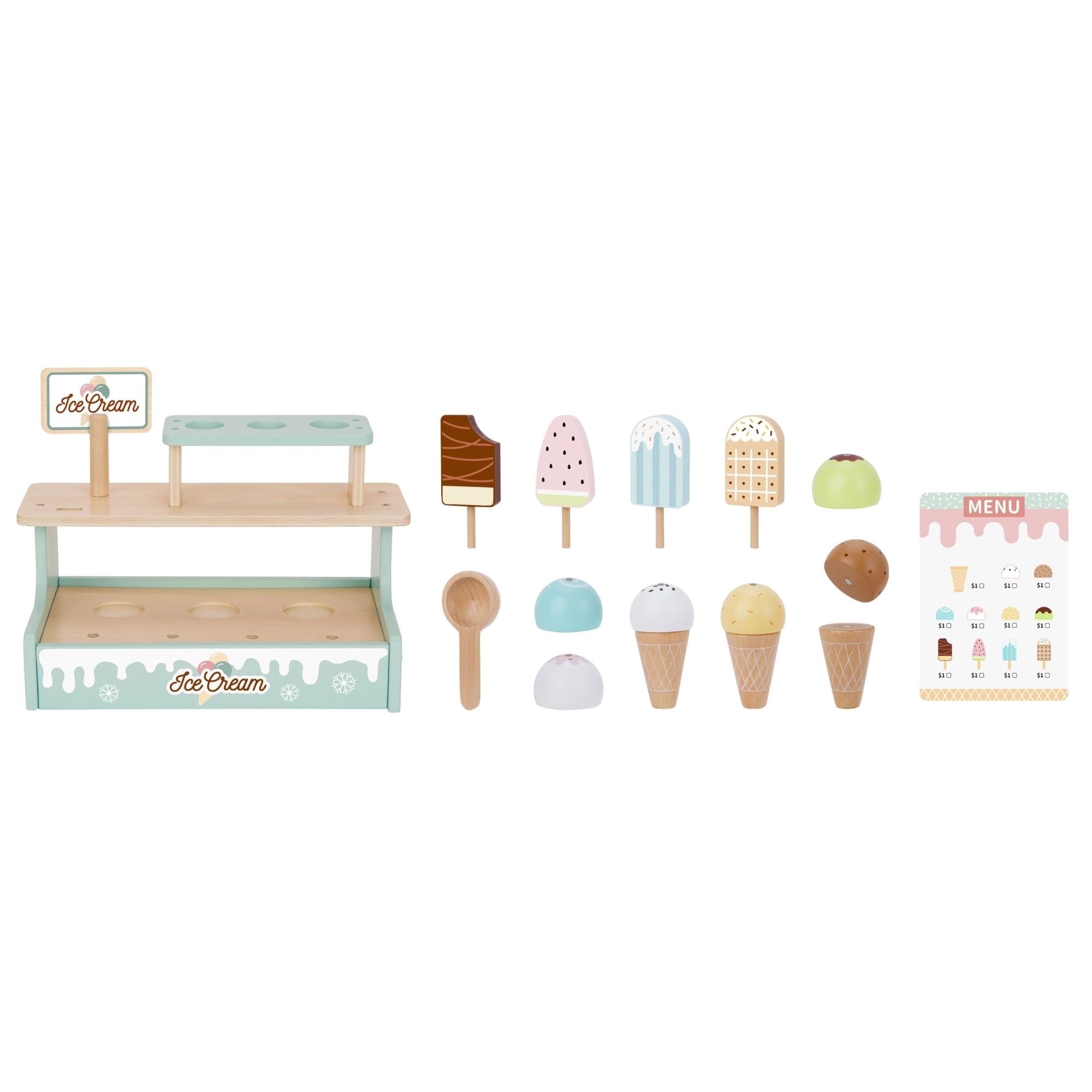 - Περιεχόμενα συσκευασίας: ξύλινη βάση, 4 παγωτίνια, 3 χωνάκια, 6 μαγνητικές μπάλες, σέσουλα, μενού.