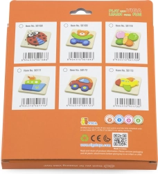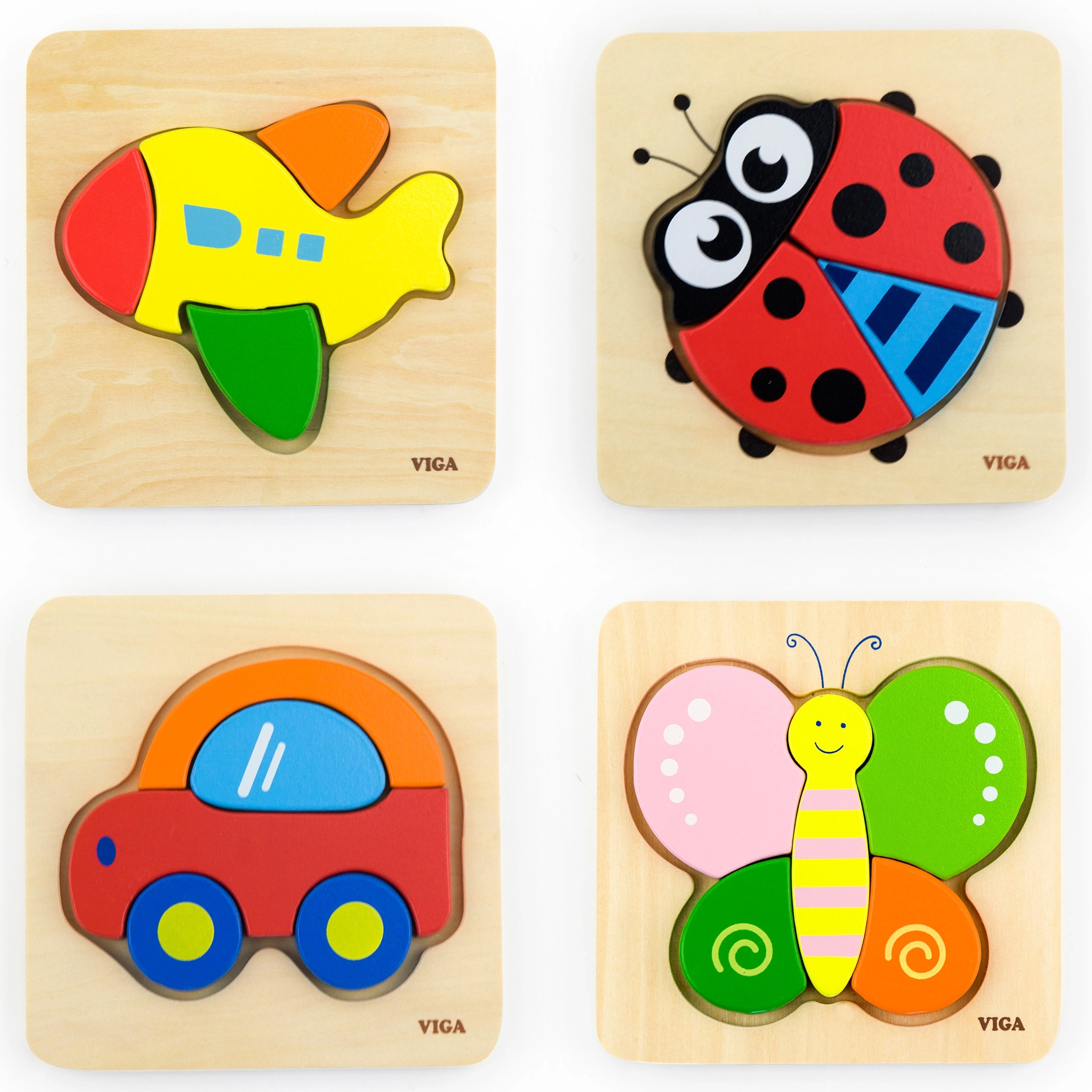 Κάθε παζλ έχει διαφορετικό σχήμα - αεροπλάνο, πασχαλίτσα, αυτοκίνητο και πεταλούδα - ενισχύοντας τον συντονισμό και τις γνωστικές ικανότητες.