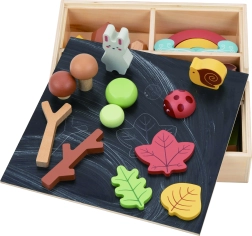 Το σετ αποθηκεύεται σε πρακτικό ξύλινο κουτί, του οποίου η πίσω πλευρά του καπακιού είναι διαμορφωμένη ως πίνακας για κιμωλίες.