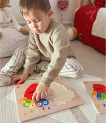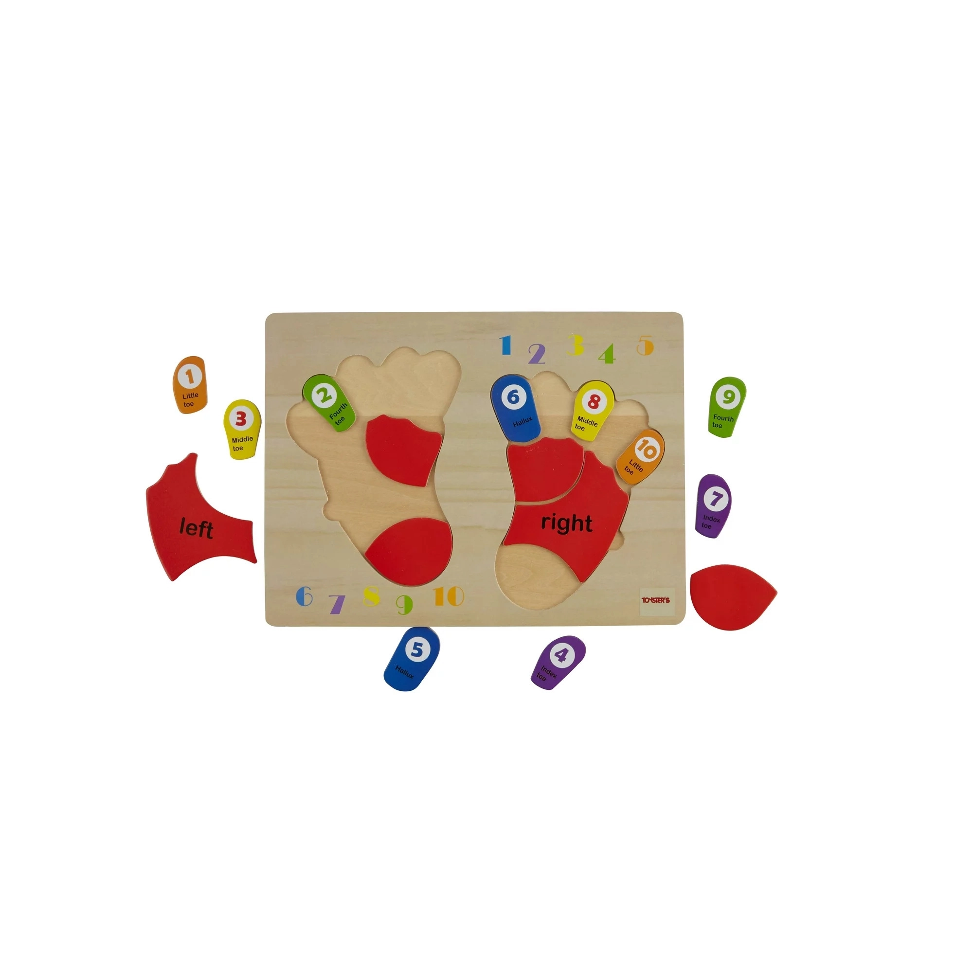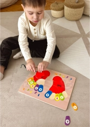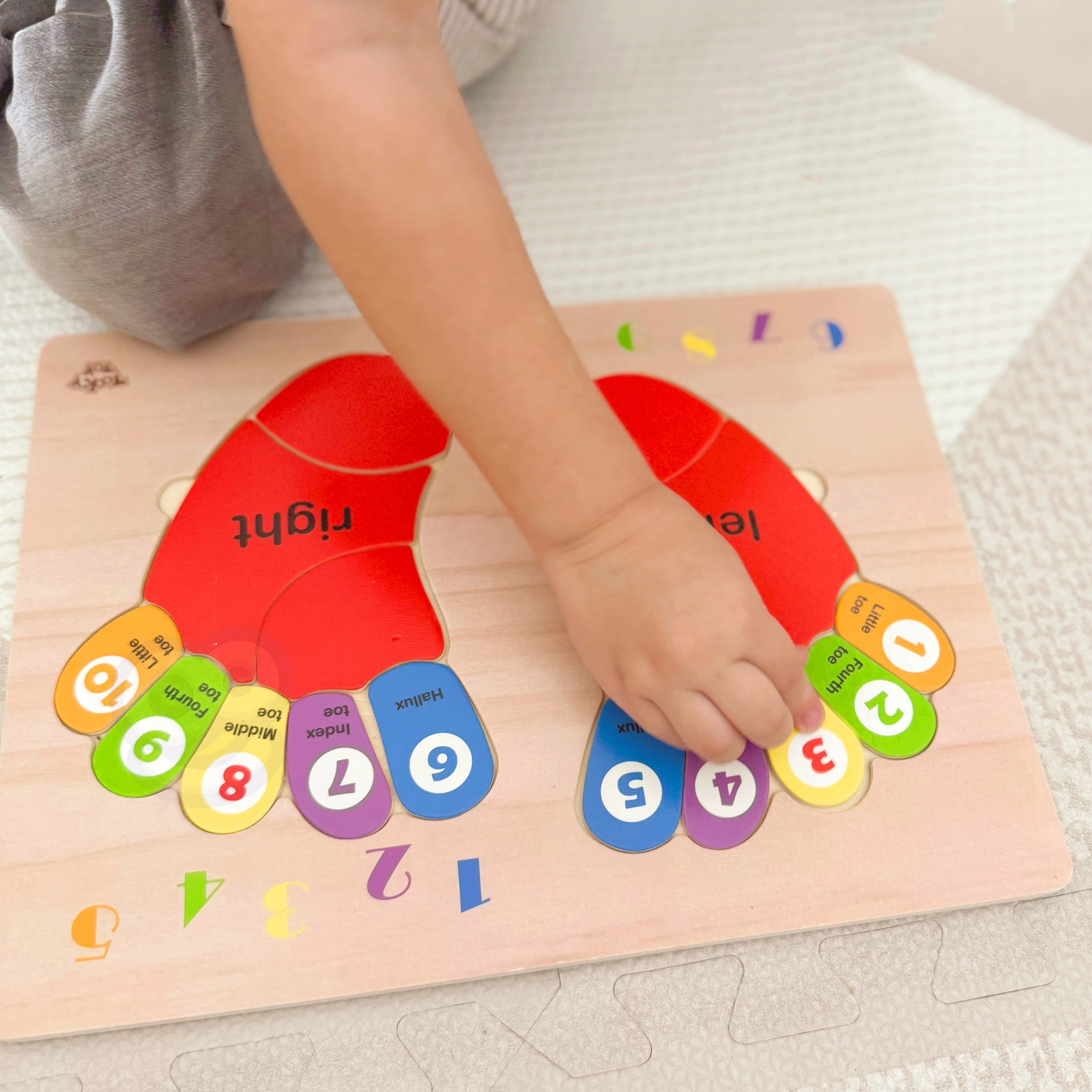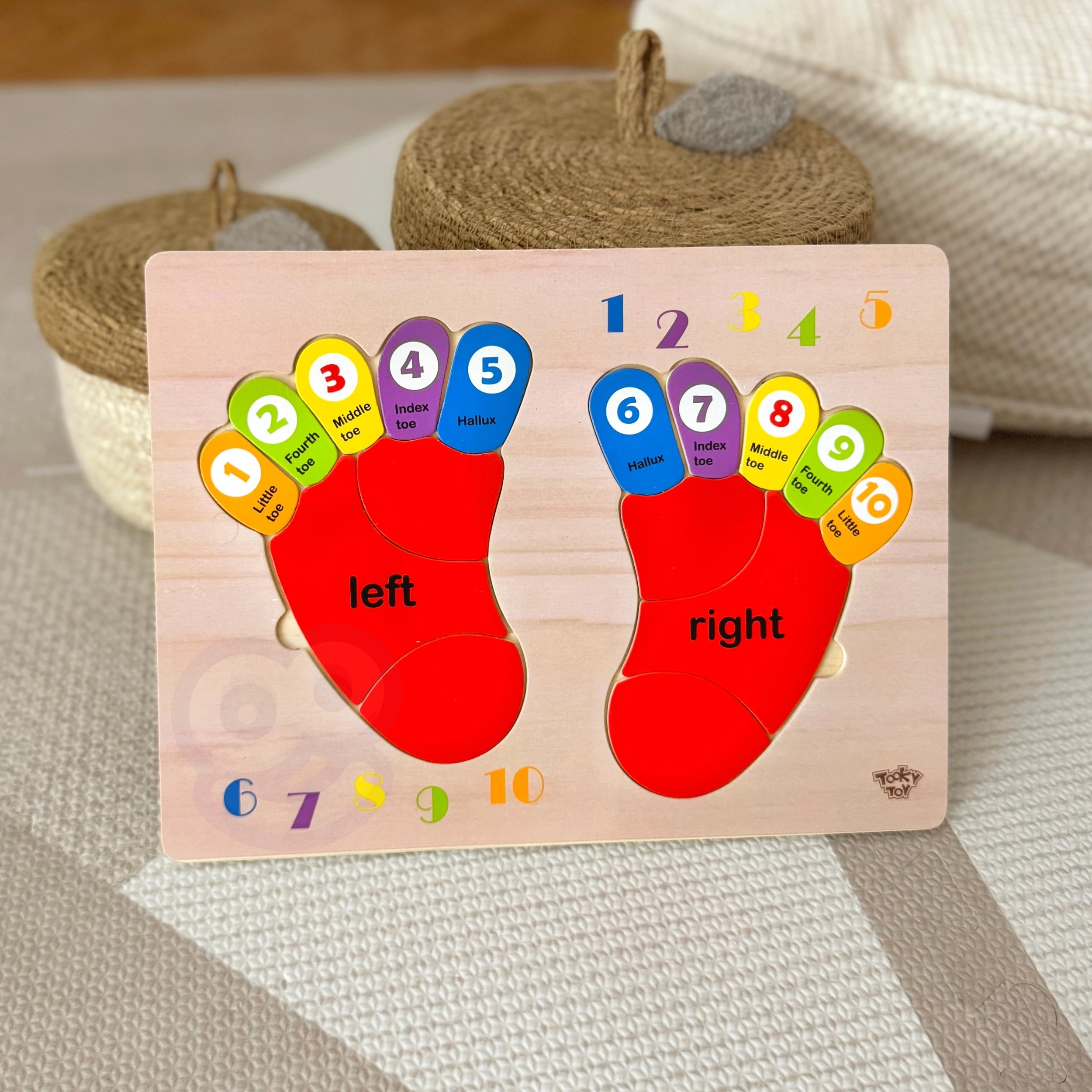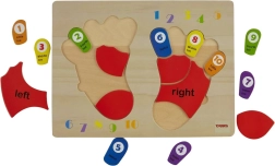 Το ξύλινο παζλ της μάρκας TOOKY TOY είναι ένα ιδανικό βοήθημα για τα παιδιά στα πρώτα τους βήματα στον κόσμο των μαθηματικών. Η σανίδα και όλα τα στοιχεία της είναι κατασκευασμένα από υψηλής ποιότητας ξύλο και είναι άριστα προσαρμοσμένα στο μέγεθος των παιδικών δαχτύλων. Τα έγχρωμα αποτυπώματα είναι σημειωμένα με πλευρές: αριστερά και δεξιά, και σε κάθε δάχτυλο αντιστοιχεί ένας αριθμός, κάτι που βοηθά τα παιδιά να μεταφέρουν τη γνώση στη μέτρηση με τα δικά τους δάχτυλα.