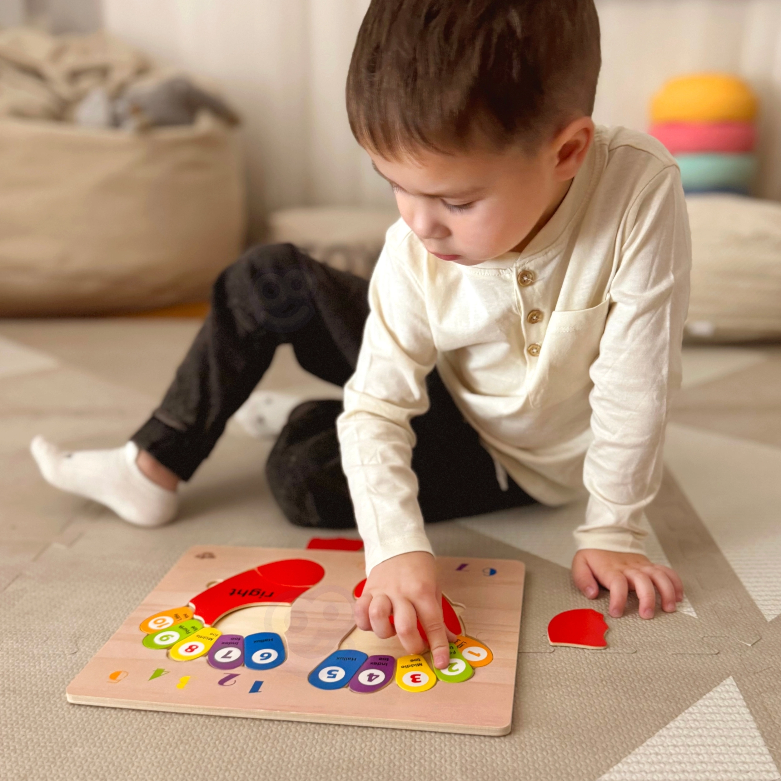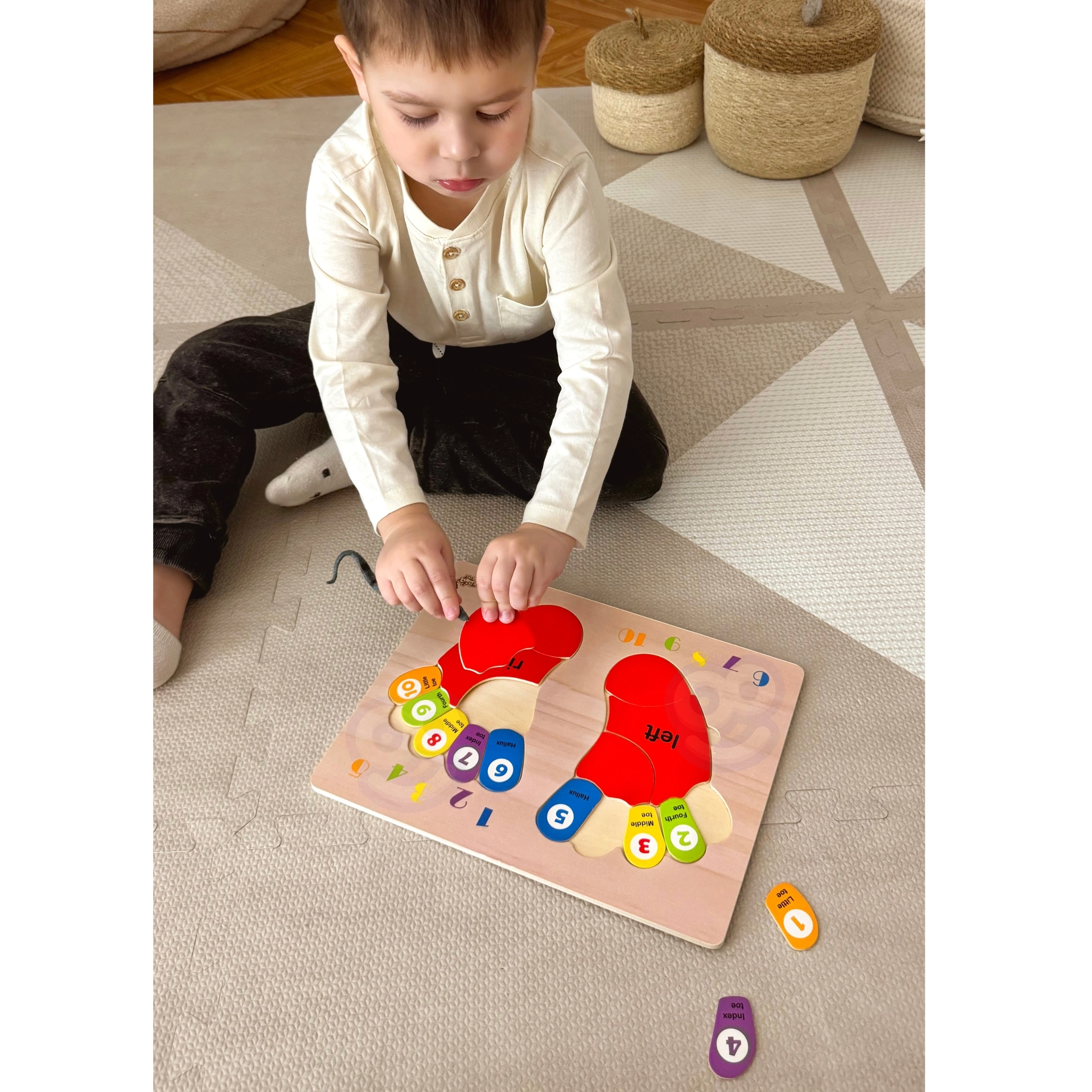 Το παιχνίδι υποστηρίζει τη λεπτή κινητικότητα και τη γνωστική μάθηση χάρη στα χρωματιστά, αποσπώμενα κομμάτια σε σχήμα δαχτύλων.