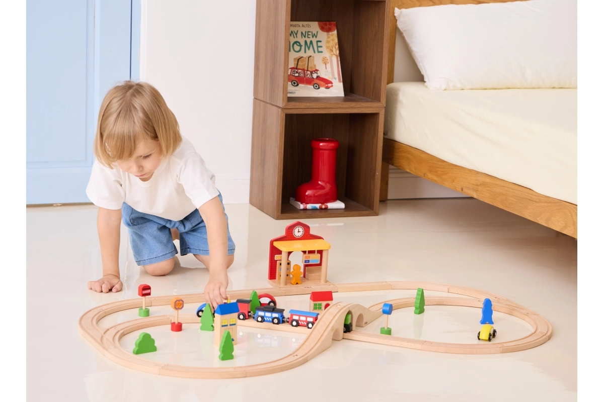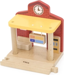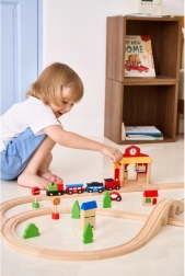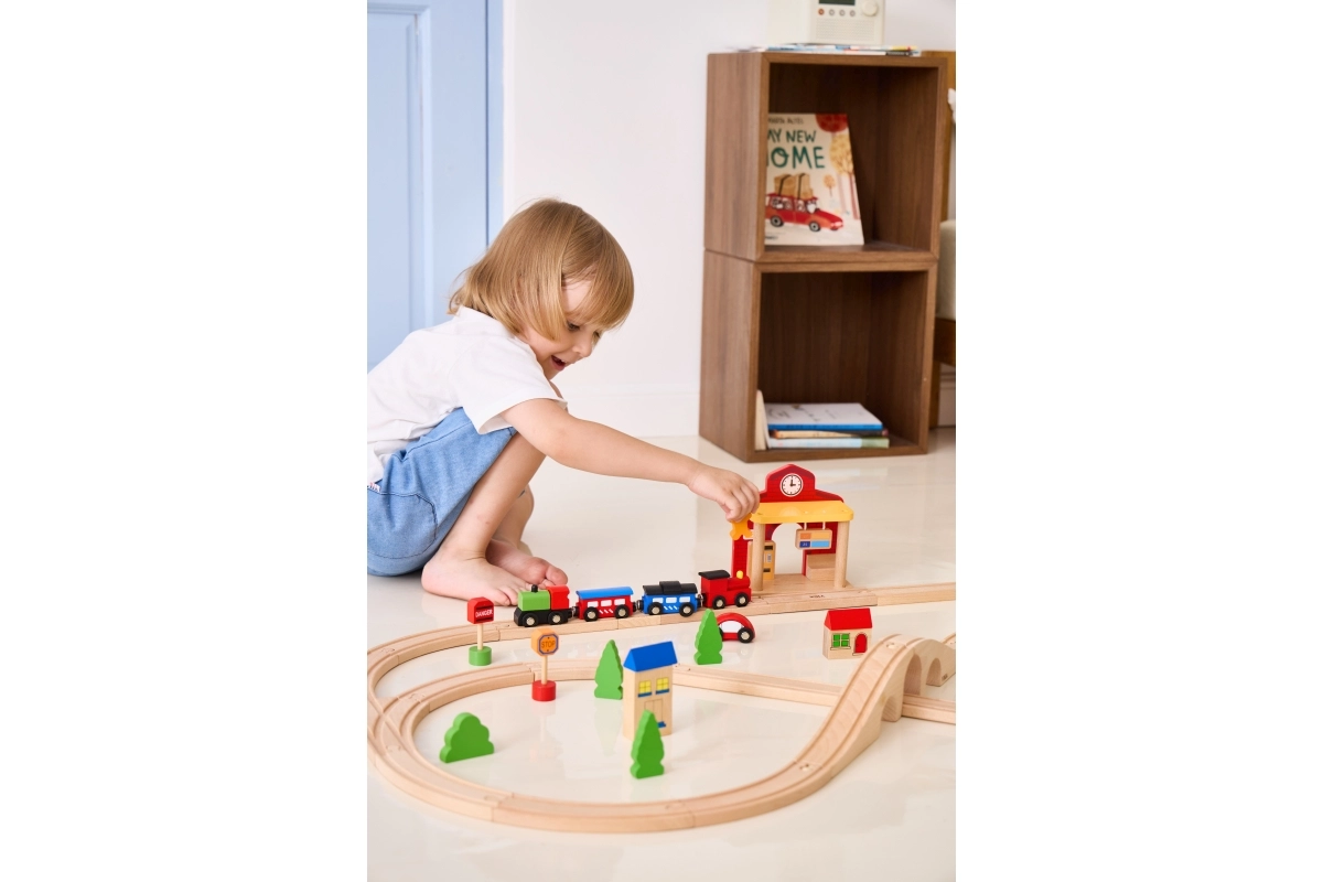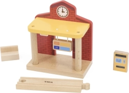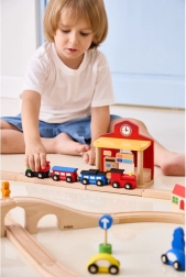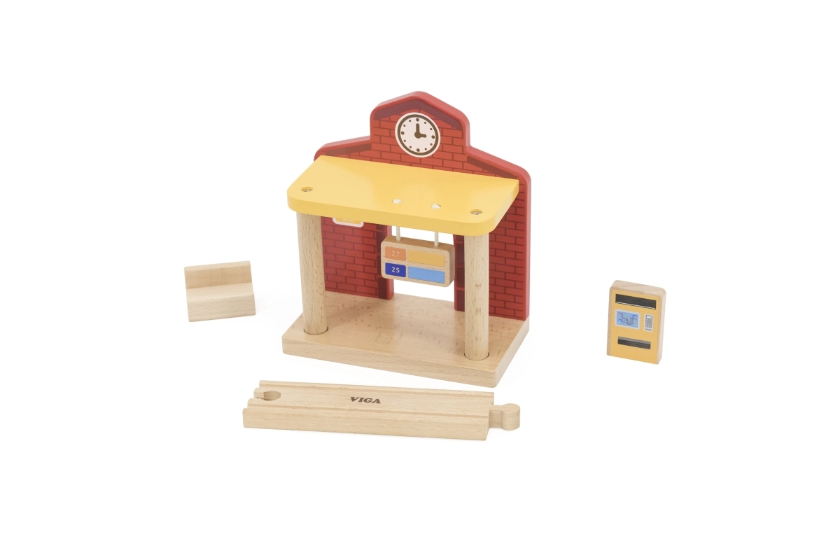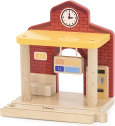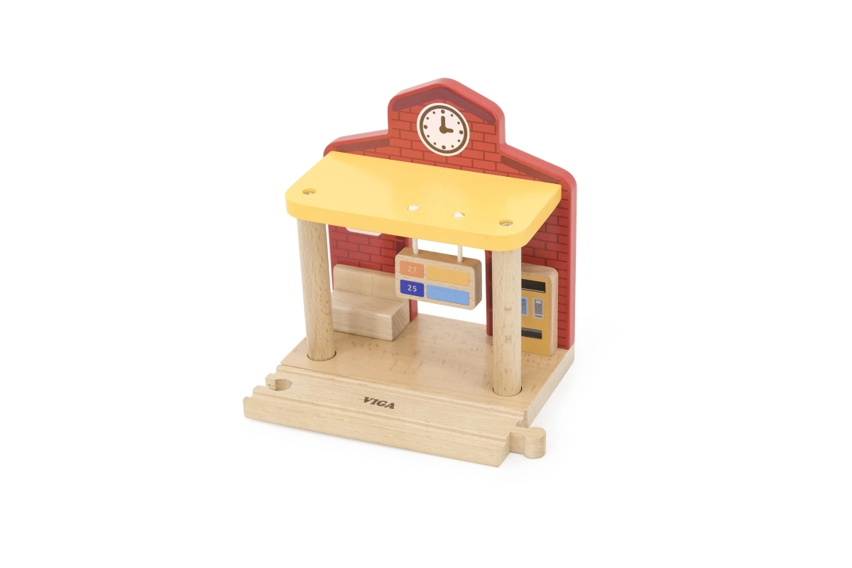 Ο σταθμός είναι ιδανικός για παιδικές σκηνές – από την πώληση εισιτηρίων μέχρι τις αφίξεις και τις αναχωρήσεις των τρένων. Οι διαστάσεις είναι σχεδιασμένες ώστε να χωρούν εύκολα στις περισσότερες επιφάνειες παιχνιδιού και να είναι συμβατές με τυπικές ξύλινες ράγες. Το παιχνίδι υποστηρίζει τη λεπτή κινητικότητα, τον συντονισμό χεριού–ματιού και τις κοινωνικές δεξιότητες.