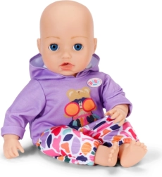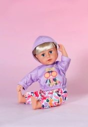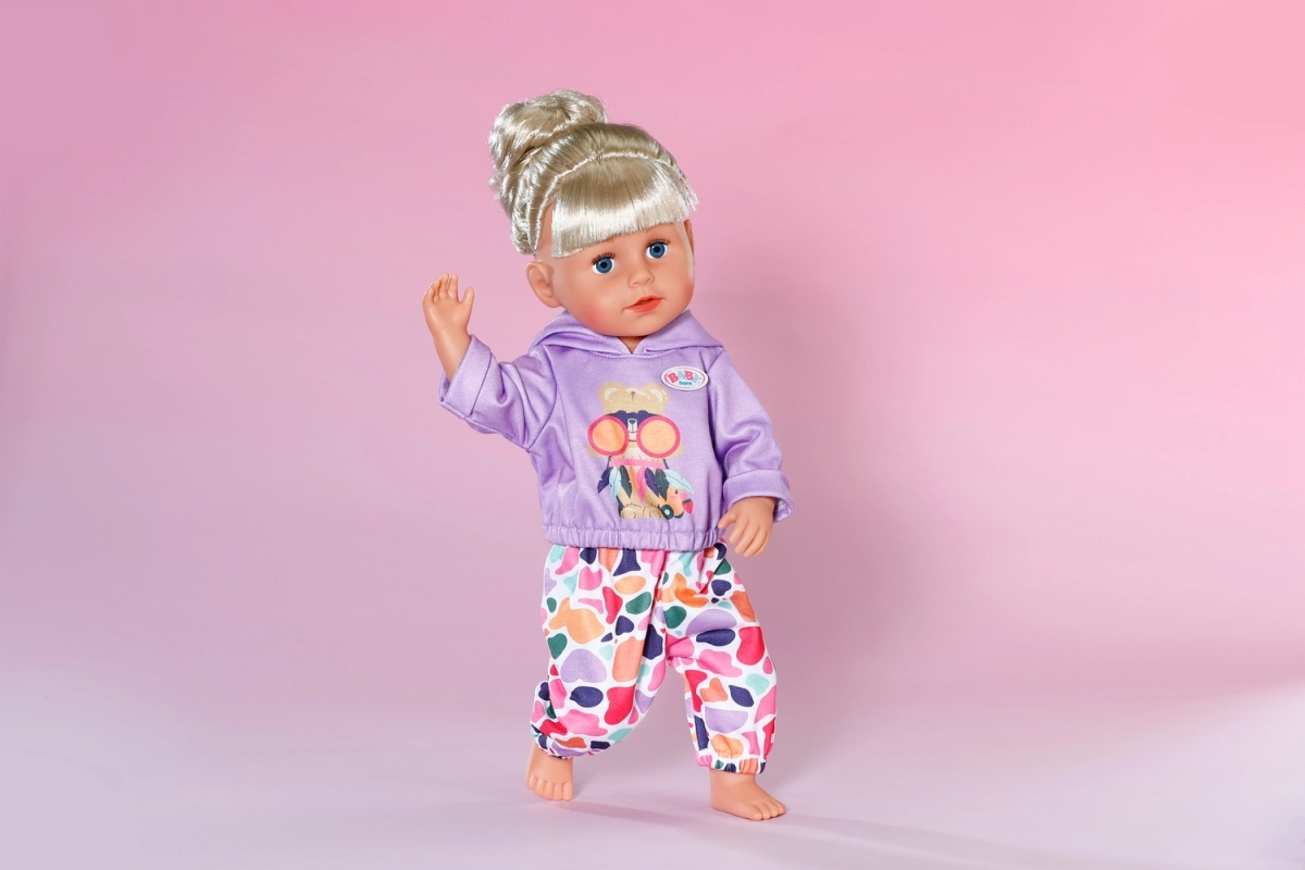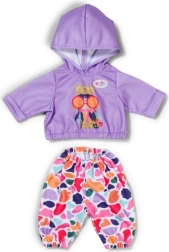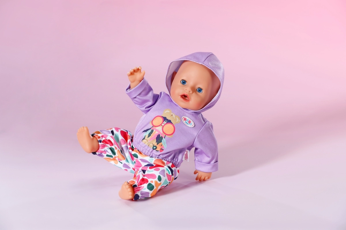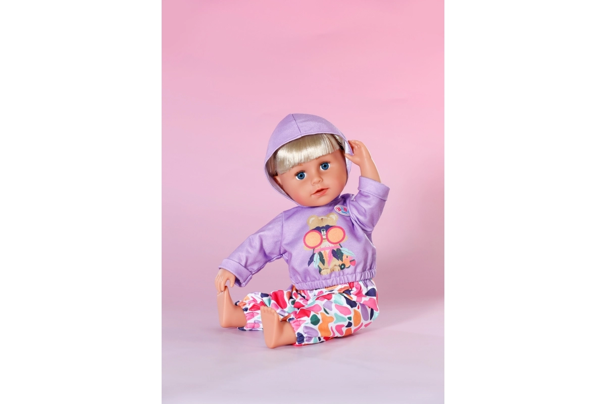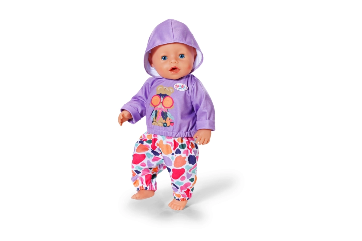 Στυλάτο σετ για κούκλες μεγέθους 43 cm: μωβ φούτερ με κουκούλα και χαρούμενο σχέδιο ταιριάζει με πολύχρωμο παντελόνι για παιχνιδιάρικους συνδυασμούς. Περιλαμβάνεται και κρεμάστρα από ανακυκλωμένο υλικό. Το ρουχαλάκι ενισχύει τη δημιουργική φαντασία, είναι εύκολο στο ντύσιμο και ταιριάζει άψογα και στο BABY born Teddy.