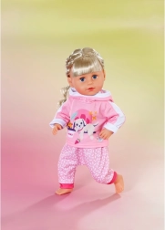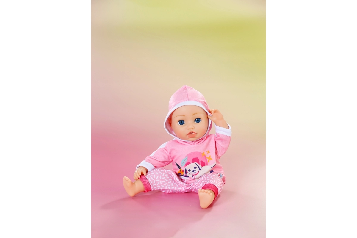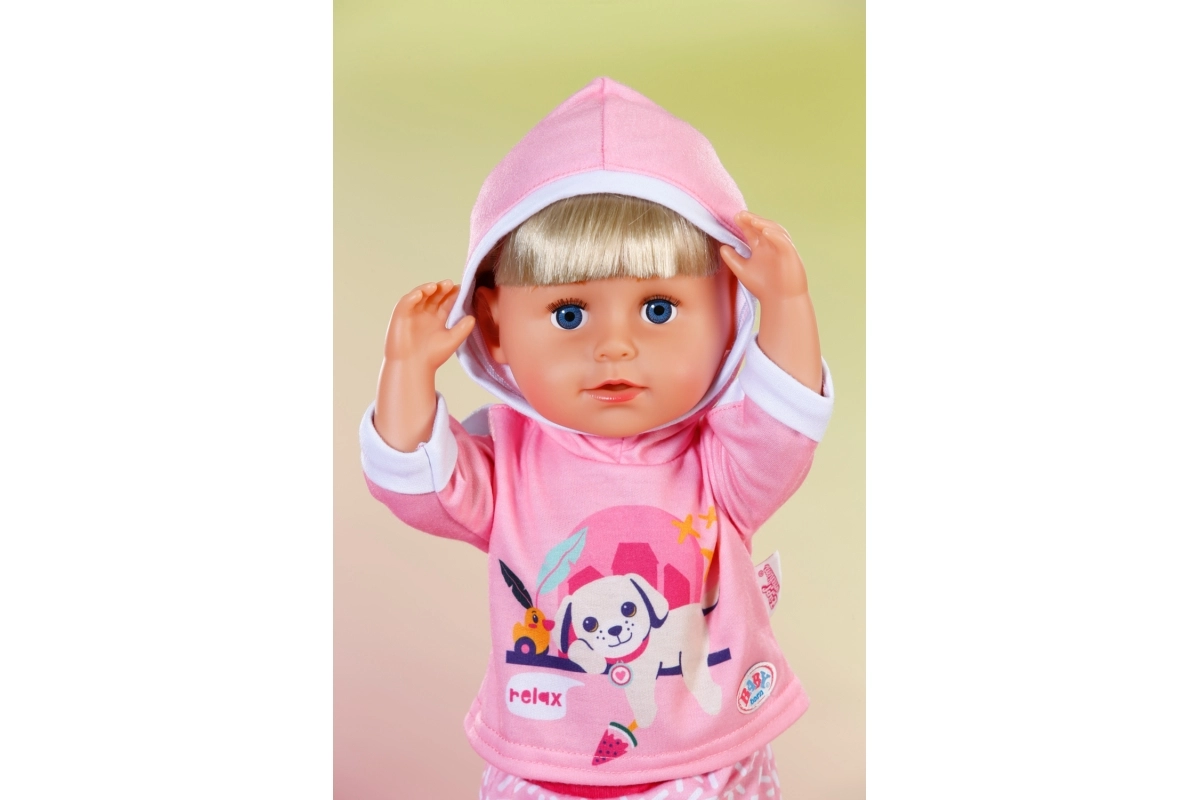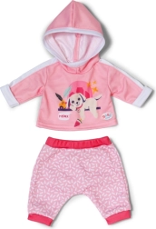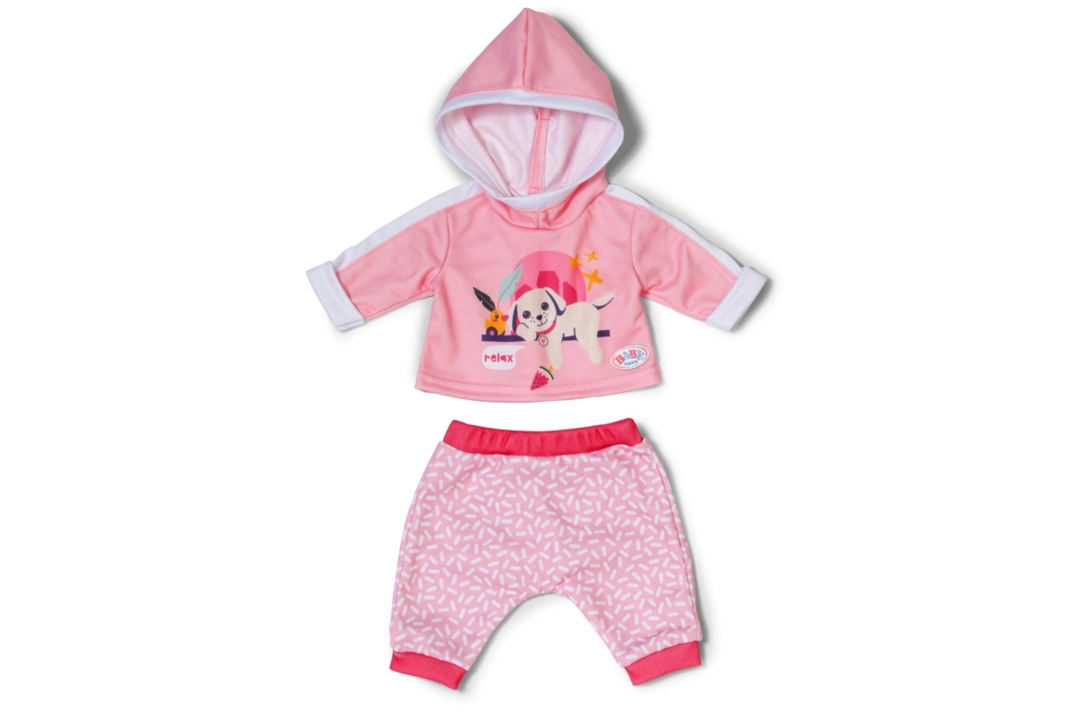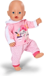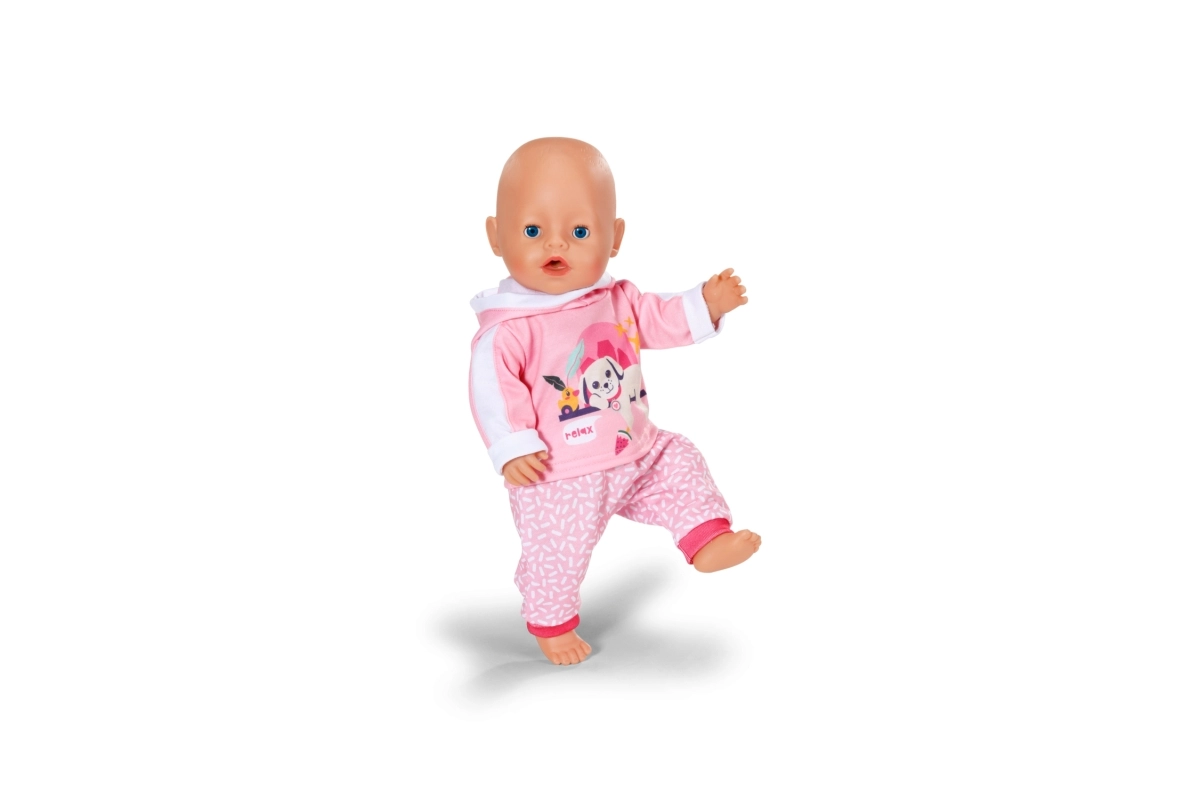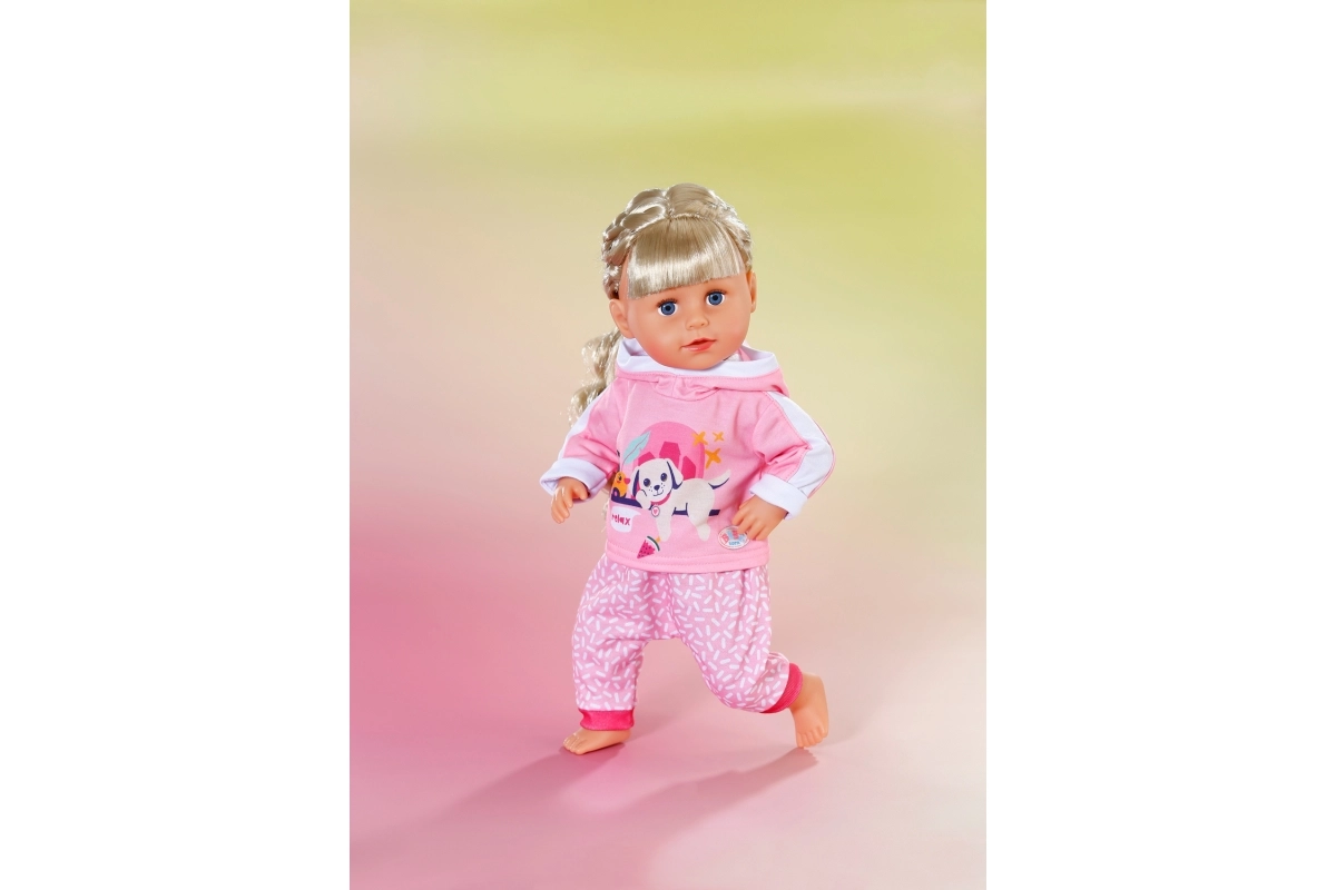 Αυτή η ροζ φόρμα είναι το τέλειο συμπλήρωμα της γκαρνταρόμπας για κούκλες BABY born 43 cm αλλά και για τα αρκουδάκια BABY born Teddy. Η ζακέτα με τη χαριτωμένη στάμπα του ξεκούραστου σκυλιού και το άνετο παντελόνι με απαλό μοτίβο εξασφαλίζουν άνεση σε κάθε περιπέτεια. Χάρη στον προσεγμένο σχεδιασμό, το ντύσιμο και το ξεγύμνωμα γίνονται πολύ εύκολα.