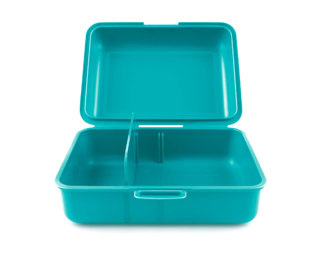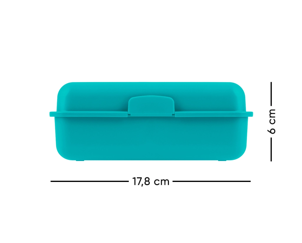 Τιρκουάζ πλαστικό κουτί με διαστάσεις 17,8 cm x 12,2 cm, κατάλληλο για μεταφορά τροφίμων.