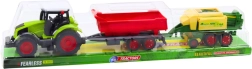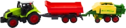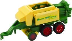Το τρακτέρ, το ρυμουλκούμενο και η πρέσα συνθέτουν ένα ολοκληρωμένο σετ, με το οποίο τα παιδιά μιμούνται εύκολα τη δουλειά στο χωράφι – από τη συλλογή έως τη μεταφορά των δεμάτων σανού.