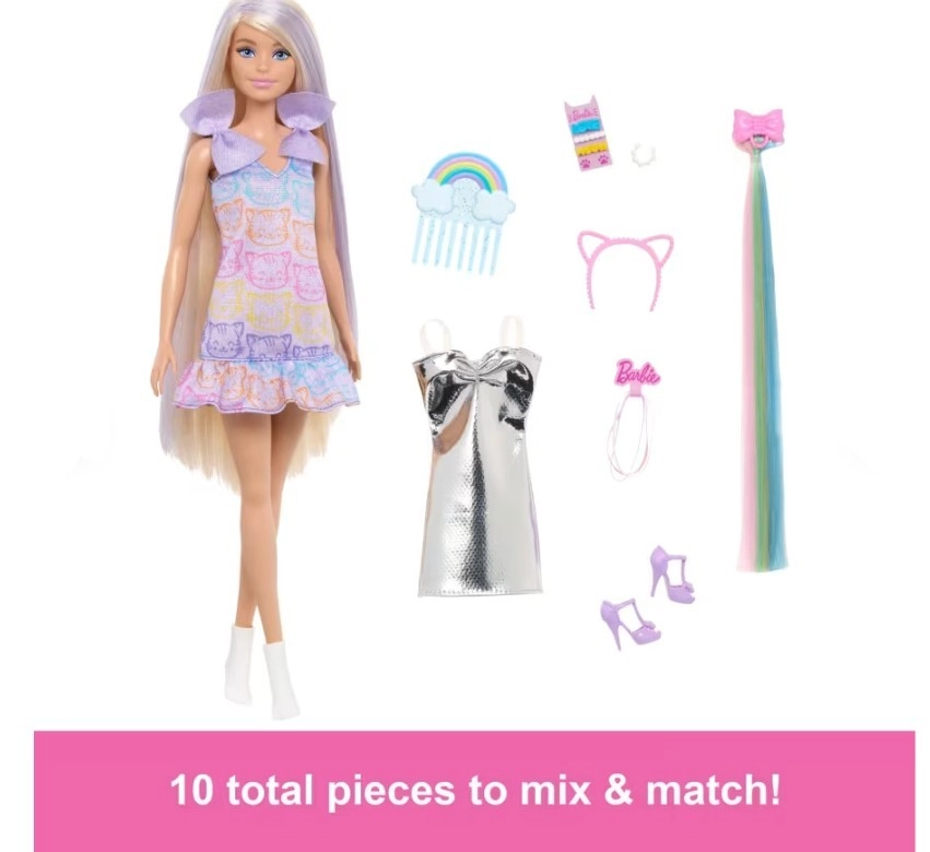 Η κούκλα Barbie Διασκέδαση με Μαλλιά φέρνει χαρά με μοδάτα πειράματα και δημιουργία χτενισμάτων με χαρούμενα χρώματα. Γίνετε στυλίστας και ανακαλύψτε διαφορετικά στυλ με αυτή τη γοητευτική κούκλα!