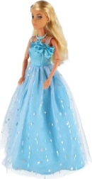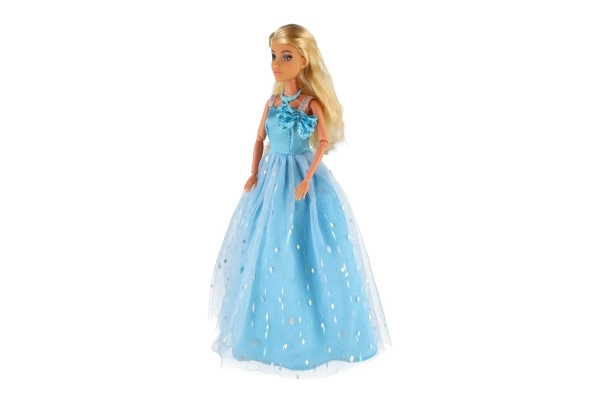 Η κούκλα φοράει μακρύ μπλε φόρεμα με διακριτικό μοτίβο και λαμπερές λεπτομέρειες που εντυπωσιάζουν με την πρώτη ματιά.