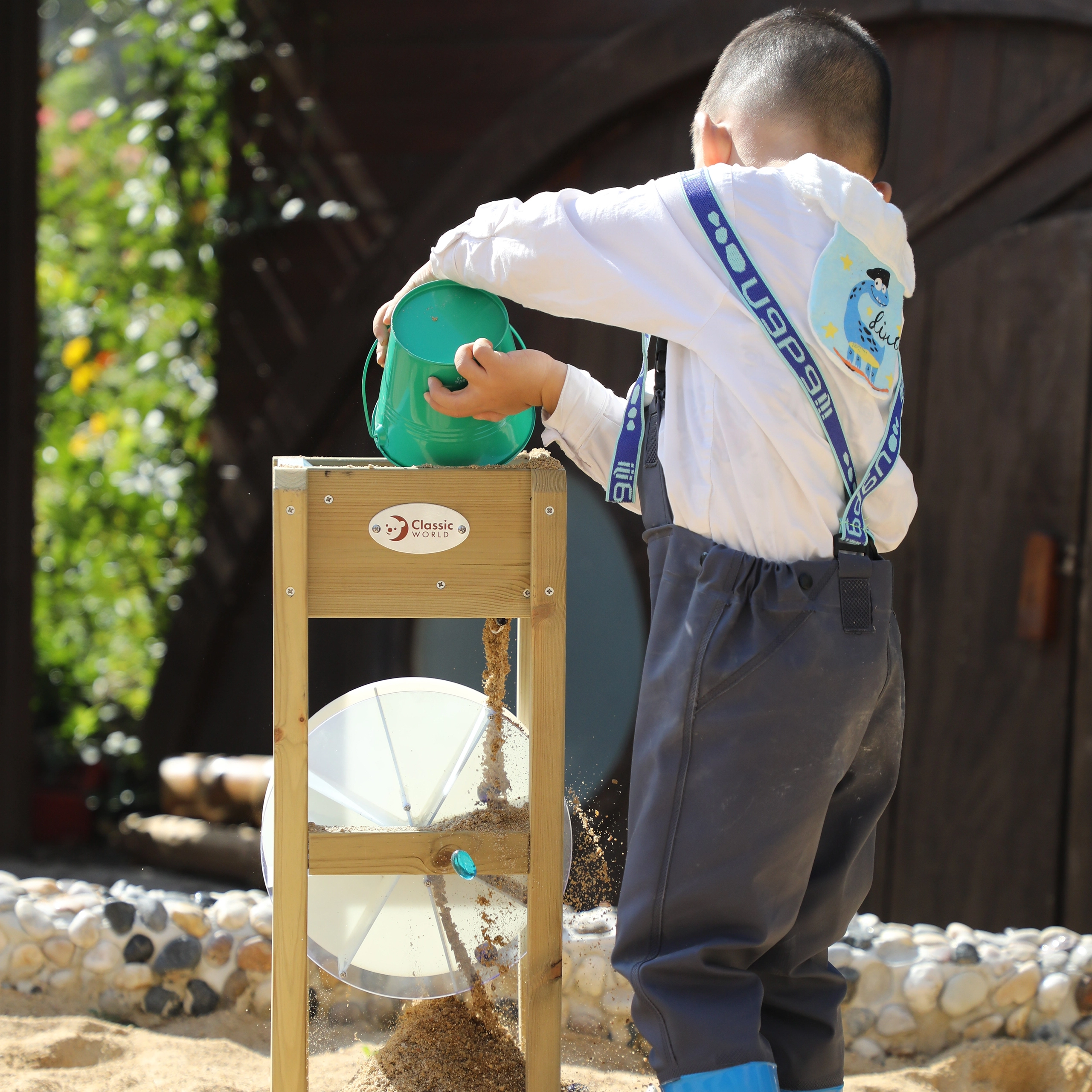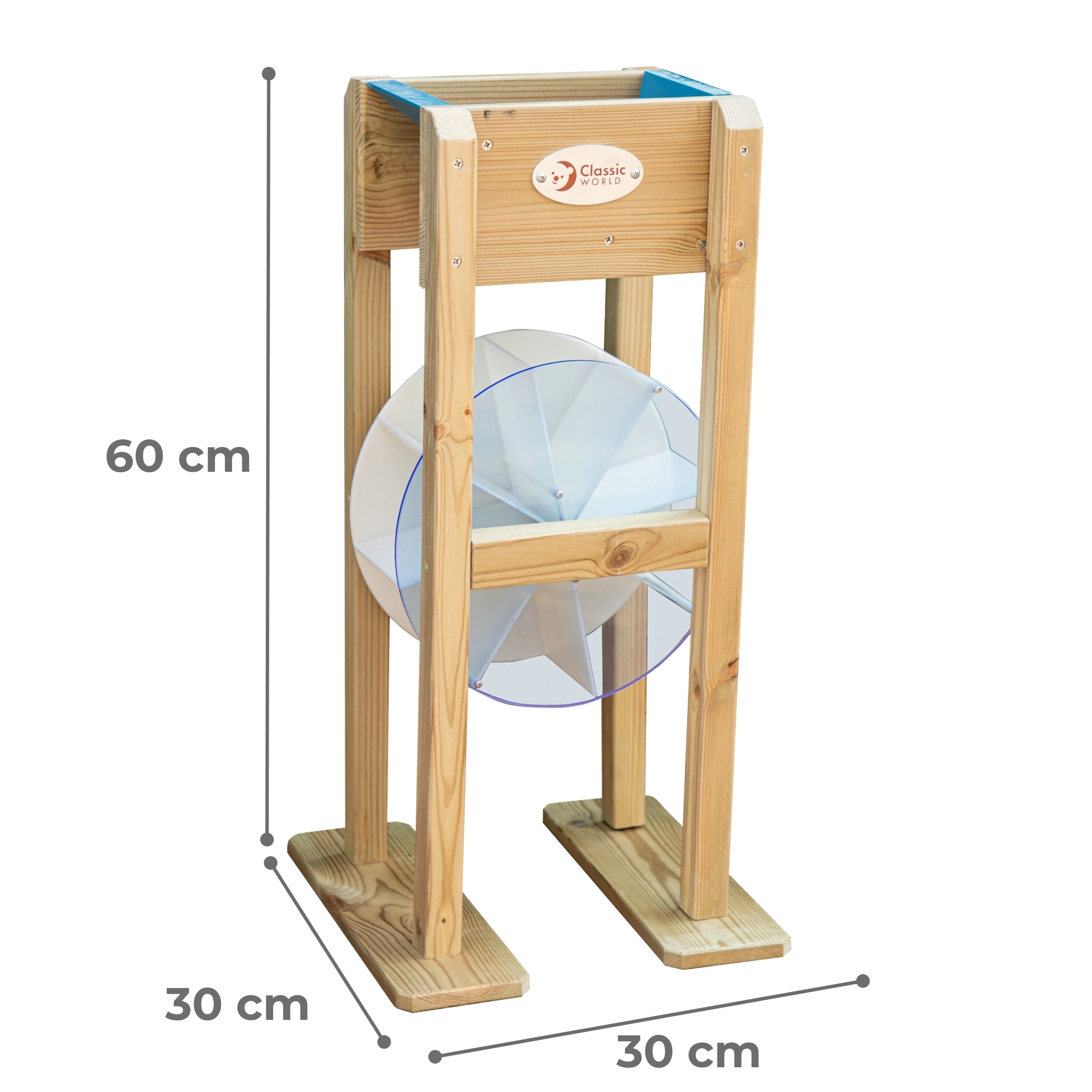 Ο ξύλινος μύλος CLASSIC WORLD EDU είναι μια εξαιρετική προσθήκη σε κάθε αμμοδόχο και υδάτινη γωνιά στον κήπο. Τα παιδιά κατακτούν εύκολα τις αρχές της ροής και της περιστροφής του τροχού – αρκεί να ρίξουν άμμο ή νερό και να δουν τον μπλε τροχό να γυρίζει. Χάρη στα στιβαρά ξύλινα πλαϊνά και τη σταθερή βάση, ο μύλος είναι έτοιμος για καθημερινά παιδικά πειράματα.